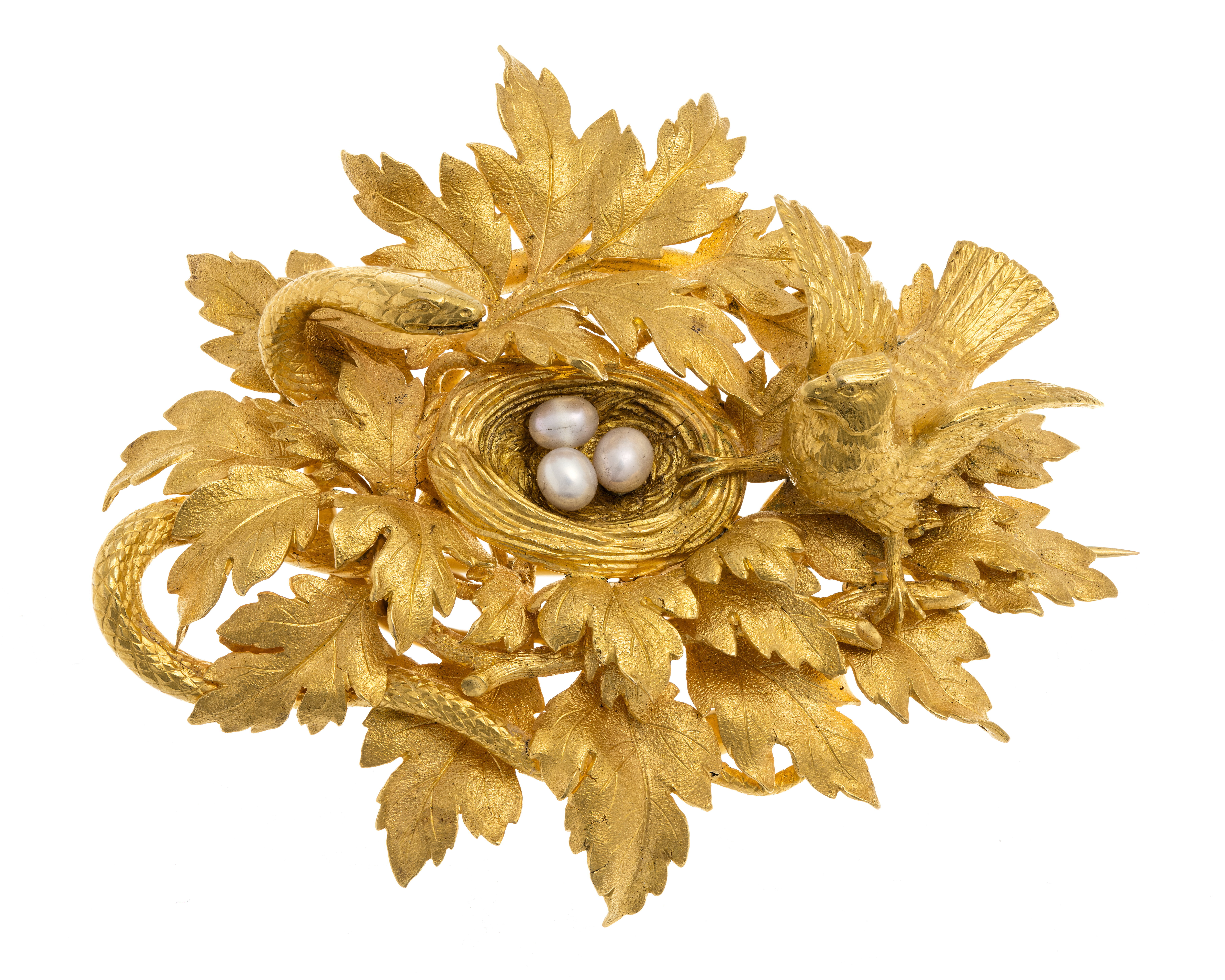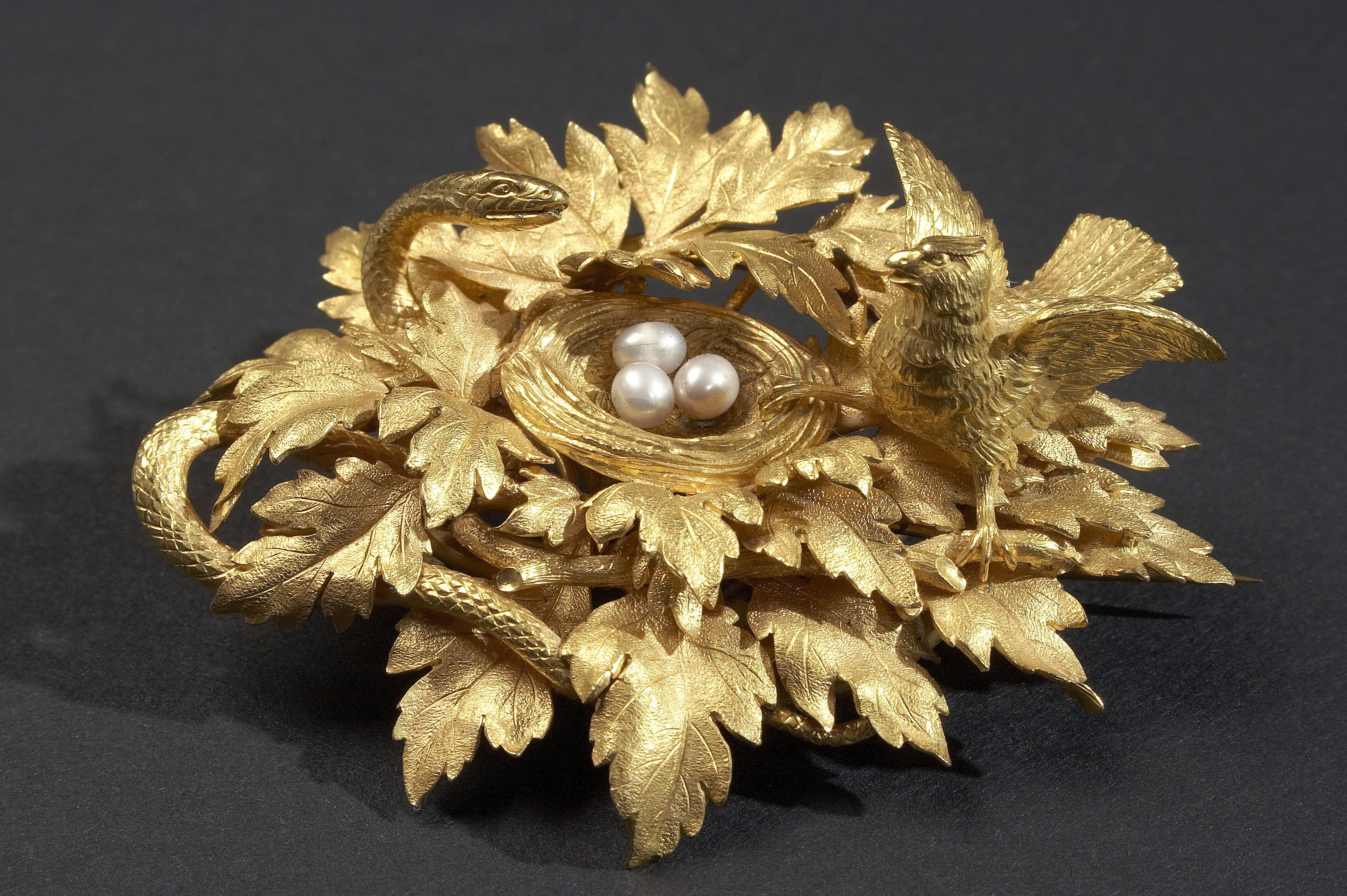 BROSCH Av svenskt guld med svenska pärlor. Liggande avlång. I form av ett fågelbo på en kvist med rikt löfverk av flikiga blad. På baksidan nål och krylle. På huvudgrenens ytterände stämplar. Svenskt arbete Stockholm, från 1866. Inköpt av Wilhelmina von Hallwyl augusti 1903, hos juvelerarfirman J. E. Torsk, Stockholm. Utställd på Allmänna konst- och industriutställningen i Stockholm år 1866.