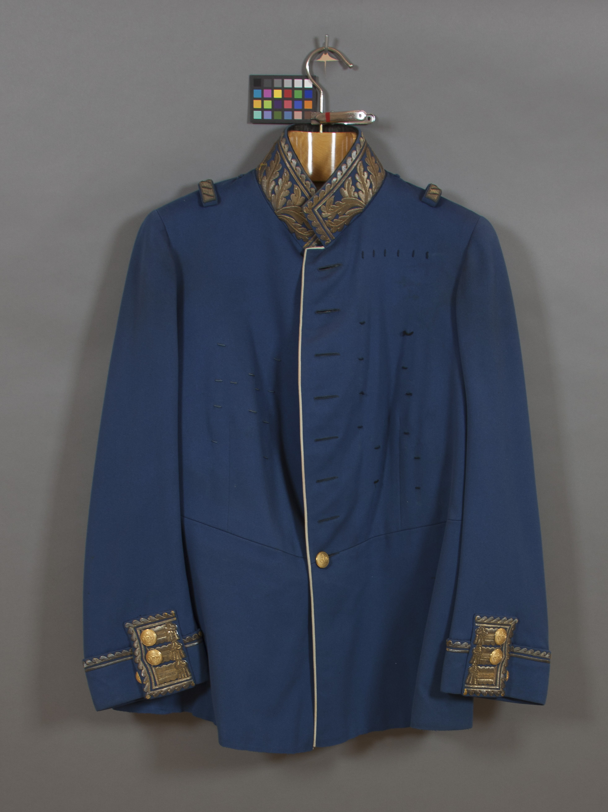 Vapenrock av ljusblått kläde tillskuren med livsöm, enradig knäppning och ståndkrage. Knäppning med åtta knappar, d: 22, av förgylld mässing med reliefornering i form av en krona. På insidan firmamärke: "M. PETTERSON, STOCKHOLM". Mellan knapparna, sammanlagt fem små sidenöverklädda knappar. På vänstra framstycket 18 st tränsar på högra 12 st för bröstdekorationer. Ståndkrage med guldbroderier för generalitet. På axlarna en träns med guldbroderier och en mindre blå träns. Nedtill på ärmarna 77 mm breda uppslag med klaff. Sprund bak, med vardera tre knappar med en krona i relief. Rocken framtill och sprunden baktill med vit passpoal. Foder av vit kyprad bomull. I ärmarna vitt siden. En innerficka med firmamärke: "J.M. JANSON &WALLGREN // KGL. OCH KEJSERL. HOFLEVERANTÖR // 20.7. STOCKHOLM 1911 // Hofstallmästare E.Rosenblad". I midjan spänntampar med stort förnicklat spänne.