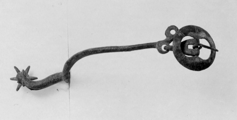 Sporre av stål. U-formade smala nedåtsvängda skänklar med konvex utsida. I vänstra änden två små runda hållare, i den övre av dessa rund sölja __ mm i diameter. I den andra skänkelns ände halvmånformig knapp på hals och liten rund hållare med hake. Rundstavig nedåtböjd hals, 33 mm lång, delvis kluven med sextaggig klinga med mittrosett. Inköpt tillsammans med Gnr. 20:12-25 för kr 15:- från redaktör Melanders samling i Borgholm, genom herr A. Billow.