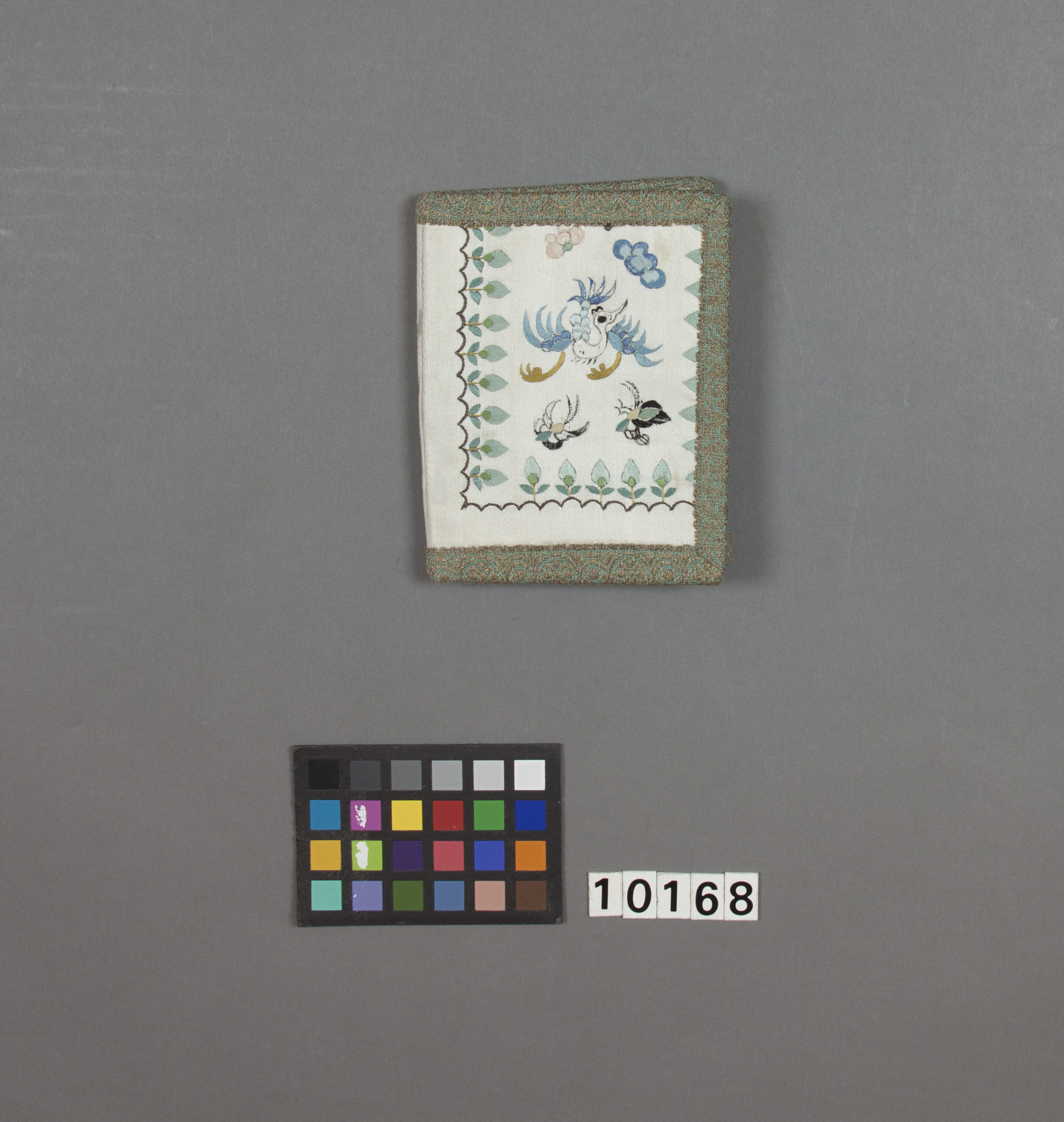 Nåletui i form av en liten bok, på utsidan klätt med vitt siden med broderi av tunt silkegarn iblått, gult, grönt, svart och brunt, i form av en fågel, två insekter och vinkelformig bård av grönablommor. Etuiet kantat med band av lamé i guld och blått. Etuiet fodrat med naturfärgat råsiden med fyra blad av vit flanell med sick-sack-klippta kanter.Flanellen fäst på mitten av en hälla av bårdens tyg. Tillbehör:På flanellen fäst fyra stycken synålar 46 mm långa.