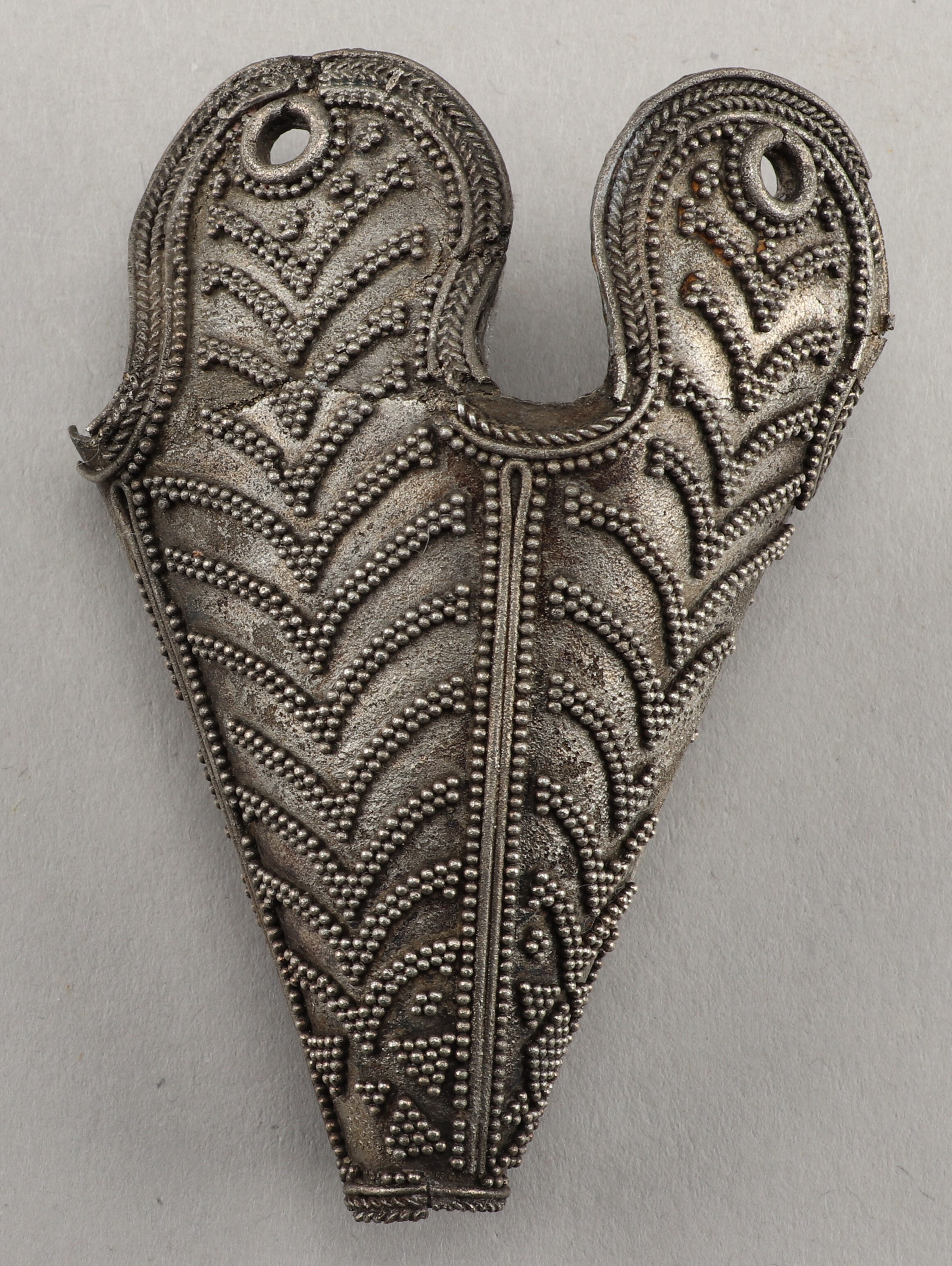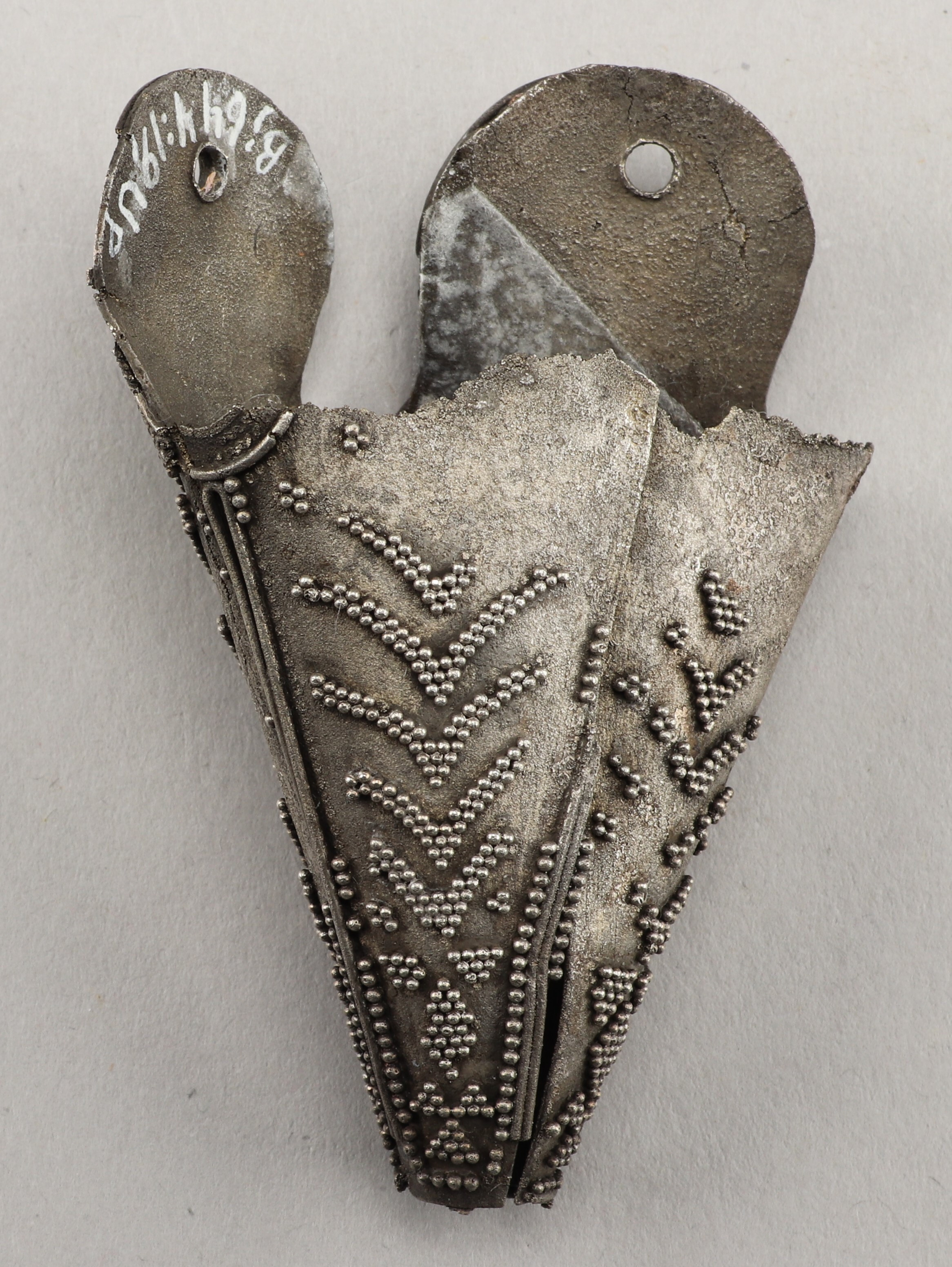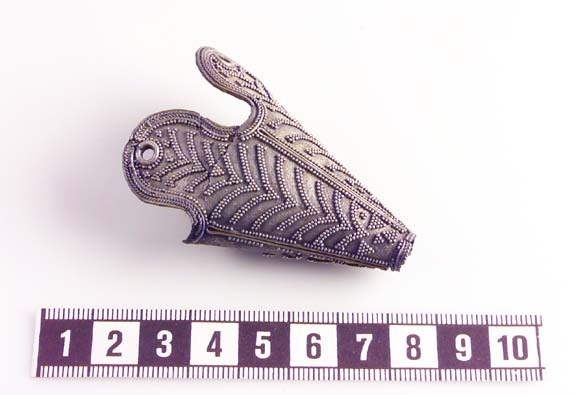 Skadad mössprydnad av silverplåt med filigran.