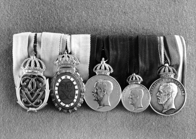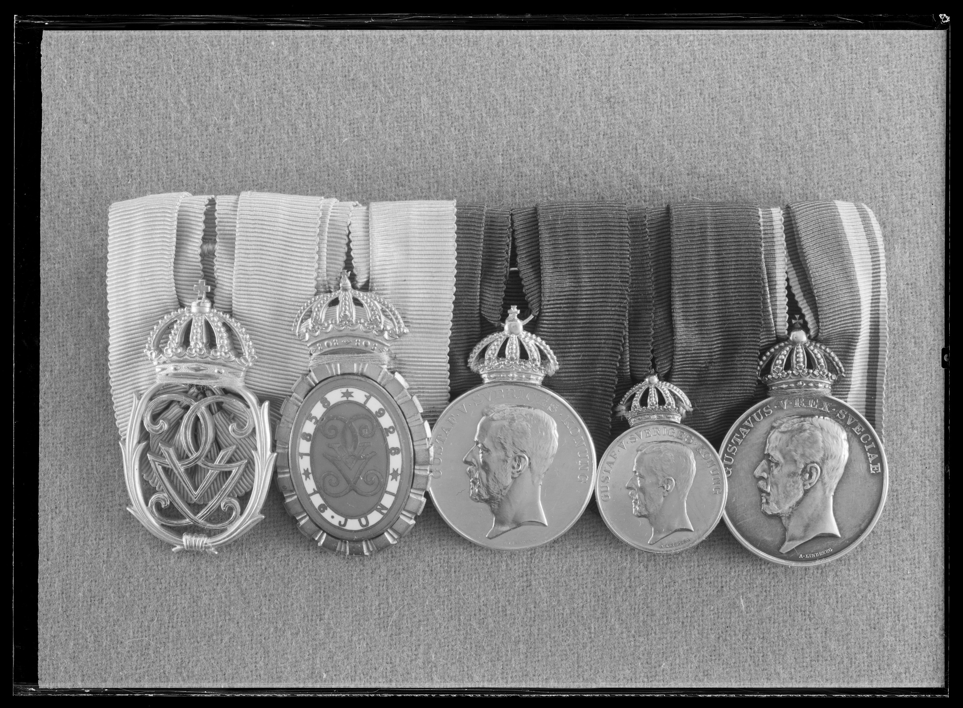 Från vänster: 1. Gustav V:s jubileumsminnestecken II, 1948, stämplar på baksidan: S&Co, S:t Erik, X 8, tre kronor, S (Sporrong & Co, Stockholm 1948). 2. Gustav V:s jubileumsminnestecken I 1928. 3. Hovmedaljen, 8:e storleken av guld, krönt, åtsida: Gustav V, halsbild, profil v, signatur: "A.LINDBERG", omskrift: "GUSTAF.V.SVERIGES.KONUNG", frånsidan slät, graverad text: "O.M.STRÅHLE // 1905-1935", band av kungsblå sidenmoaré. 4. Hovmedaljen, 5:e storleken av guld, krönt. åtsida: Gustav V, halsbild profil v., signatur "A.LINDBERG", omskrift: "GUSTAV.V.SVERIGES.KONUNG", frånsidan slät, graverad text: "O.M.STRÅHLE // 1905-1935", band av kungsblå sidenmoaré. 5. Nya Sverige-medaljen av silver, krönt, åtsida: Gustav V, halsbild profil v., signatur: "A.LINDBERG", omskrift: "GUSTAVUS.V.REX.SVECIAE", frånsida , text: "SUECIAE // NOVAE // IN MEMORIAM // 1638-1938", tre kronor samt åttauddig stjärna, bamd av blå sidenmoaré med gul-blå-gula kantränder. Monterade på spänne med platta av gulmetall, b: 29 mm, säkerhetsnål av vitmetall på baksidan.
