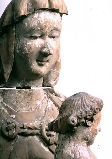 Kondition: barnets underarmar och fötter bortbrutna, Marias fingrar skadade, hennes huvud skuret som en separat del med markerad skarv. Färg: färg och kredering starkt flagnande. Gåva till Nordiska museet 1884.