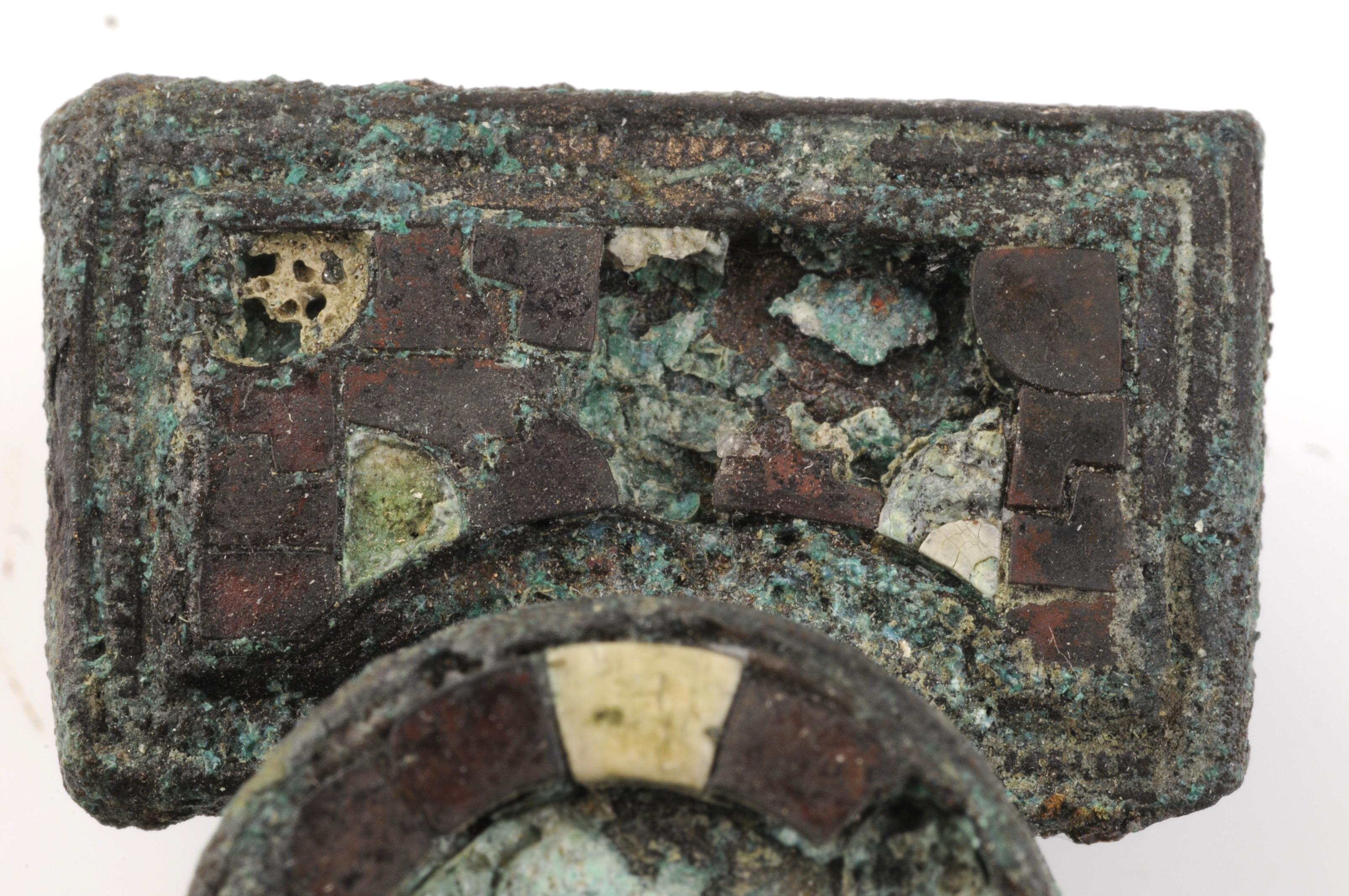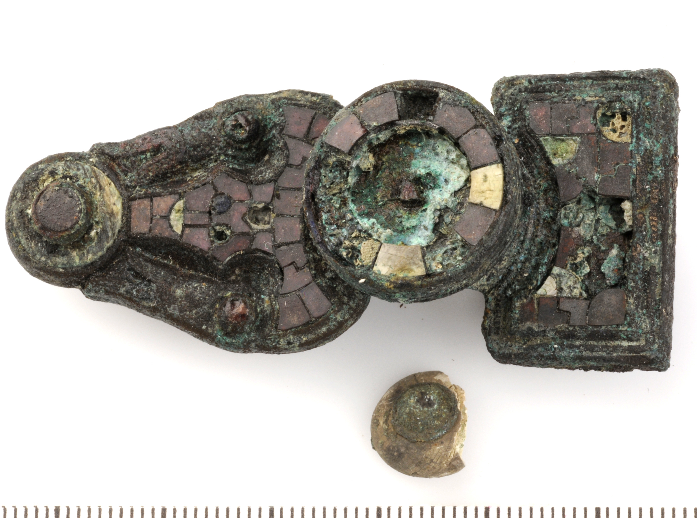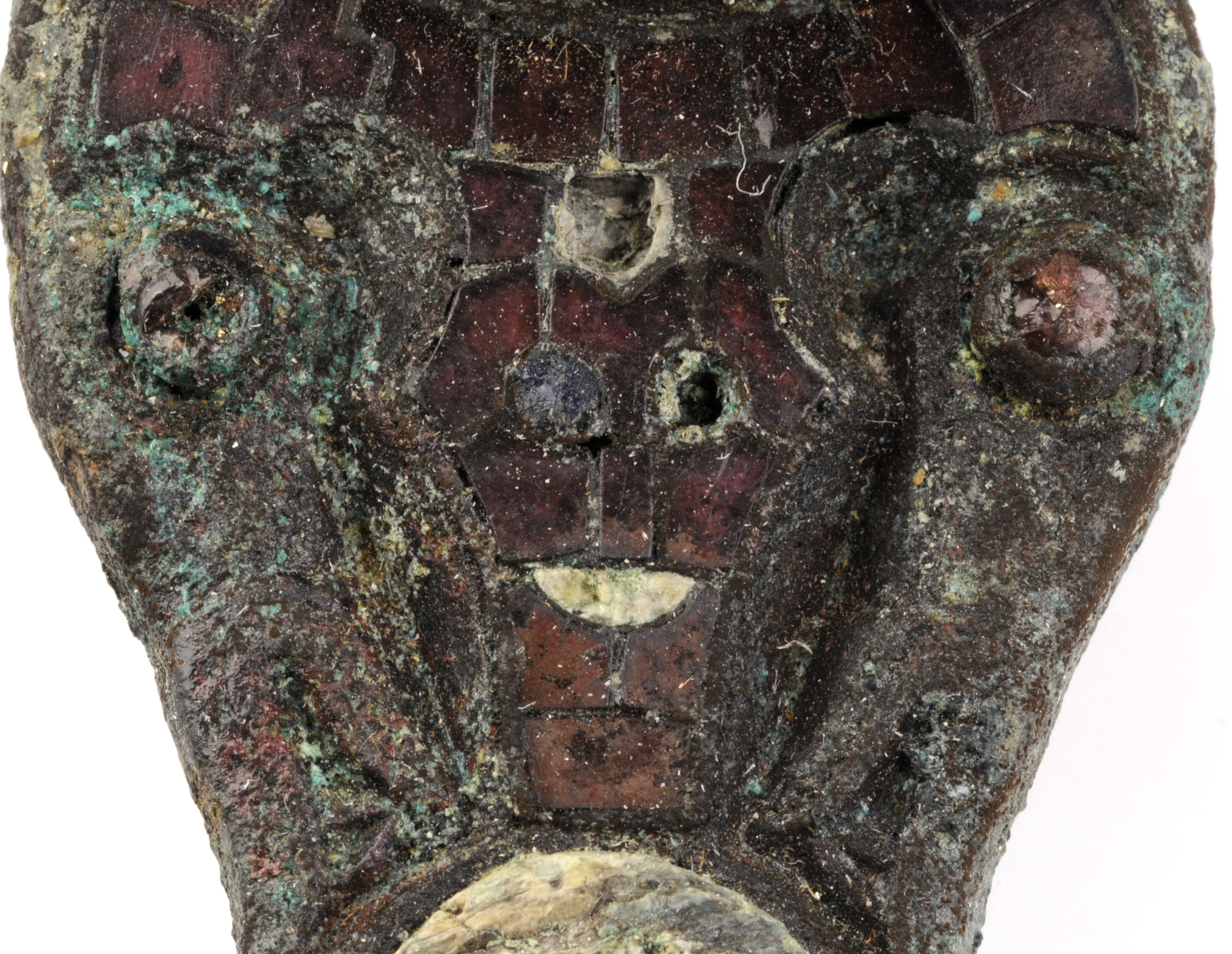 Ryggknappspänne med infattade granate. På spännets nedre del formar granaterna i mosaik ett ansikte.