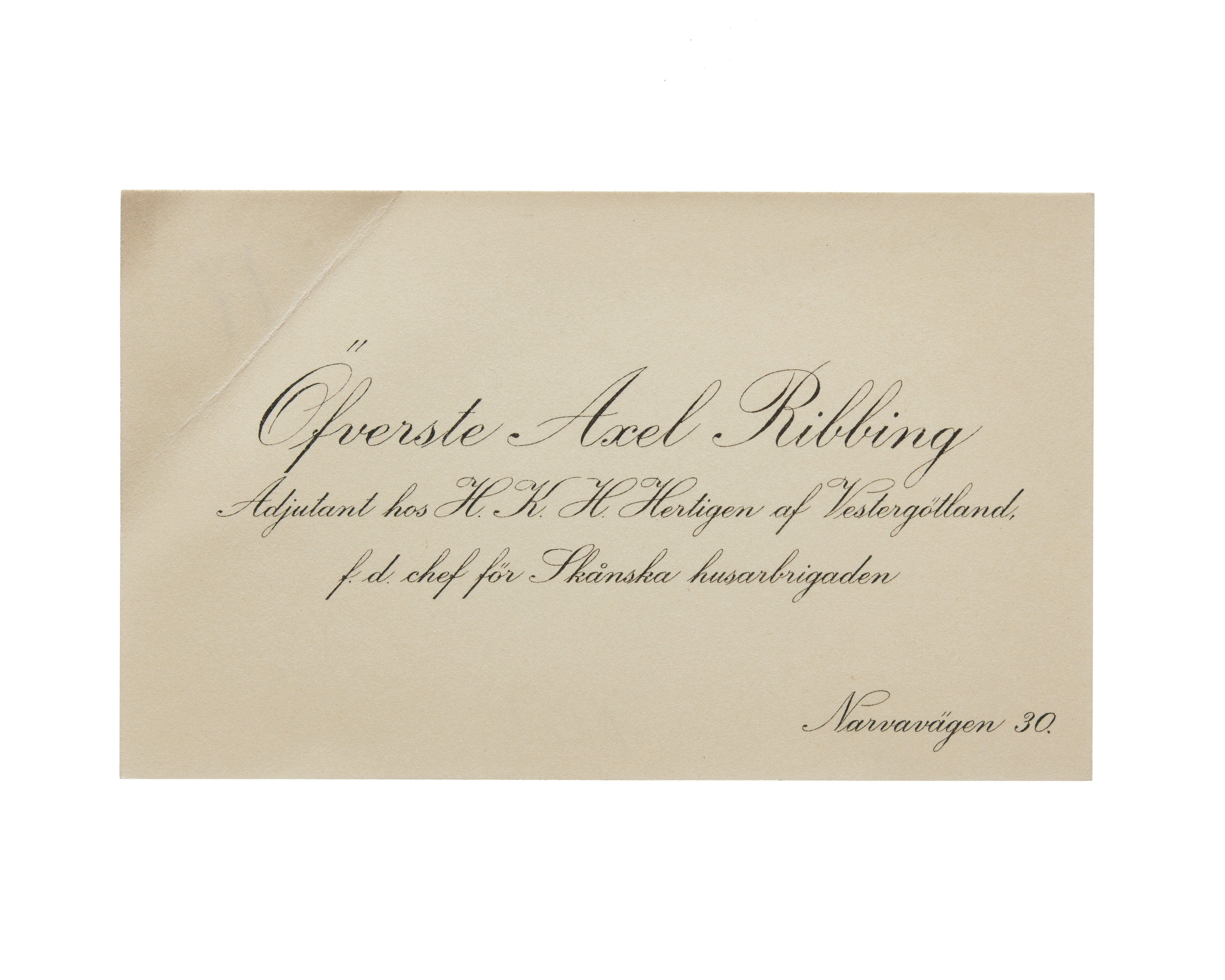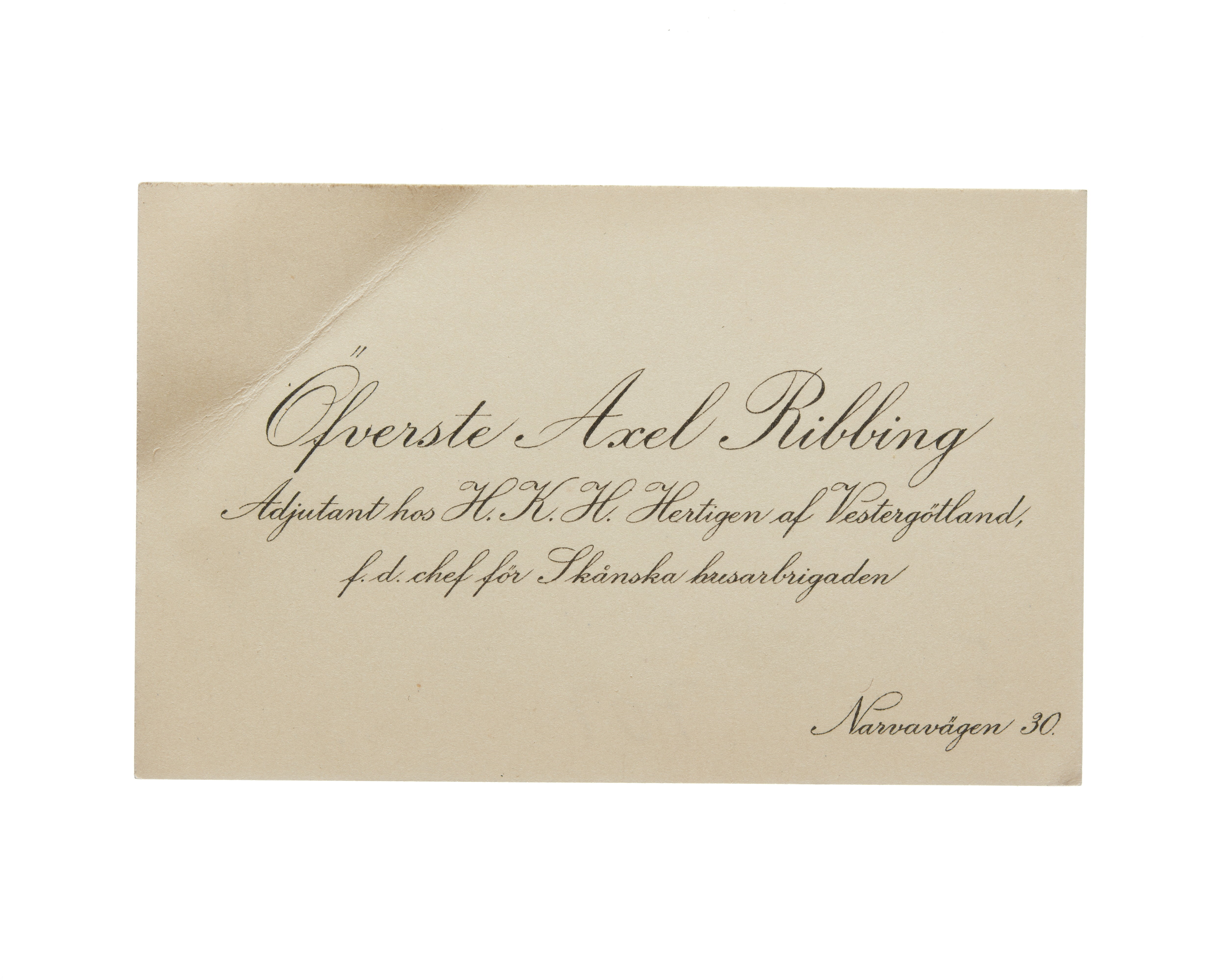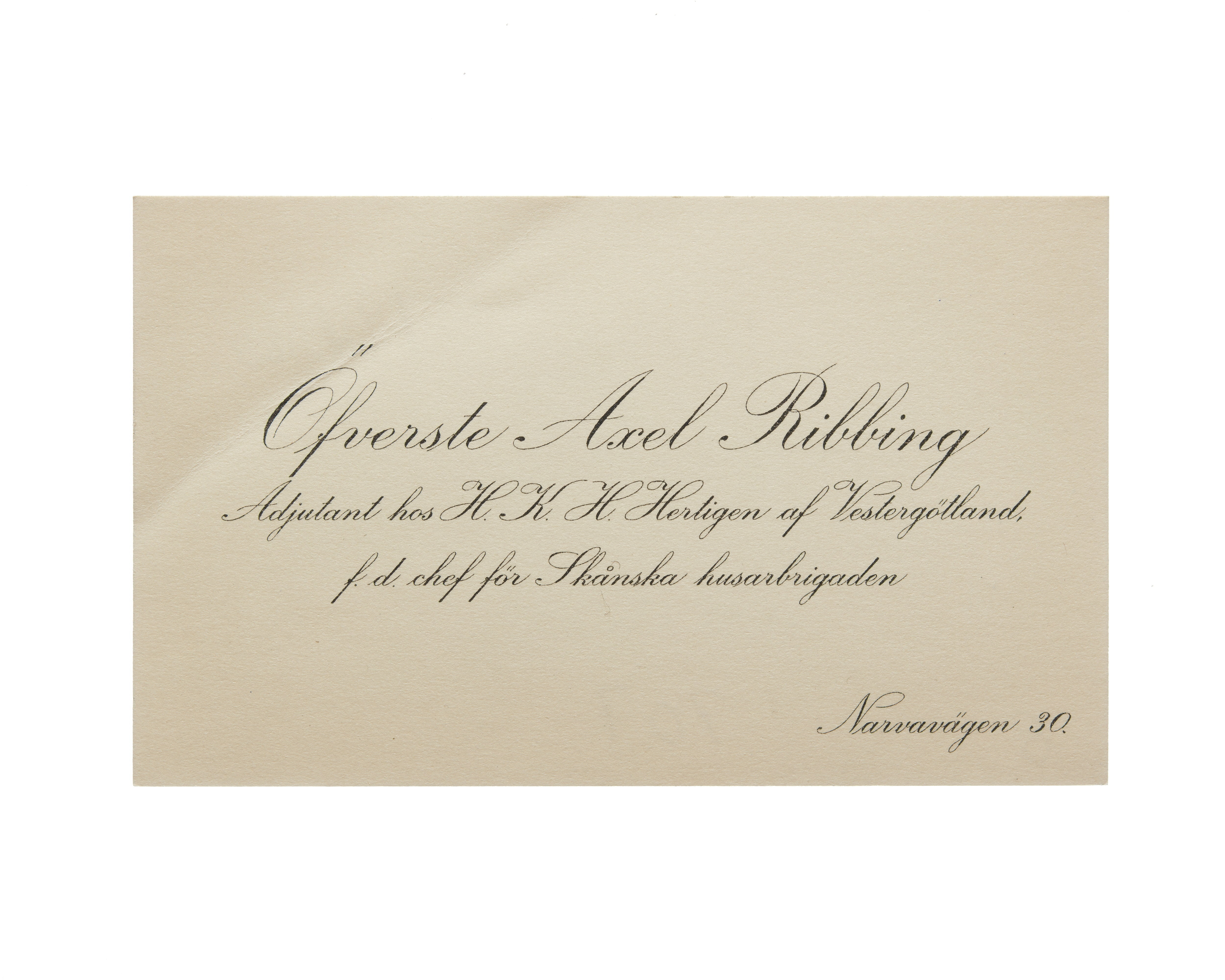 Visitkort från Överste Axel Ribbing, adjutant hos H. K. H. Hertigen av Vestergötland, f.d. chef för Skånska husarbrigaden.