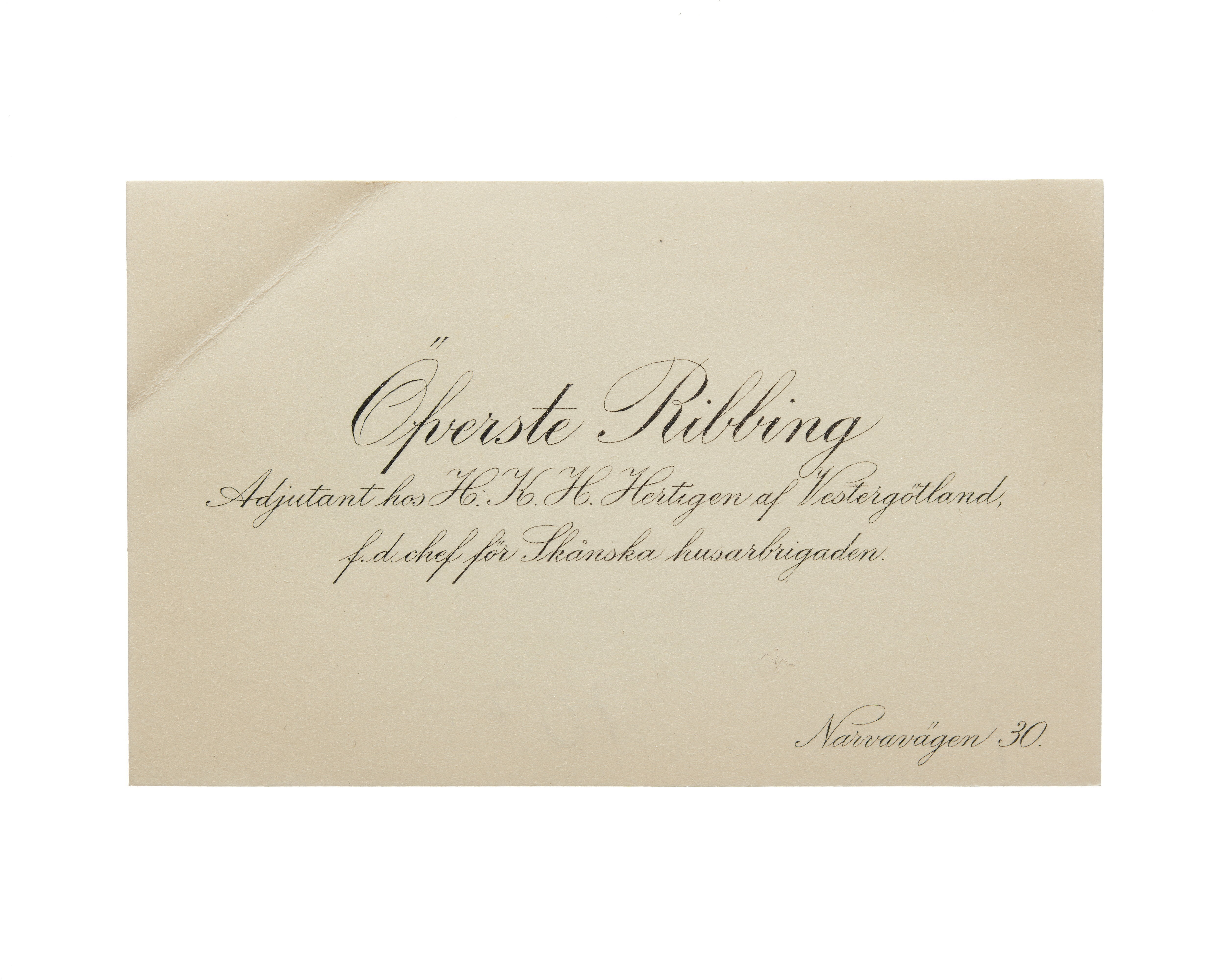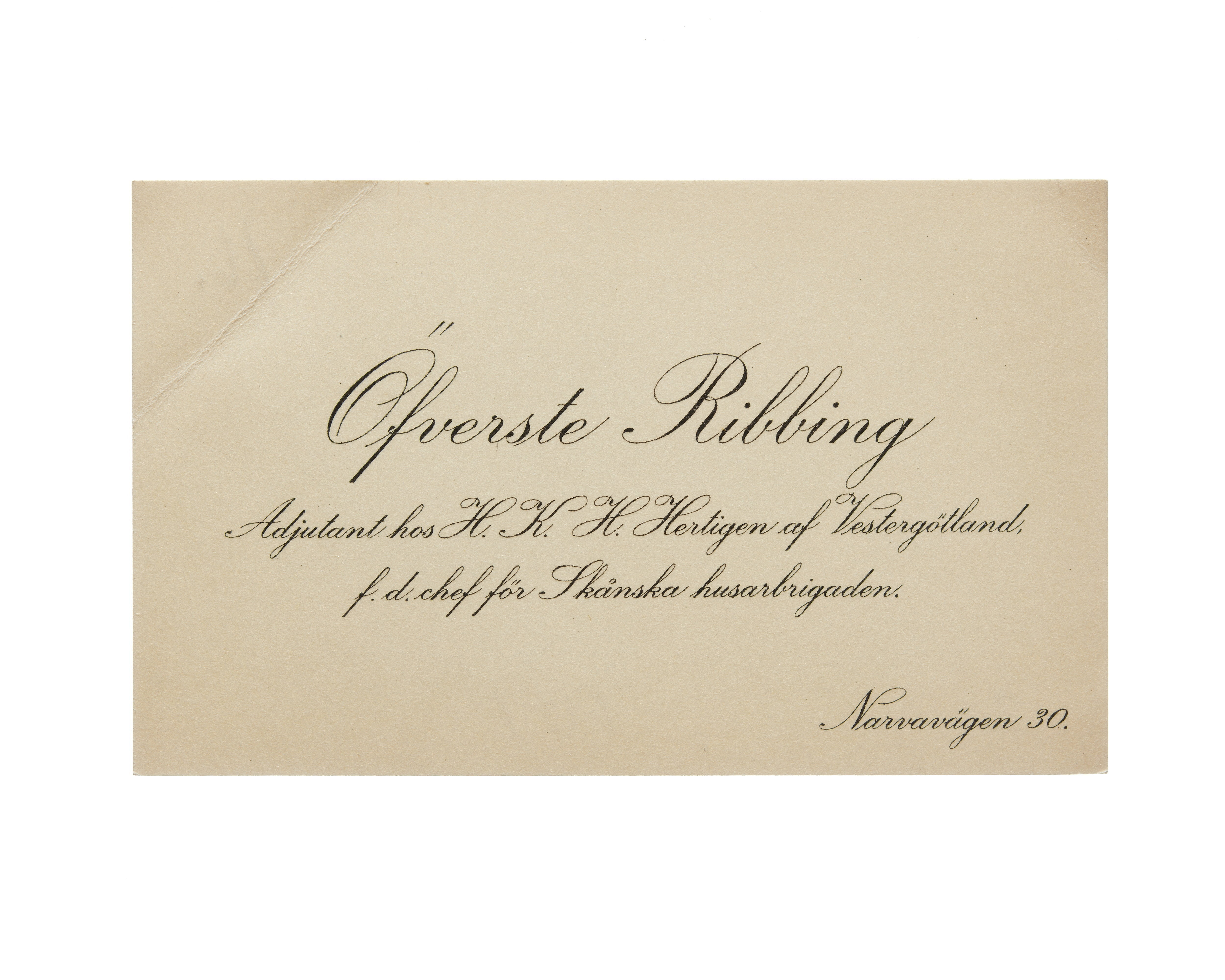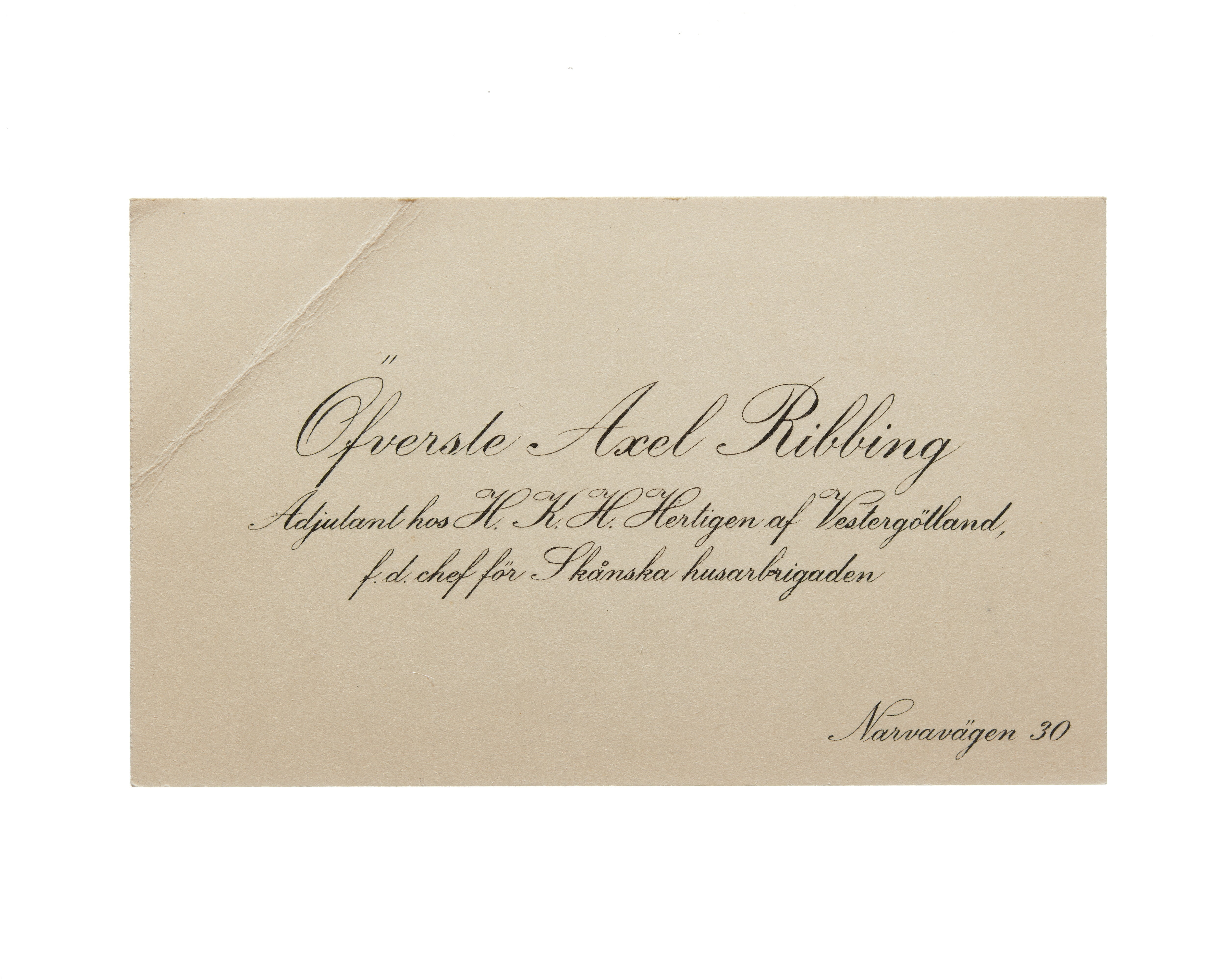 Visitkort från Överste Axel Ribbing, adjutant hos H. K. H. Hertigen av Vestergötland, f.d. chef för Skånska husarbrigaden.