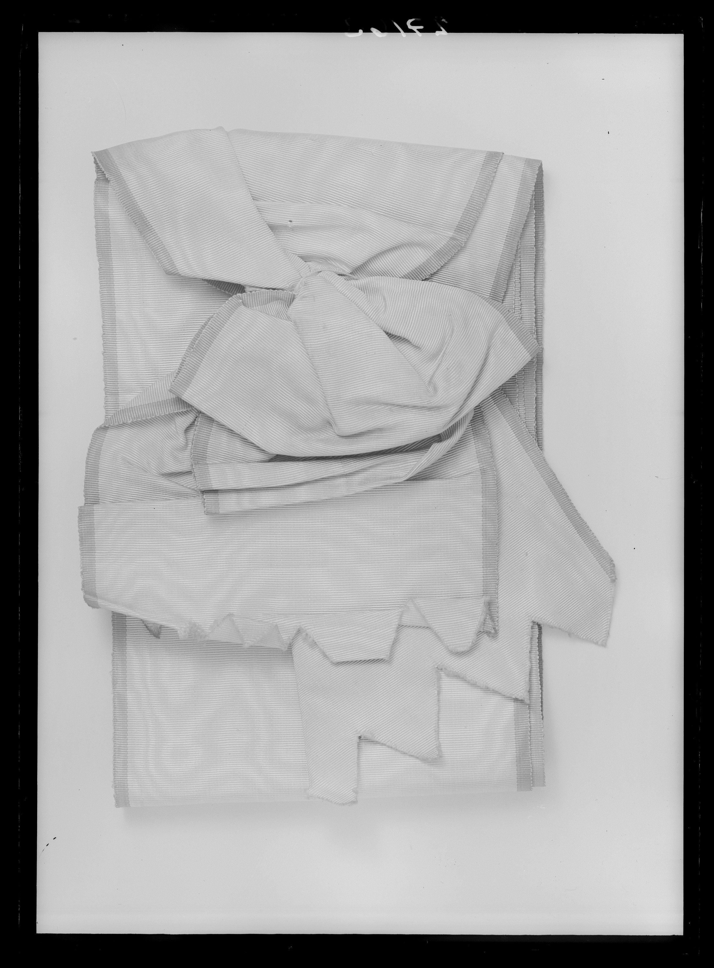 Axelband av vit sidenmoaré med 3 mm breda röda kanter, tandade bandändar.Ca 80 mm därovanför fäst en rosett av bandet.
