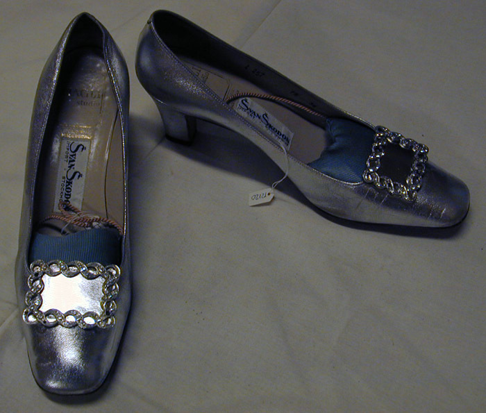 Högklackad sko, silverfärgad. Slät, trubbig tå. Fastklämt spänne med på en läderbit runtkanterna klistrad metallfläta med i fästa slipade bitar glas. I skon är sytt en vit etikett:"Svan Skodon // IMPORT-STOCKHOLM" och stämplat med guldfärg inom en ram: "MAGLI // studio"och nedanför: "BOLOGNA // MADE IN ITALY", samt i svart serienumret: "Z 257 75 38". Påundersidan stämplat: "38" och "IMPORT".