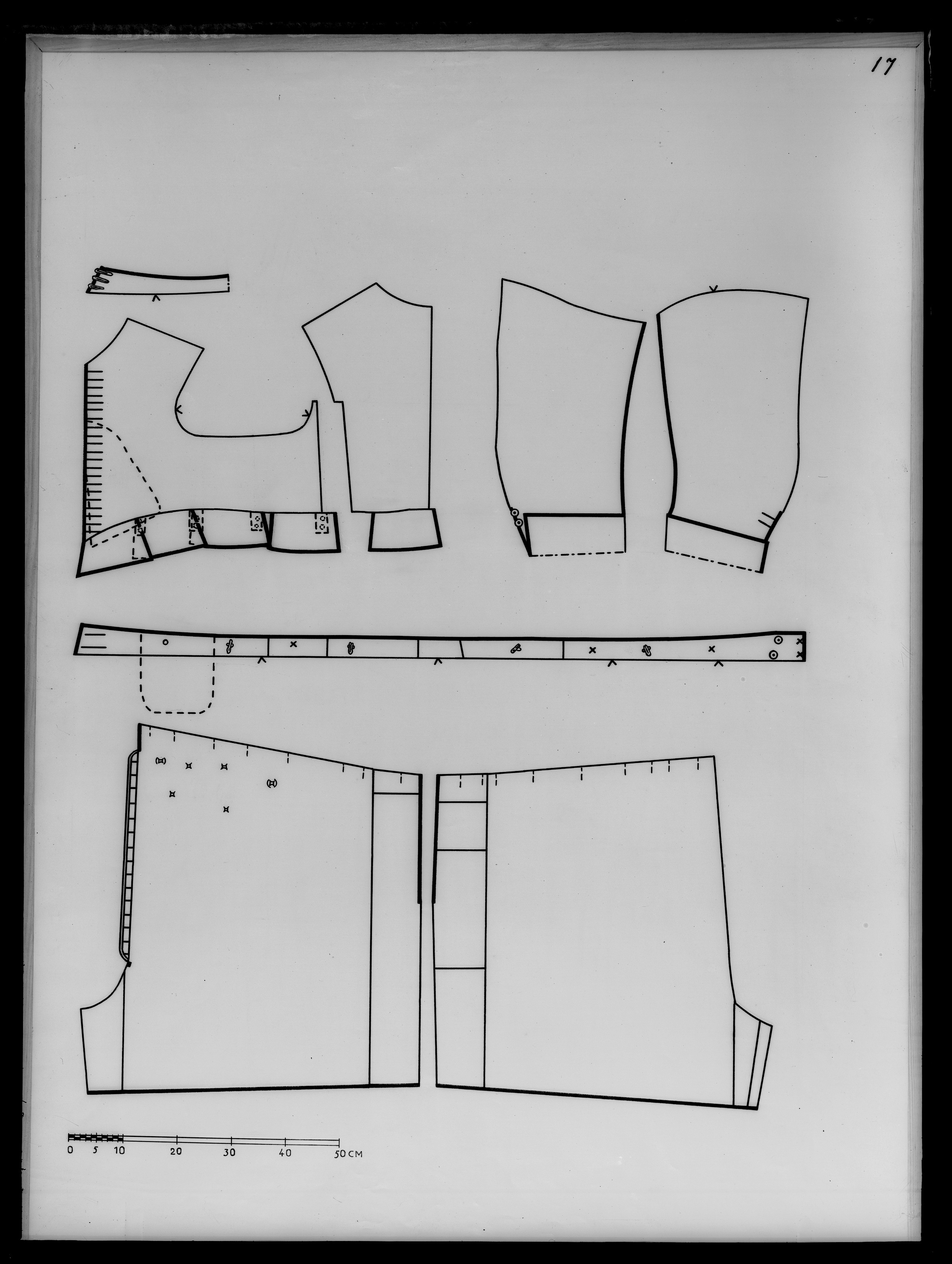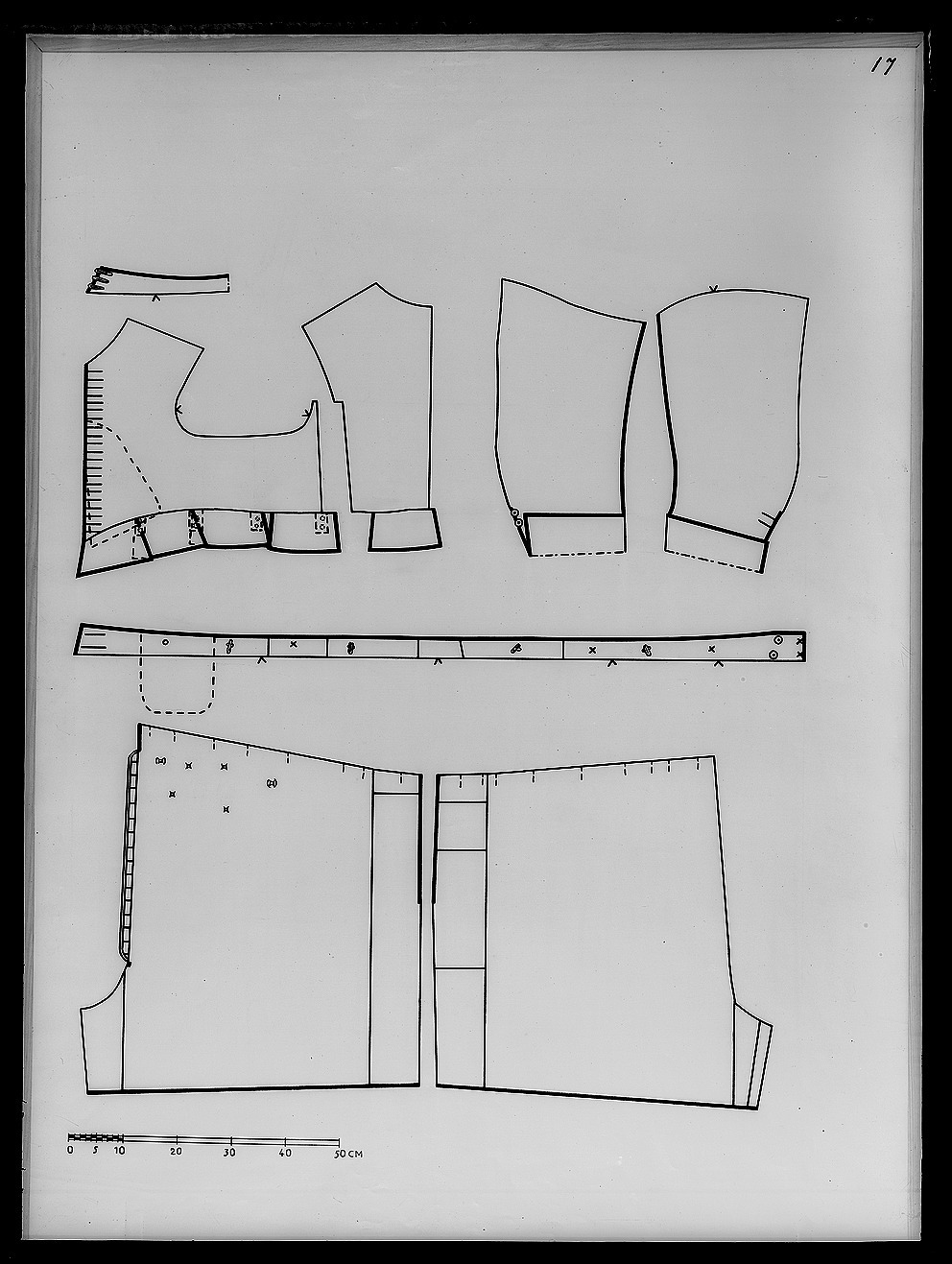 Tröjan och byxorna är i stort sett mycket lika dräkt nr 3389, fastän obetydligt mindre.Tröjan är tillskuren på samma sätt med 2 framstycken, 1 helt ryggstycke, 2 stycken till varje ärm, och krage, av de 10 små skörten finns dock bara 9 kvar. I midjan sitter på insidan 8 st byxtampar, sydda av fodertyget. Fodret på insidan utgörs av silvermoiré. Den har en vådbredd av ca 49 cm (utan stad) (68x14 á 15 tr/cm2). Vävnaden utgörs av vit, omönstrad, sidenrips med invävda silverlan på rätan. Varp såväl som inslag är otvinnade. Stad: 0,7 cm (6 gröna, 6 gula, 6 gröna, 6 gula, 6 gröna, 1 tjock vit tråd, i ripsvävnad). Mitt i stycket (=dess halva bredd) även mitt i ryggen synes tydligt det veck som uppstått vid moirébehandlingen, då tyget vattrades. Fodrets bakstycke är nertill i ryggen mycket bredare än atlasen, bredden i midjan är här 42 cm mot 30 på atlasen. Under knapphålsraden med sina 24 st (2,5 cm långa) knapphål har man liksom även på kragens insida sytt ett foder av vit taft. Knapphålen är sydda med vitt högertvinnat silke, med 8 á 11 stygn/cm över 1 tråd. De 3 cm långa knapphålen på ärmarna (8 stygn/cm) har försetts med tränsar på tvären där hålet slutar - dock ej knapphålen mitt fram. Av alla knapparna finns blott en liten grupp om 4 st i en rad kvar (3:e - 6:e nedifrån). De är silvertrådsklädda (d: 1,2 cm). De 4 knapparna på kragen saknas medan de 4 silvertränsarna däremot finns kvar. Mellanfodret utgörs av oblekt linnelärft (18x18 tr/cm2), dock saknas foder i ärmarna. I midjan sitter i framstyckena triangelformade planschetter. För att åstadkomma extra styrsel i tröjan nertill i midjan har man, förutom en ca 11 cm lång vertikal avsyning i lärftfodret ungefär mitt bak i ryggen även sytt fast en avklippt atlasstad, randig i vitt och rött med grön varp, längs hela den svängda midjelinjen. Av bevarade trådrester kan man skönja att plagget, liksom dräkten i sin helhet, varit garnerad med spetsar, som sytts fast. Vid skörtsömmen på höger sida fram finns en ytterst liten rest av knypplad silverspets. Det visar sig av 1675 års Klädkammarräkningar att 8 alnar smalare silverspetsar sprättats av tröjan till 2 silverduks (=silverbrokads) täcken.