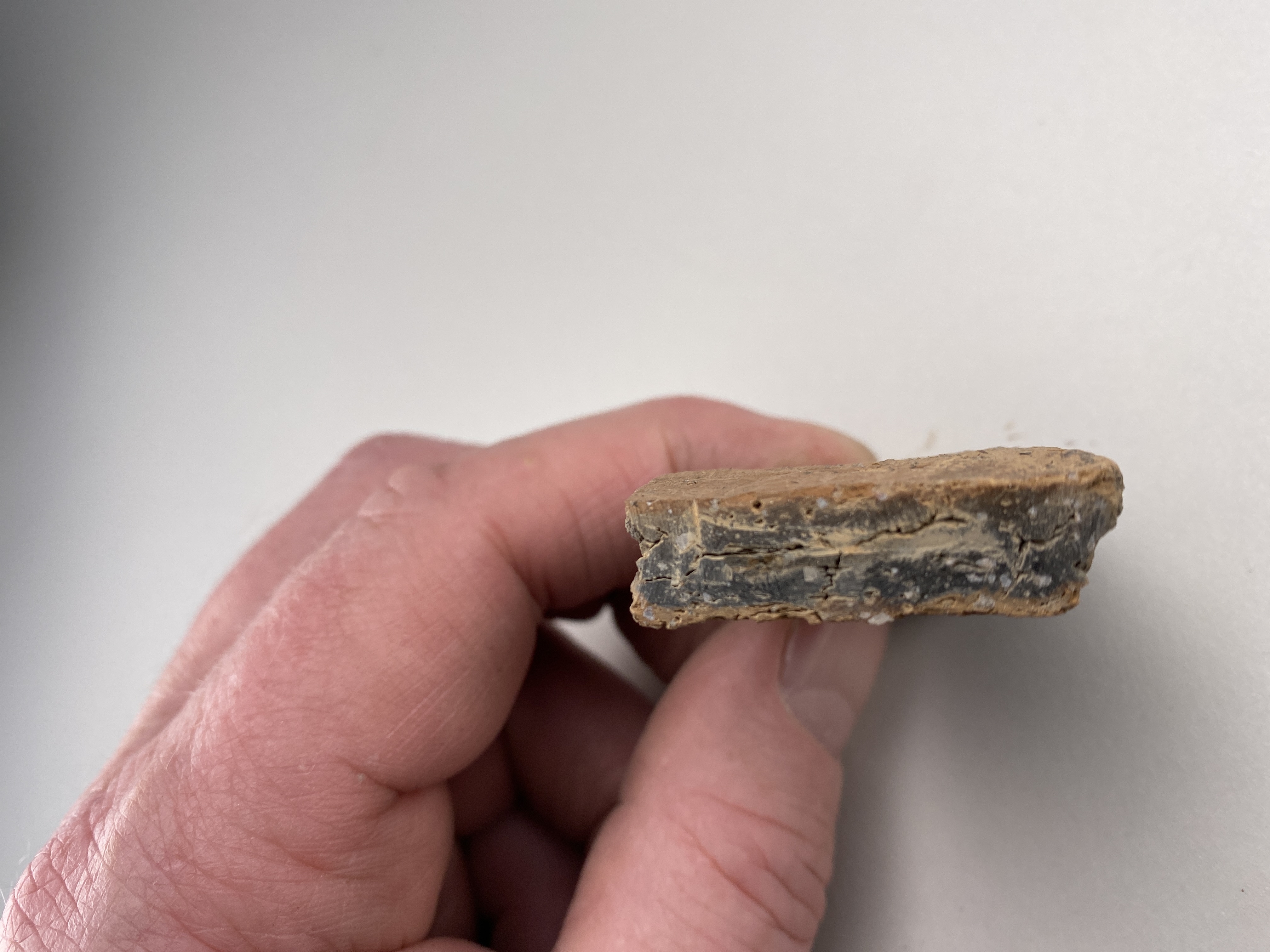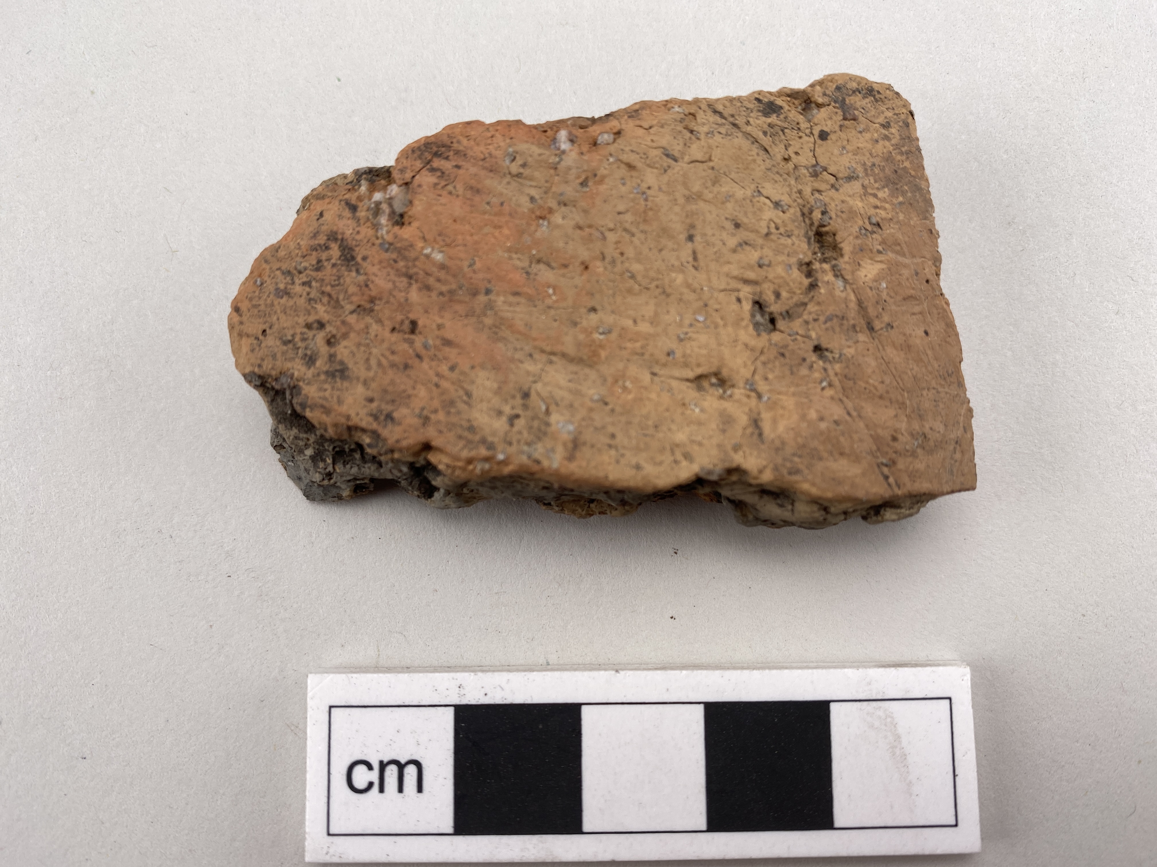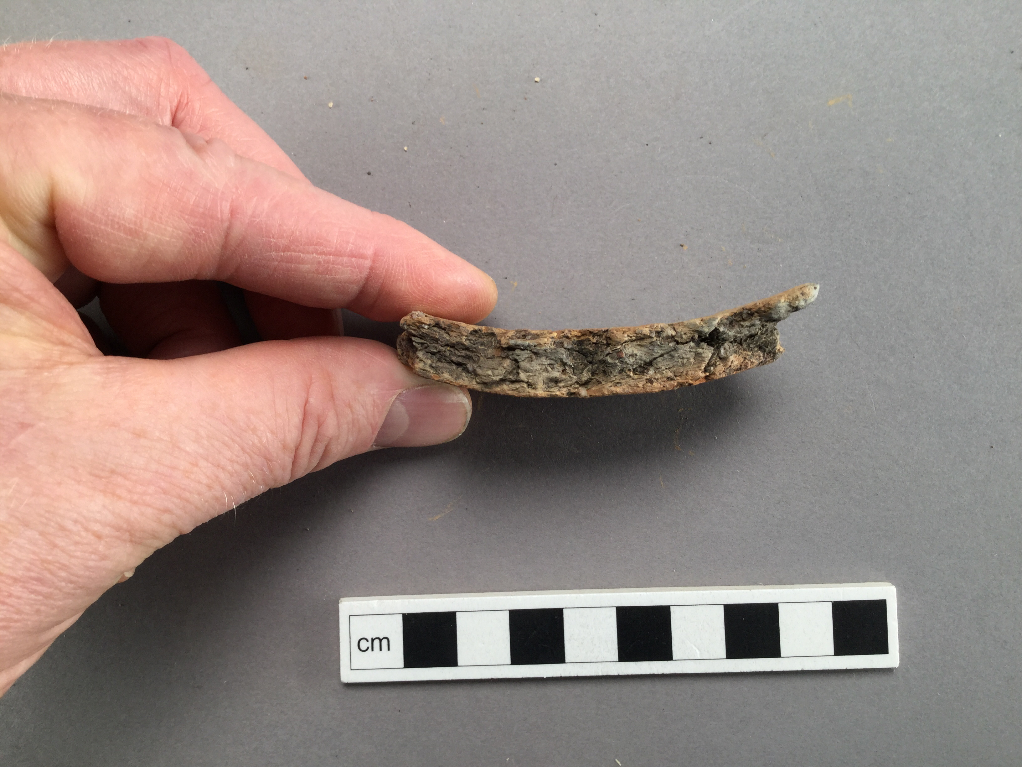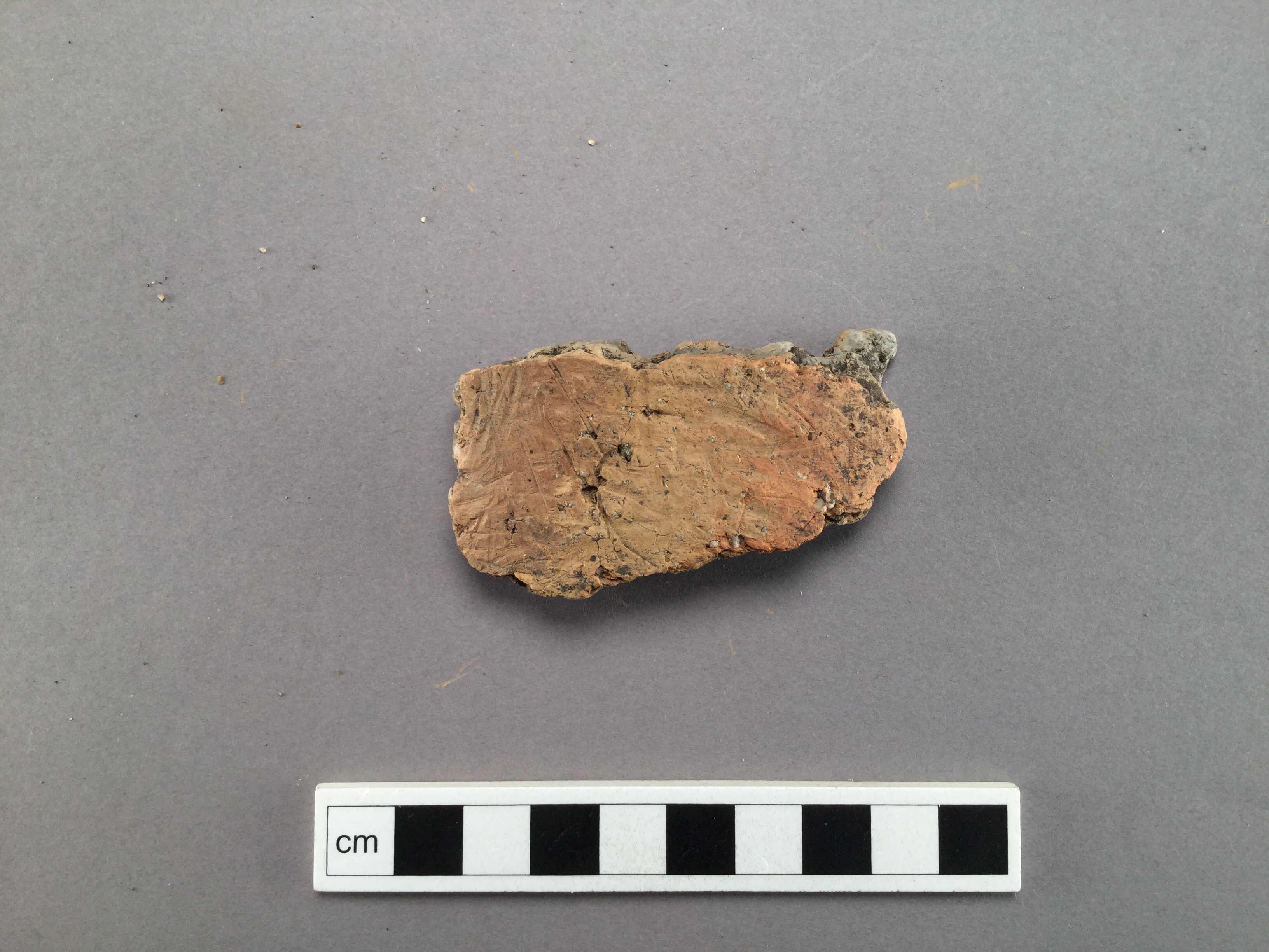 bukskärva. strimmig ut- och insida. oxiderat bränd inne och ute. magring av krossad bergart <3 mm stora korn. Tillhör kärl 7 tillsammans med F. 745, 788, 790 m fl