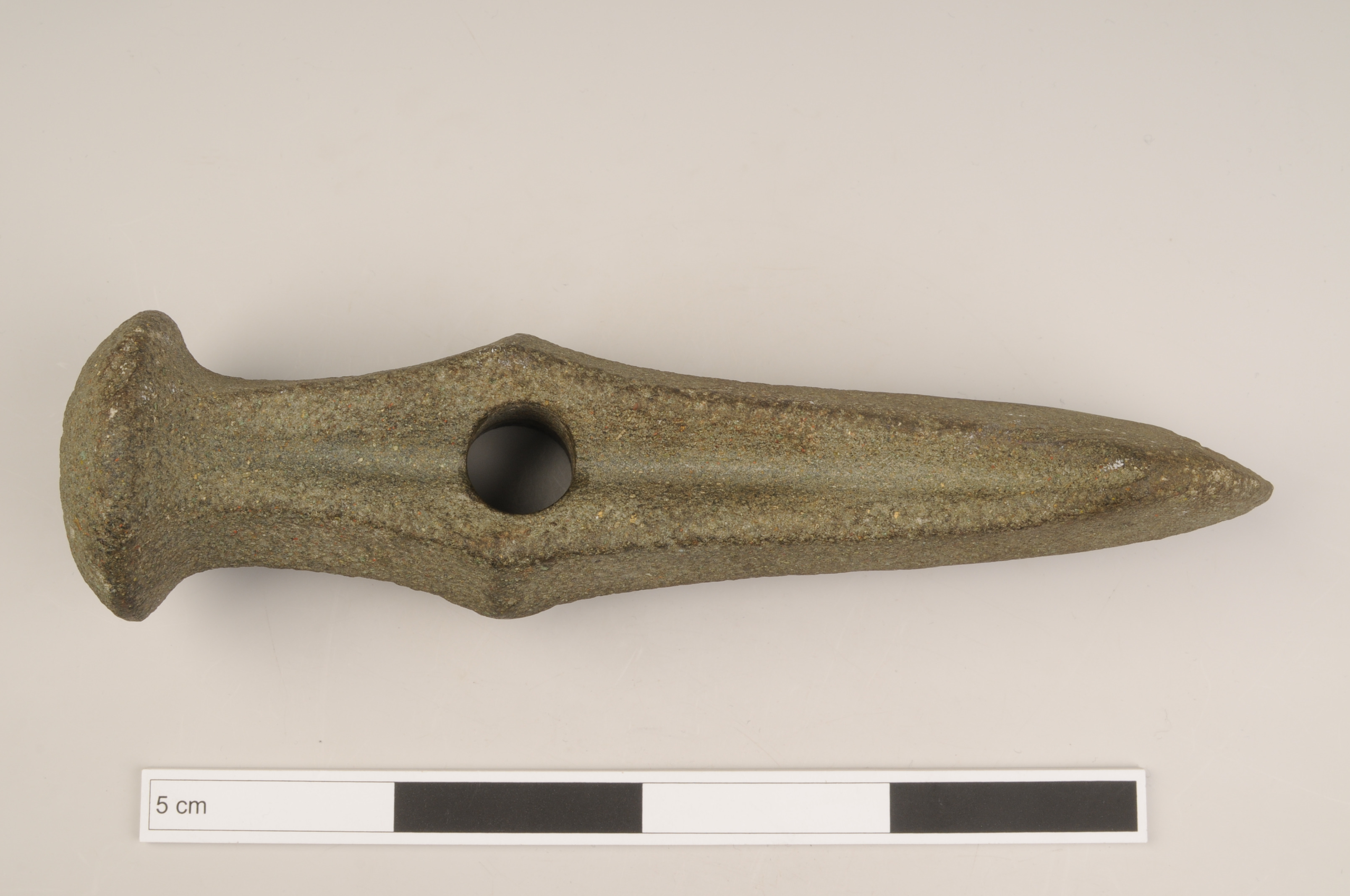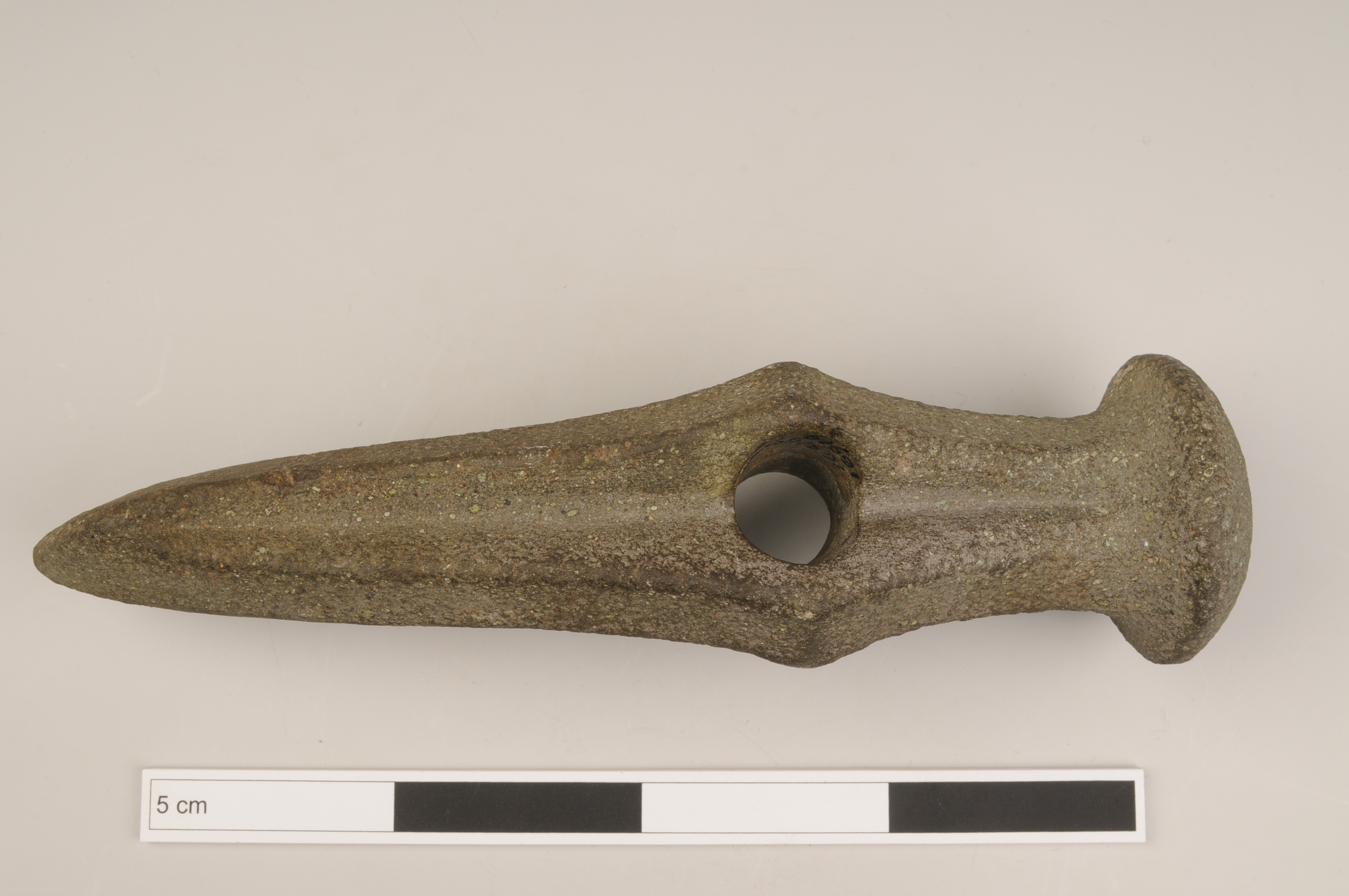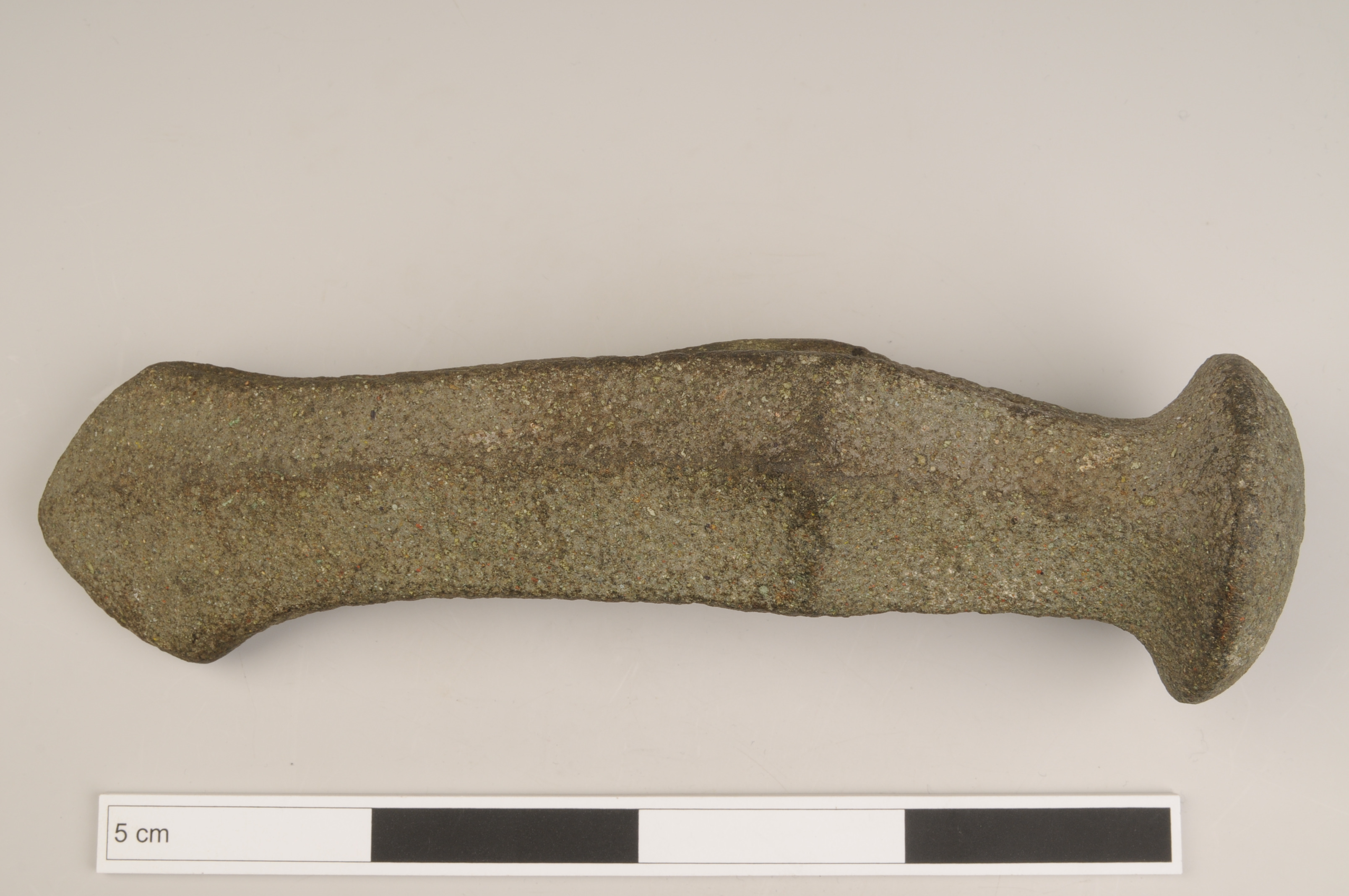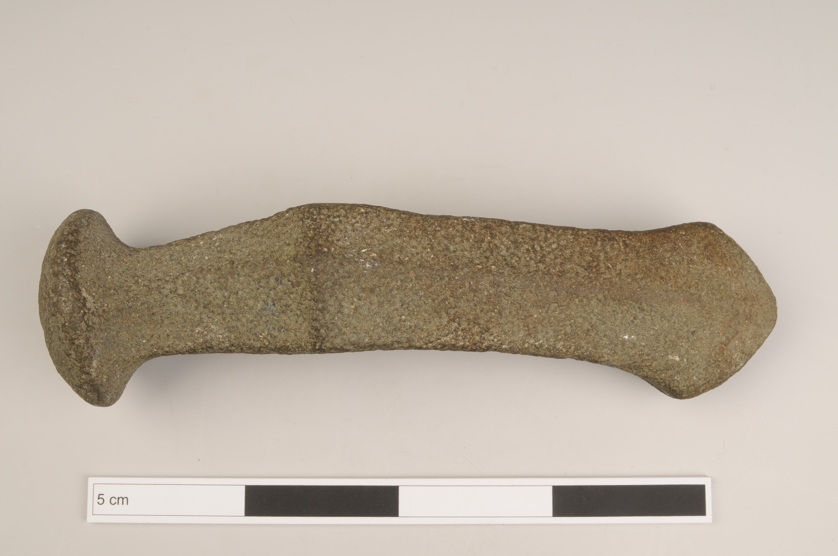 Mångkantsyxa av gröngrå bergart med mjukt böjd kropp, markerad nackknopp, bred ränna, åsar och utsvängd egg. Horisontell ås längs bredsidorna och vertikal ås vid skafthålet. Vittrad yta.