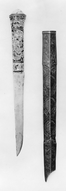 Skaft med yttäckande ornering av olikfärgad emalj med trådinläggningar av mässing. Skaftet vidgat upptill och där med en stor oval turkos.