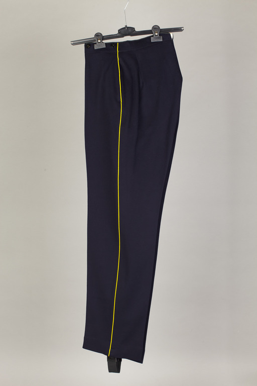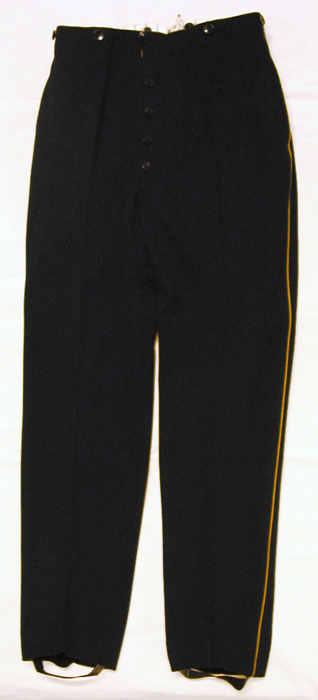 Långbyxor av mörkblått kläde, knäppning med gylf och fickor i sidsömmen, Fem knappar i linningen d: 17 mm med firamnamn: " MILITÄR-EKIPERINGS AB " sprund i linningen mitt bak. Fem knappar i gylfen d: 14 mm lika som de i linningen. En bakficka 145 mm bred. I byxbenens sidsömmar gul passpoal. Nedtill hällor av svart resår med kvadratisk lackskinnsskoning fäst med en knapp på vardera byxbenets insida. Foder i linningen av vit bomull med smala svarta ränder. Baktill två knappar samt hängare. Fickor av vit bomull. Framtill på linningens insida spänntamp med firmamärke: " Militärekiperings AB // Kungl. Hofleverantör // Stockholm den 8.12 1924 // H. K. H // Prins Gustaf Adolf ".