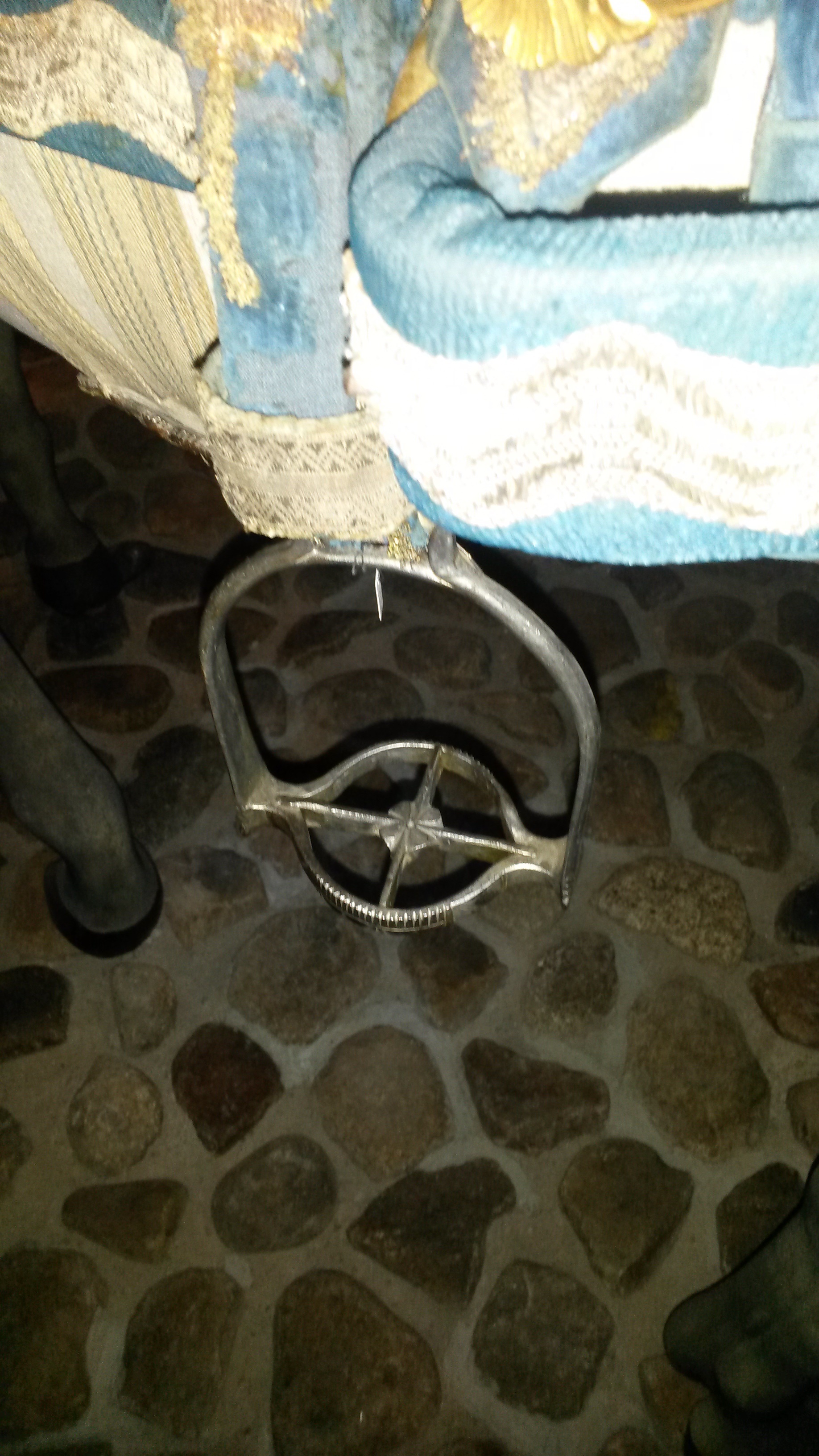 Stigläder till spannryttarsadel (nnr 29661). Av läder, ursprungligen helt klätt med blå sammet och dekorerat på utsidan med silvergalon och guldfrans. Mellan sammetsfragmenten blå textil. Rektangulär sölja av järn. Remmen nedtill sammanhållen med en bred hälla, klädd med ett silverband. Konserverad.