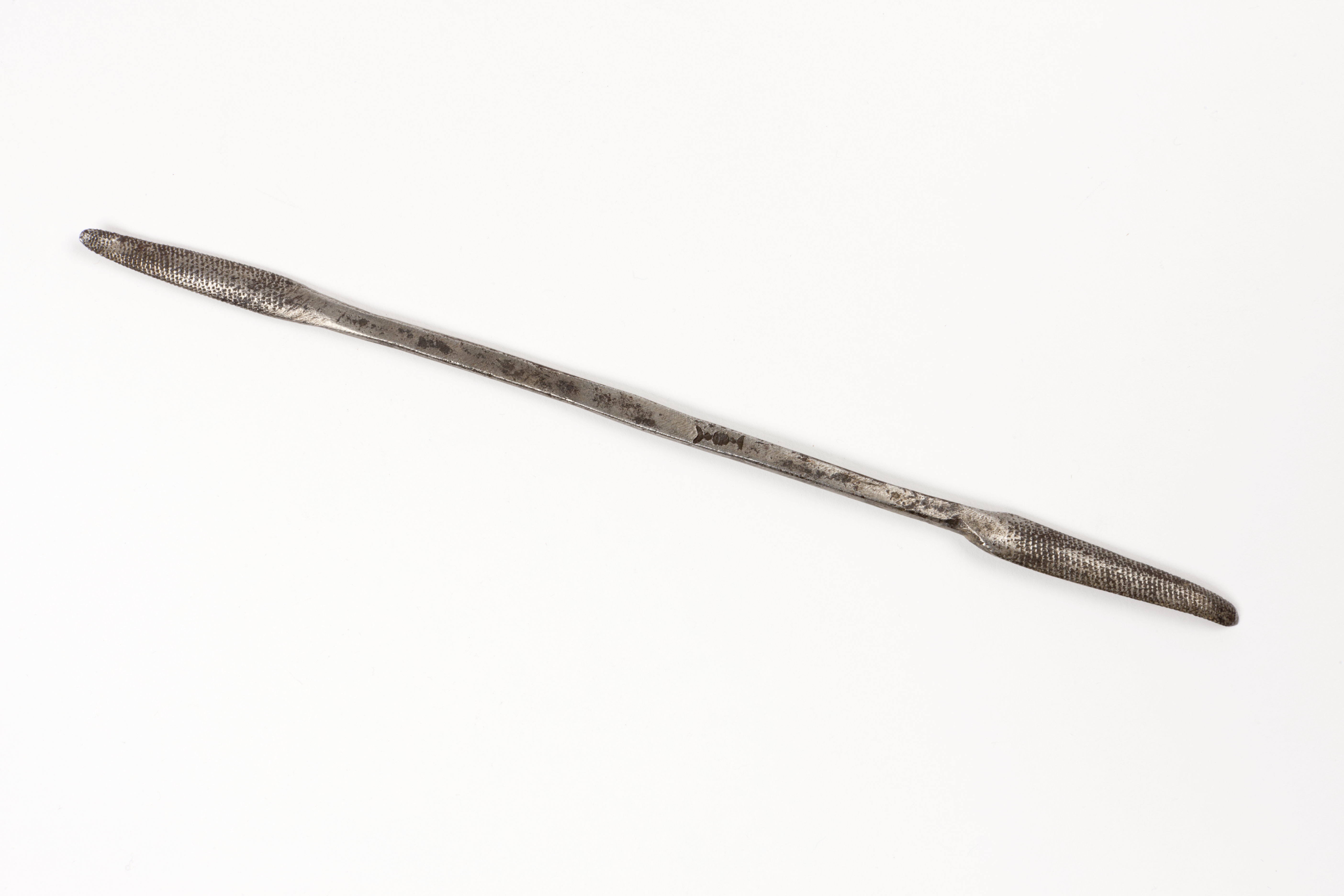Stämpel: två motställda figurer formade som månskäror, mellan dessa två punkter och en större, närmast rektangulär, tvärstreckad figur. Fyrsidigt skaft mellan två raspar med samma huggning på båda sidorna.