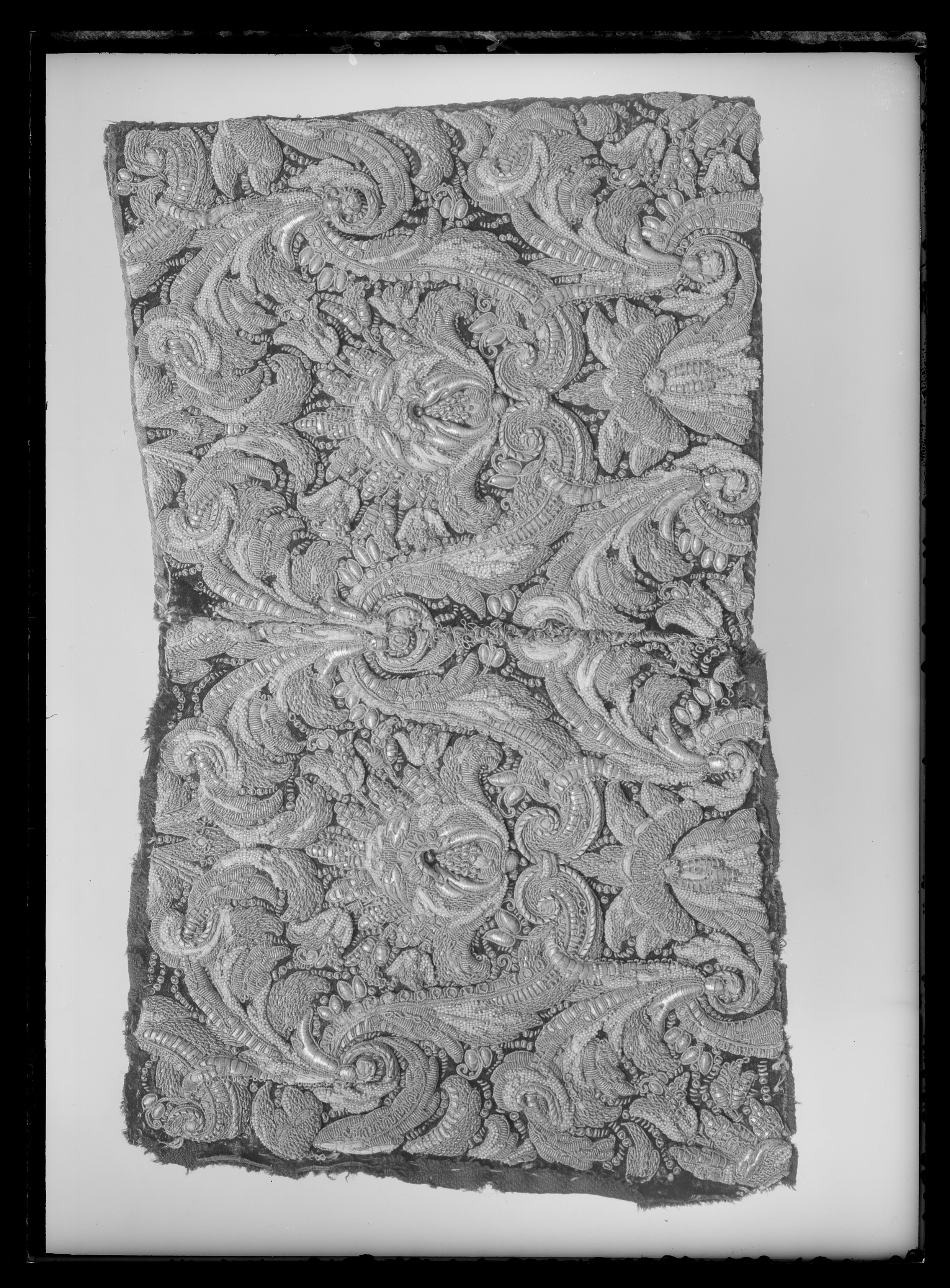 - Ett Säte till en Sadel af viollett brunt sammet. Sätet och bakkarmen äro ornerade med smala guld-litsqvarder samt karmen öfwerallt broderade med guldperlstickare arbete med perlor, af hwilcka en del äro borta.