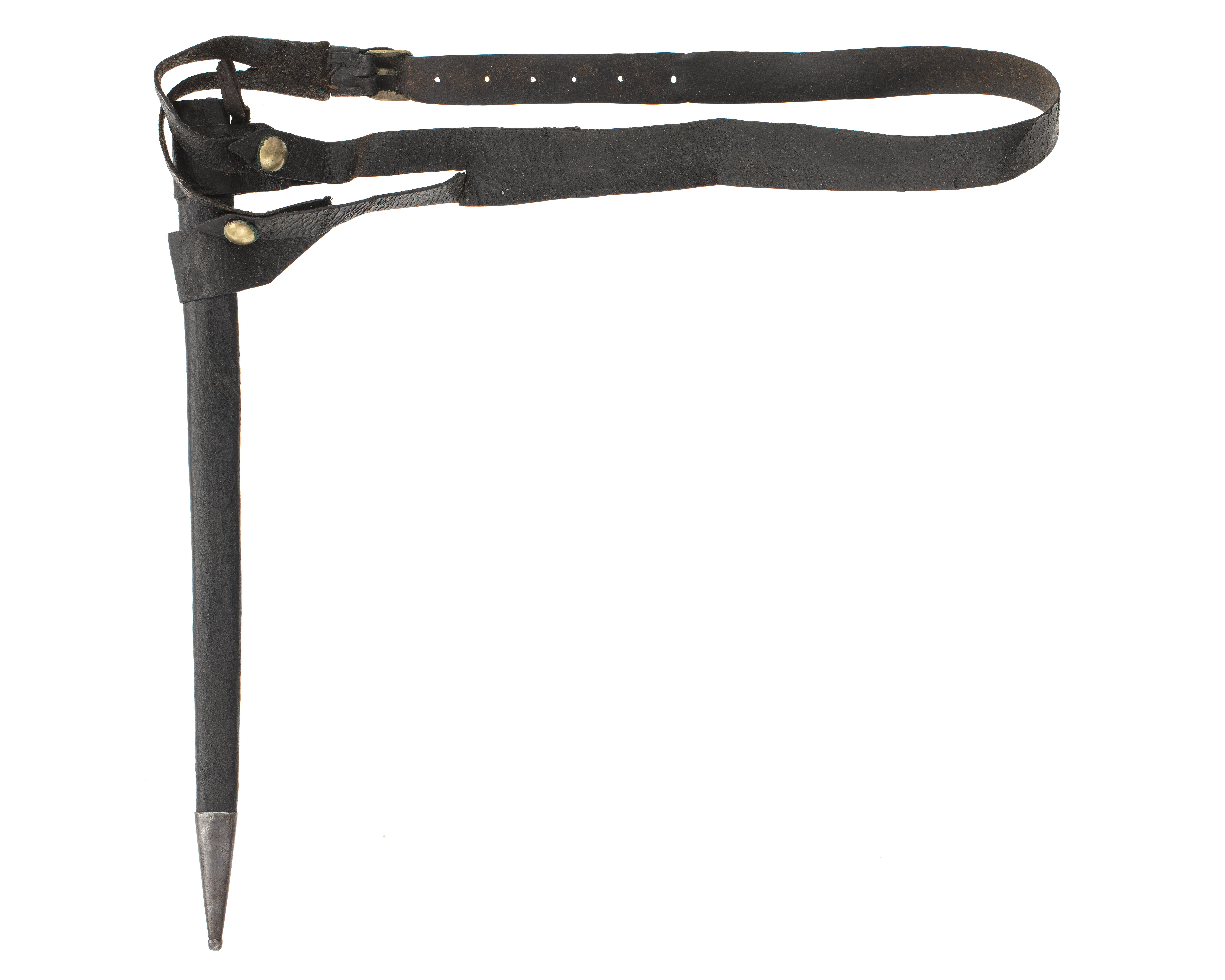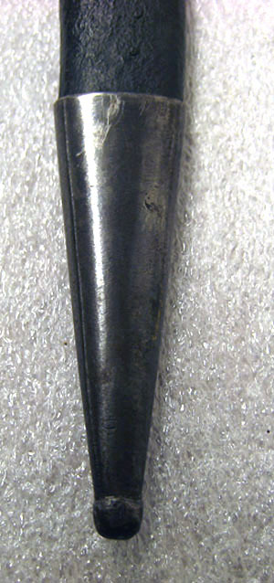 Balja av svartmålat trä, möjligen även överdragen med tunnt skinn. Rak, nedåt avsmalnande med ovalt tvärsnintt. Nertill doppsko, l 48 mm, driven i stålplåt. Nedåt avsmalande och nertill avslutat med knopp. Sammanfogad på baksidan med synlig lödd söm.