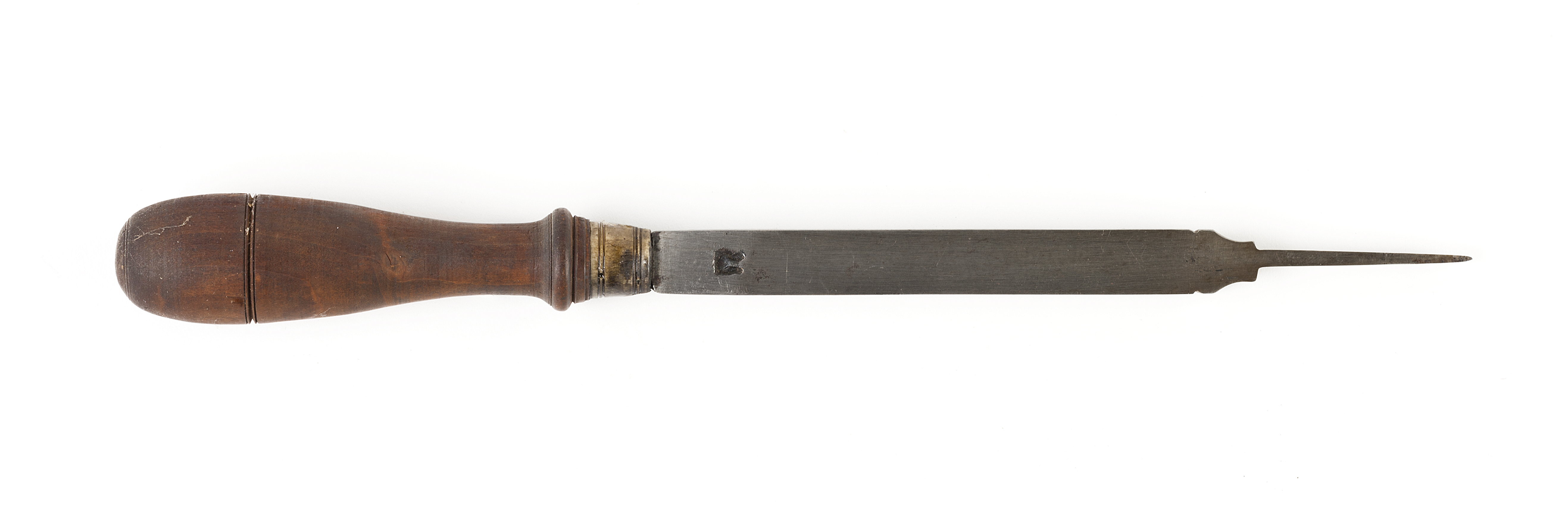 Klinga med rektangulär genomskärning, via profilering övergående i smal ände med spetsig egg. Stämplat på klingan: oxenstiernska vapnet. Svarvat skaft av päronträ, med en vulst nedtill. Hornring.