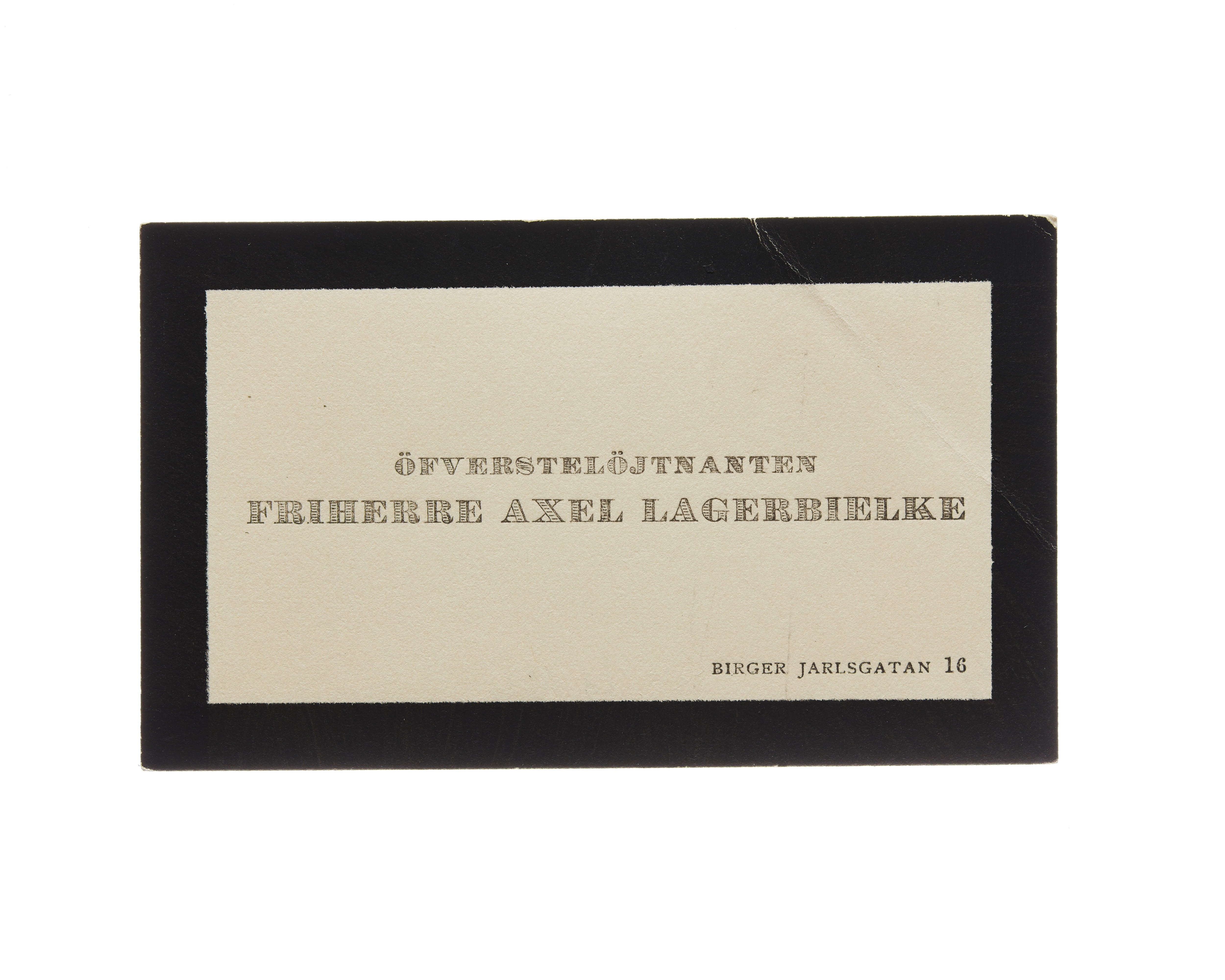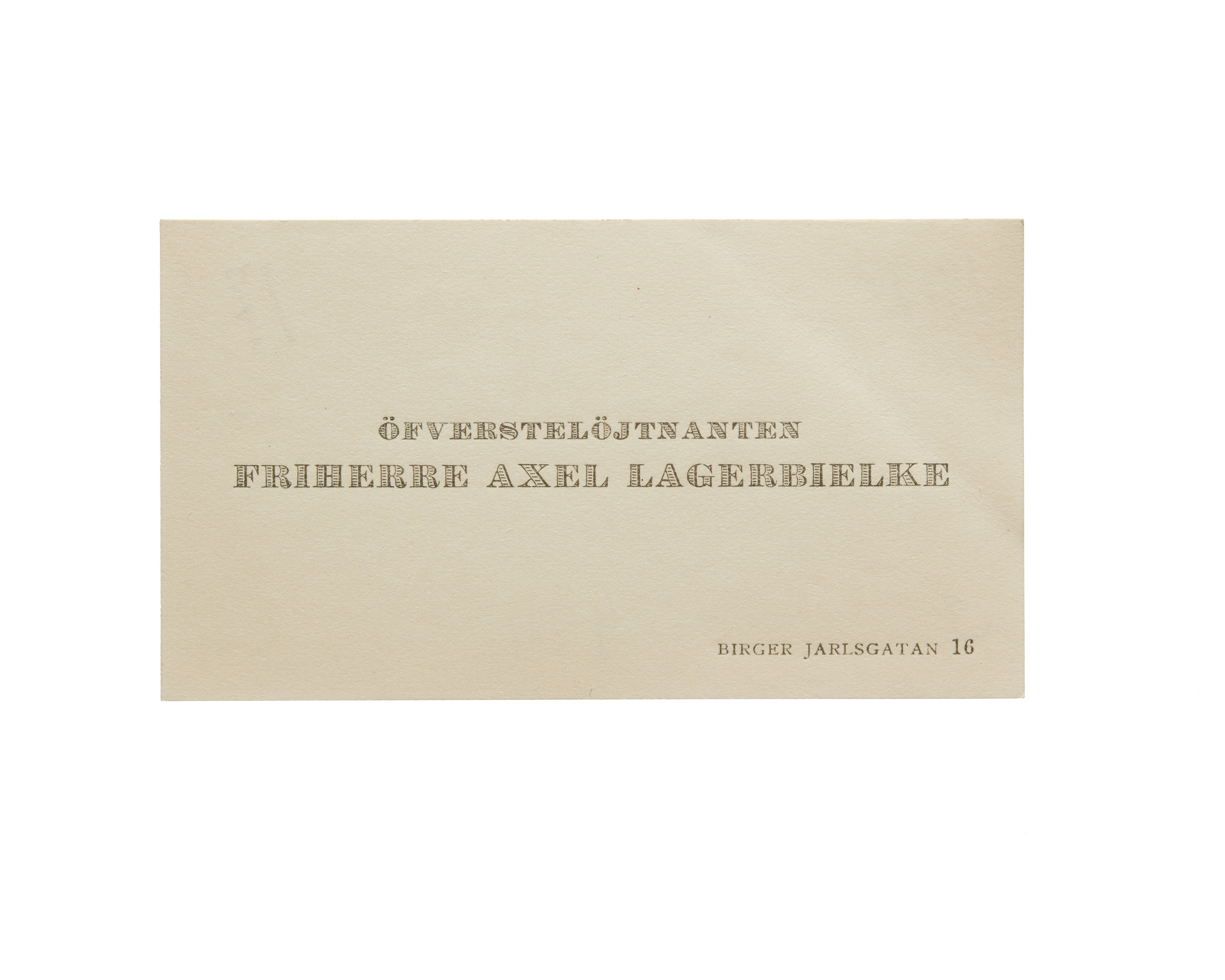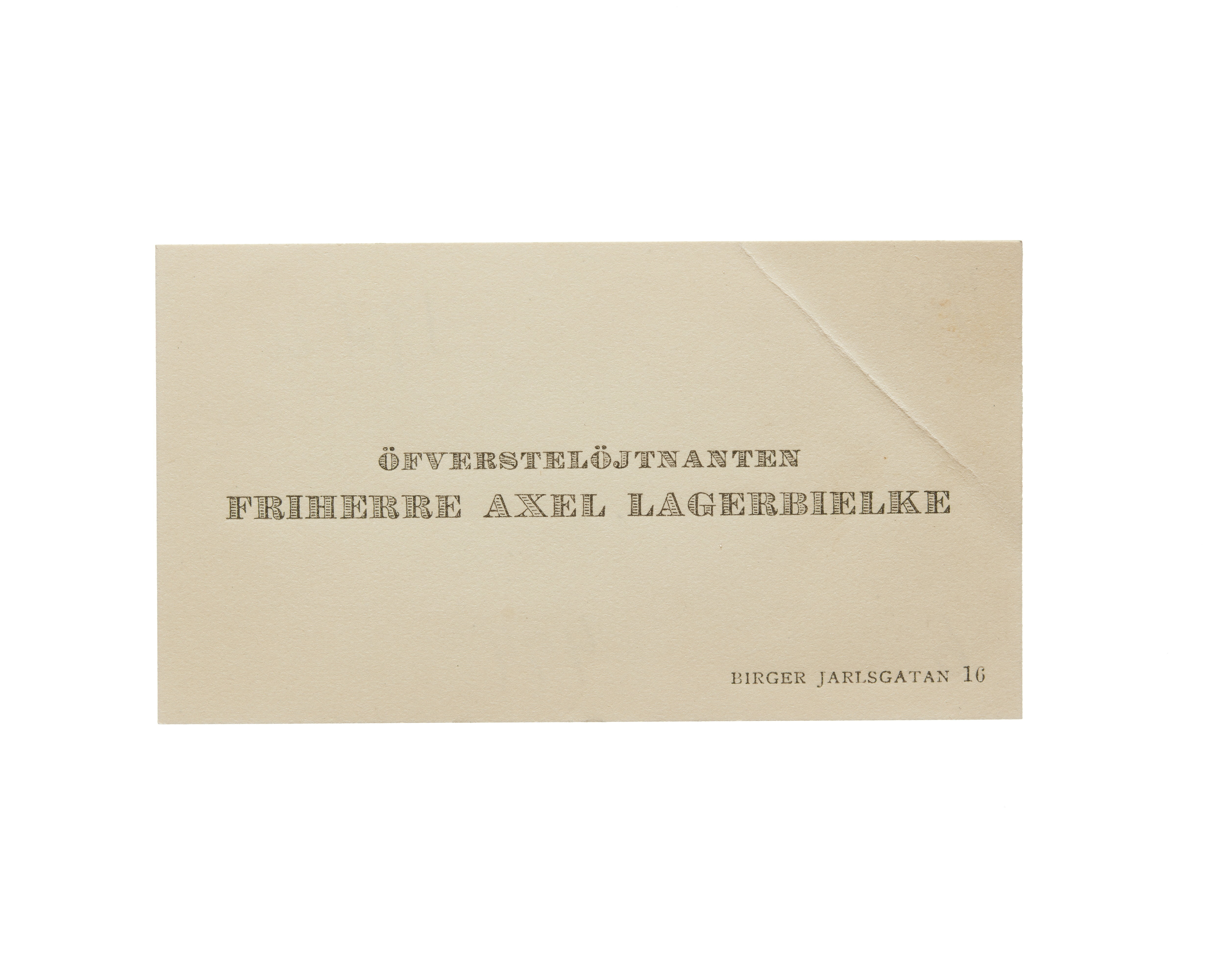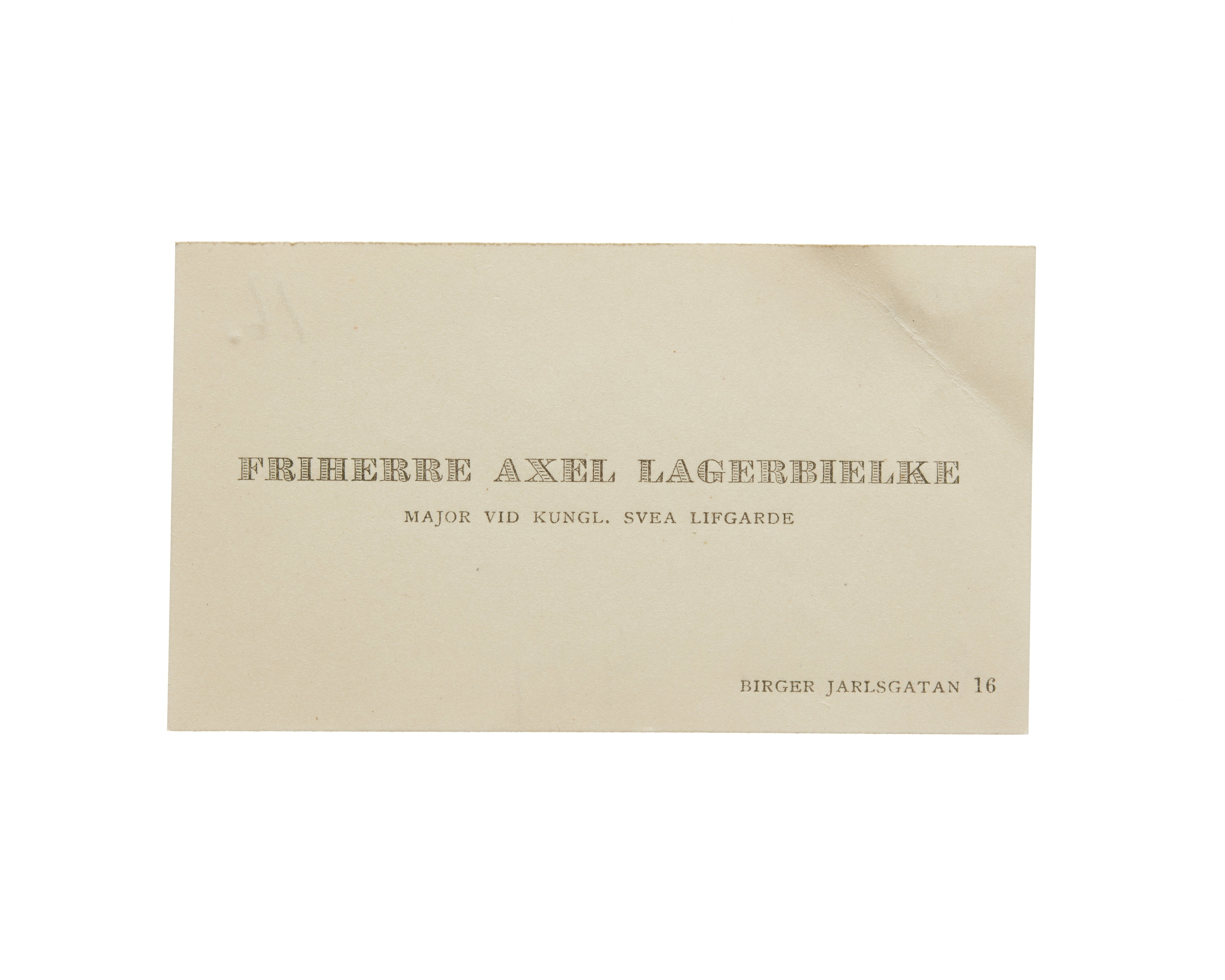 Sju visitkort från Friherre Axel Lagerbielke, Major vid Kungl. Svea livgarde. Första kortet daterat 1914, vikt i övre högra hörnet. Adress (nedre högra hörnet) Birger Jarlsgatan 16. Andra kortet daterat 1916, vikt i övre högra hörnet. Tredje kortet daterat 1917, vikt i övre högra hörnet. Fjärde kortet daterat 1918 samt sorgkant, vikt i övre högra hörnet Femte kortet daterat 1919, vikt i övre högra hörnet. Sjätte kortet daterat 1920, vikt i övre högra hörnet. Sjunde kortet är utan datum, vikt i övre högra hörnet