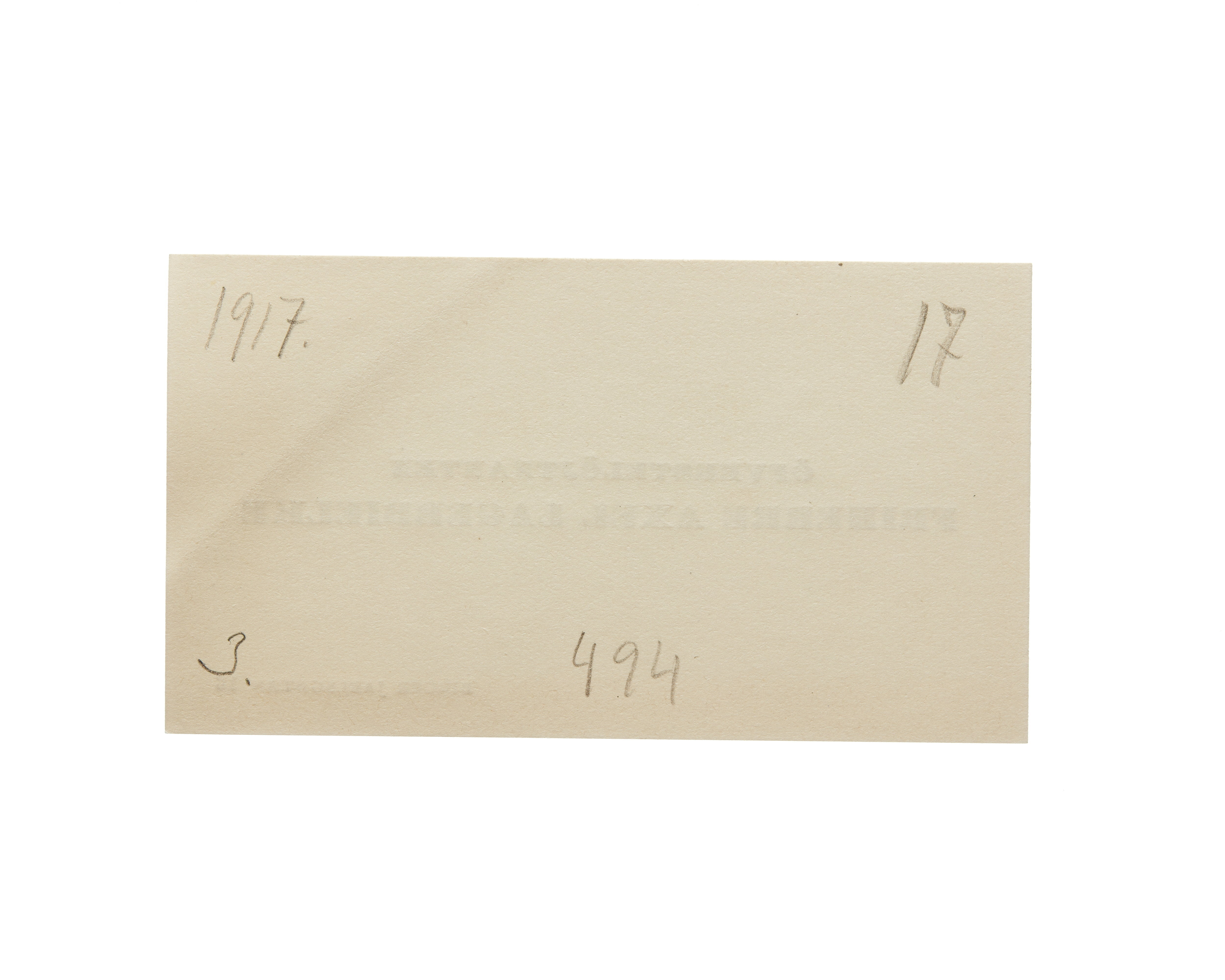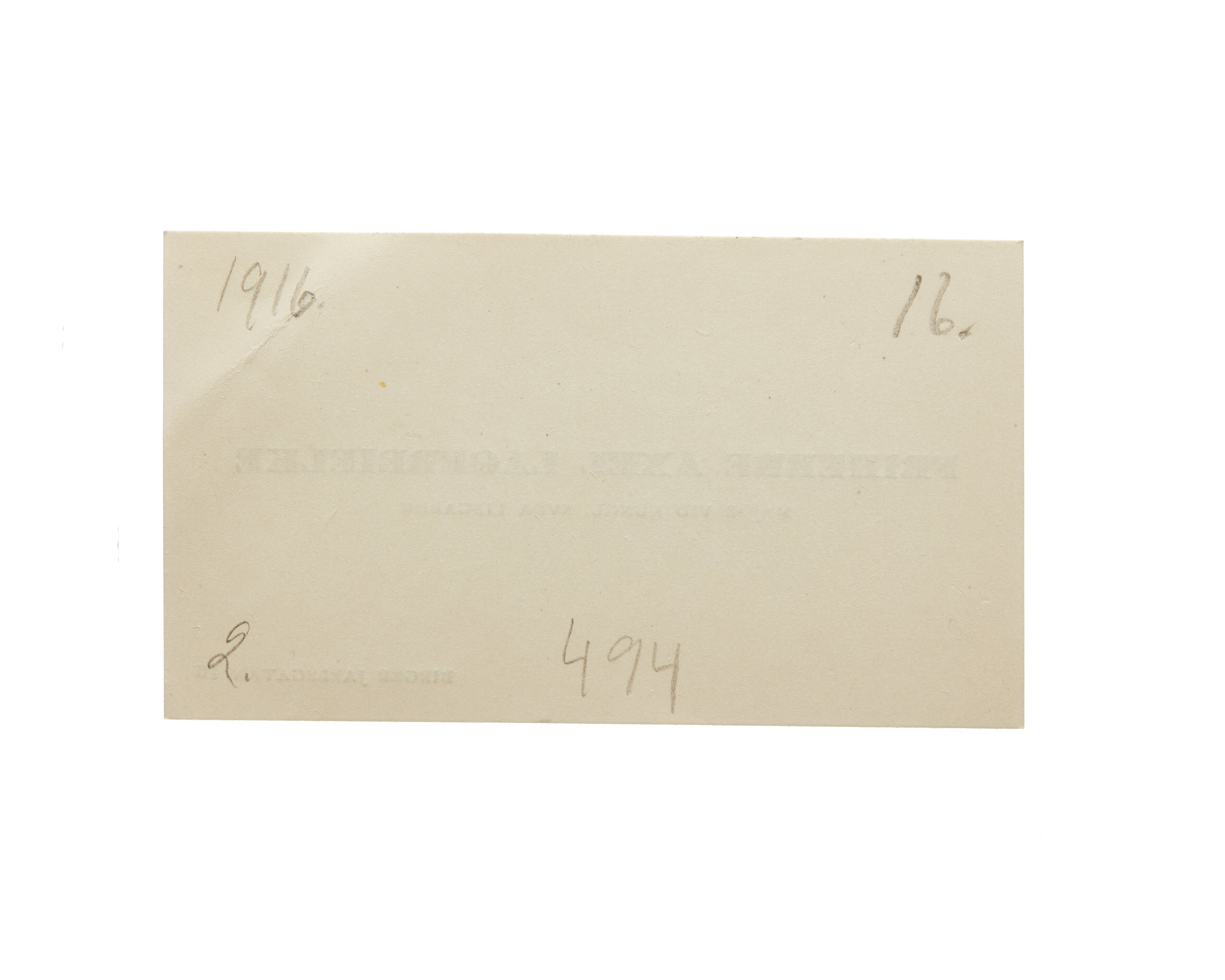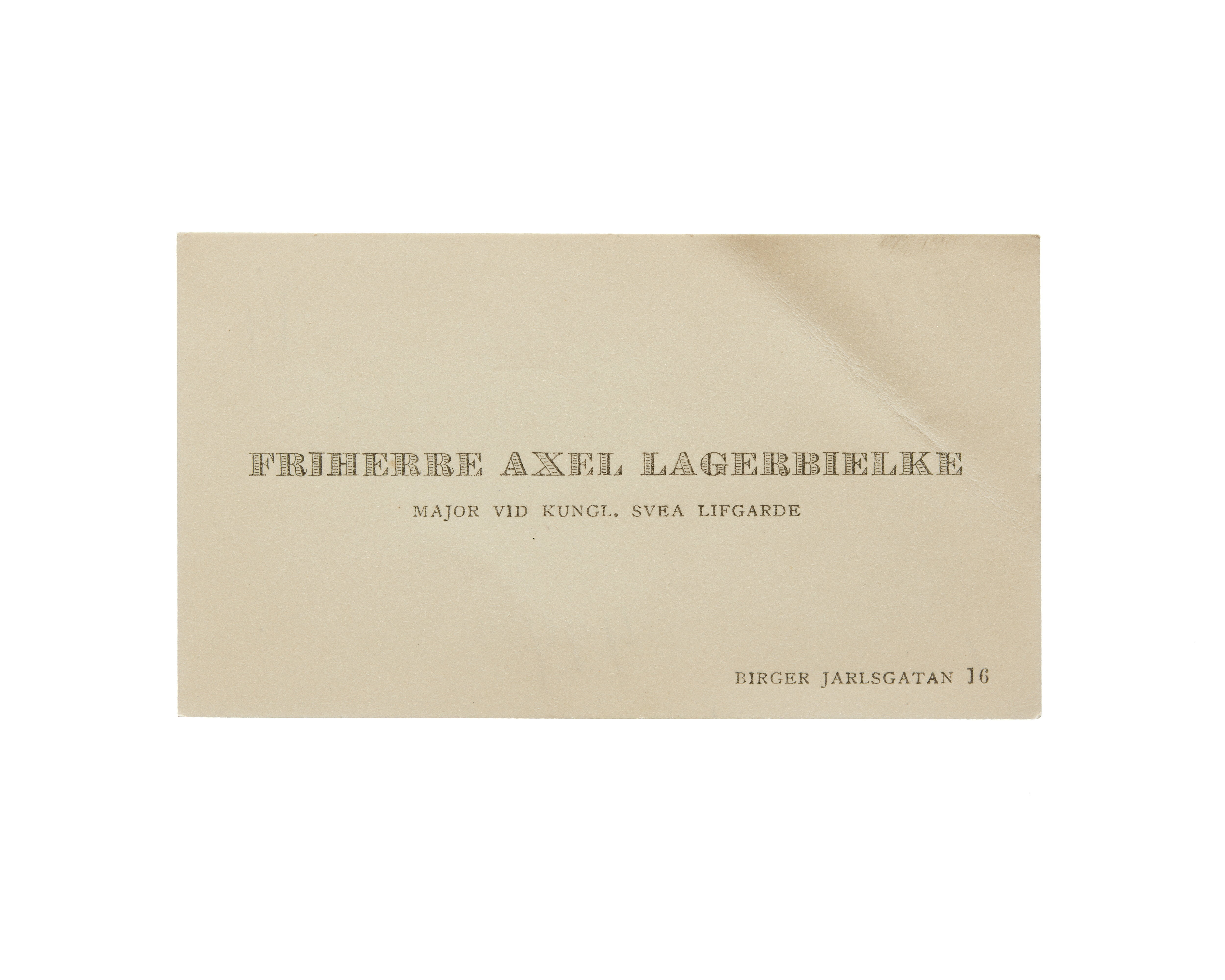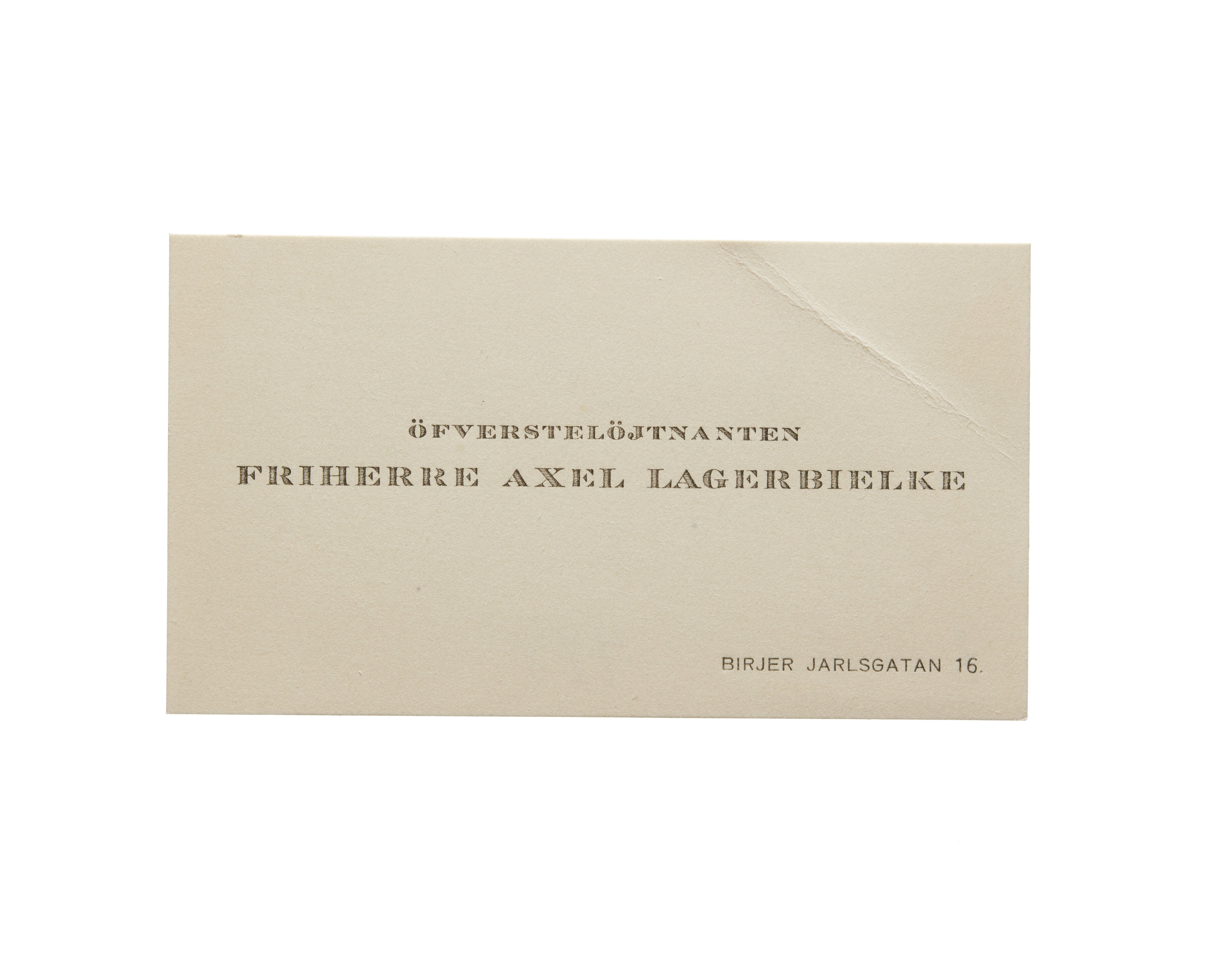 Sju visitkort från Friherre Axel Lagerbielke, Major vid Kungl. Svea livgarde. Första kortet daterat 1914, vikt i övre högra hörnet. Adress (nedre högra hörnet) Birger Jarlsgatan 16. Andra kortet daterat 1916, vikt i övre högra hörnet. Tredje kortet daterat 1917, vikt i övre högra hörnet. Fjärde kortet daterat 1918 samt sorgkant, vikt i övre högra hörnet Femte kortet daterat 1919, vikt i övre högra hörnet. Sjätte kortet daterat 1920, vikt i övre högra hörnet. Sjunde kortet är utan datum, vikt i övre högra hörnet