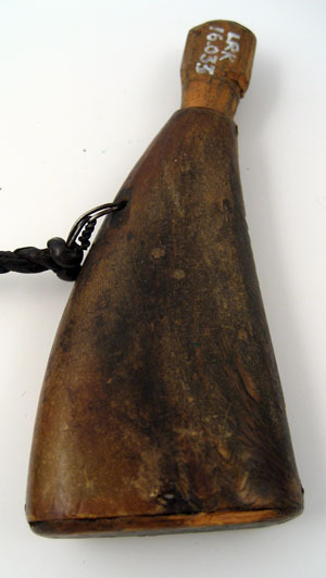 Kruthorn av flatpressat brunt kohorn, svängt åt sidan och uppåt avsmalnande. Oval bottenplatta av trä, fäst i sidorna med fyra nitar. Upptill i ryggen ett borrat hål med ögla av ståltråd med läderrem, fästad vid mässingsring i kruttyget. Instucken i pipen en 35 mm lång träplugg.