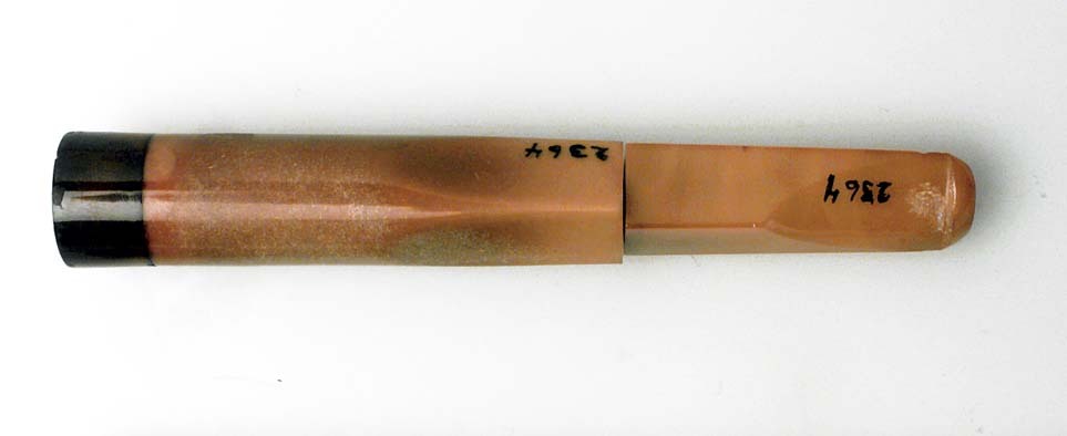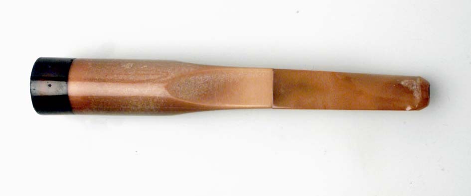 Munstycke till cigarett i tre delar. Mynningen är gjord av klar, brun bärnsten, som är bränd på framsidan. Mellanstycke är av av brungul sjöskum, rund vid mynningsdelen, fyrsidig i andra änden. Munstycket är av gul, opak bärnsten som är fyrsidig mot mellanstycket, tvärt övergående till spetsoval mot andra änden.