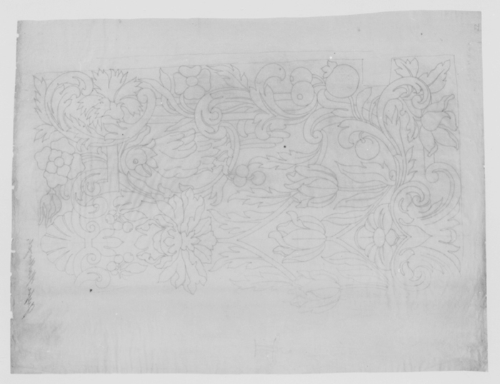 MÖNSTERFÖRLAGA, till möbelklädsel. Utförd med blyerts på transparent papper (avritat från mönsterförlaga A.20) Linjerna är punkterade för mönsteröverföring. Påskrift: "Grefve Hallwyl" Mått: H 77.4cm B 58.1 cm Gåva 1943 från arkitekt Gustaf Clason (se protokoll 54 º 4)