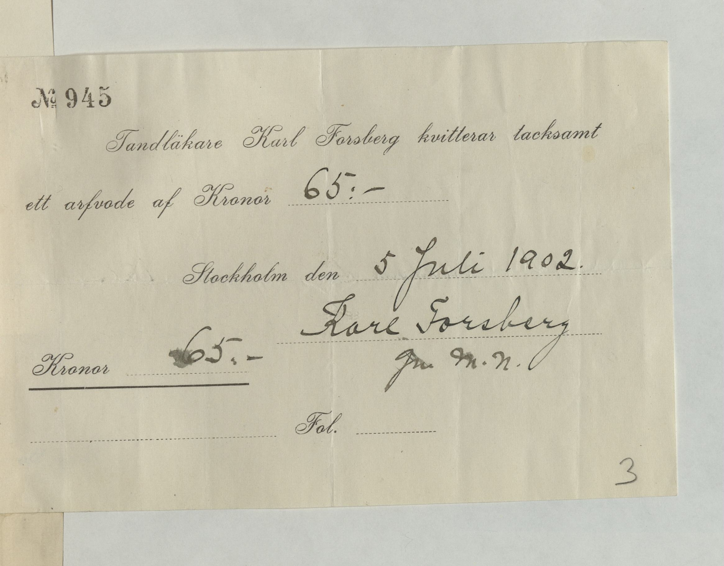 Räkning för besök hos tandläkare Karl Forsberg, 1900-1922