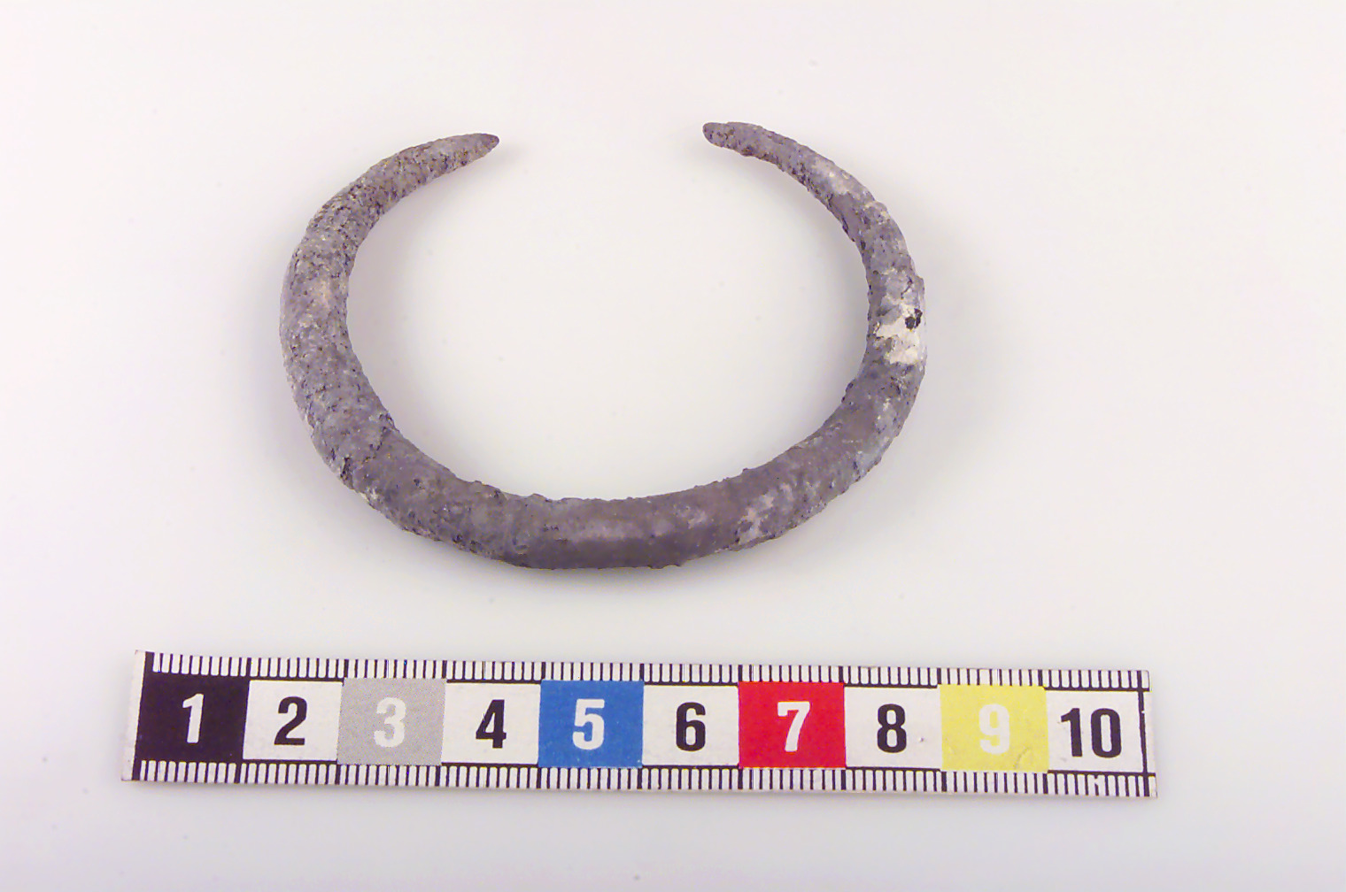 Av ten med rundat tvärsnitt, avsmalnande i ändarna (spetsiga). Kraftigt korroderad. Ornerad med trianglar i rader?
