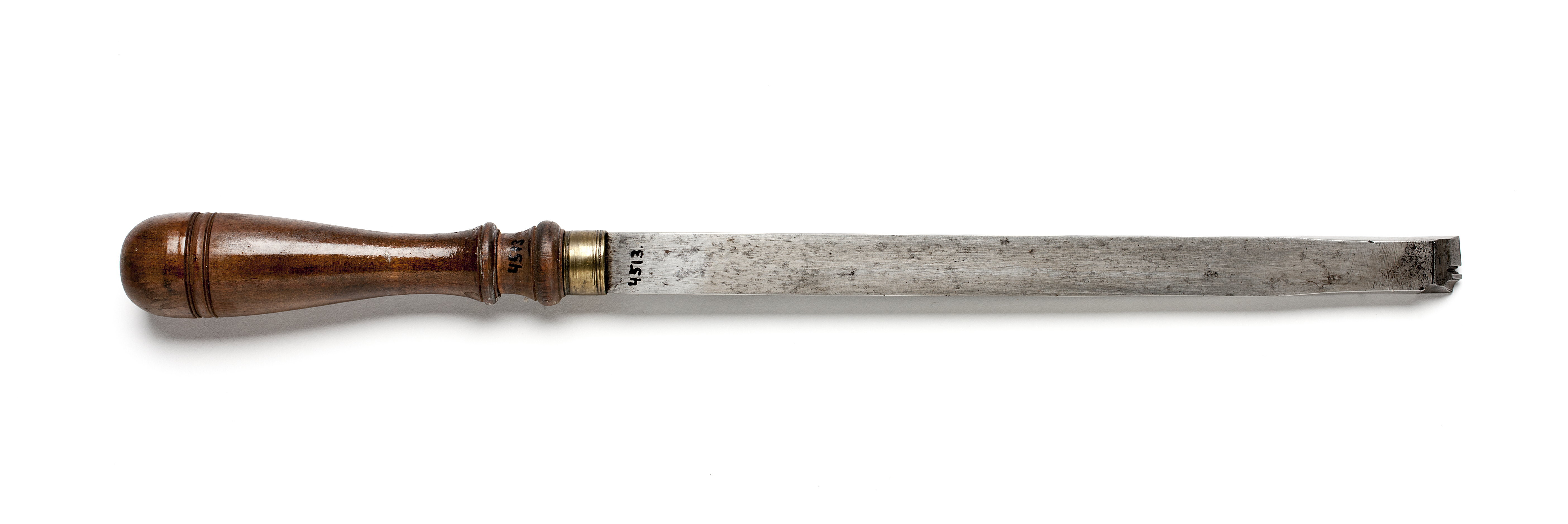 Klinga med rektangulär genomskärning. Profilerad egg. Stämplat på klingan: "EP" och "P" (proberstämpel). Svarvat skaft av päronträ, med två vulster nedtill ("rydboholmstyp"). Mässingsring. Stämplet på skaftet: "I".