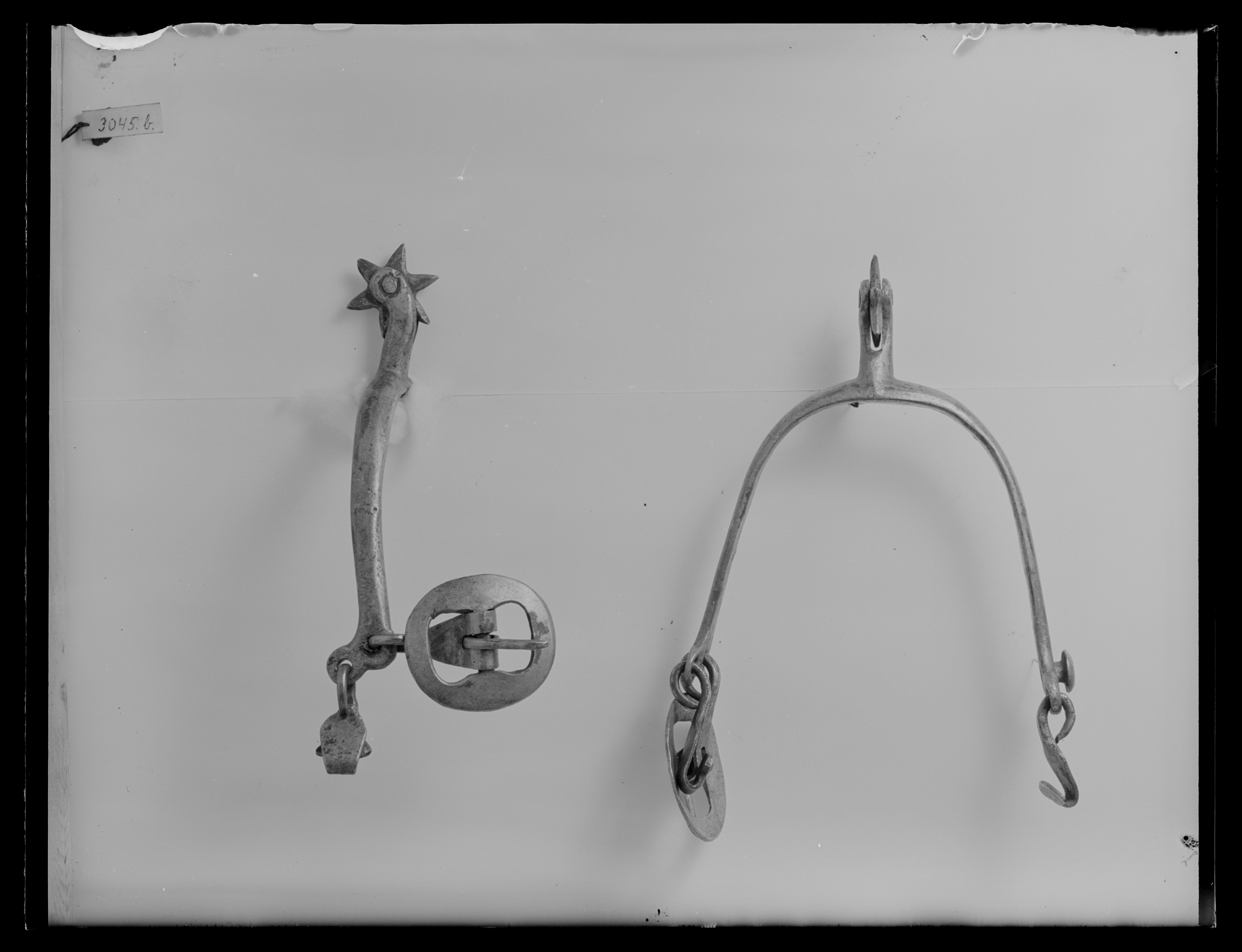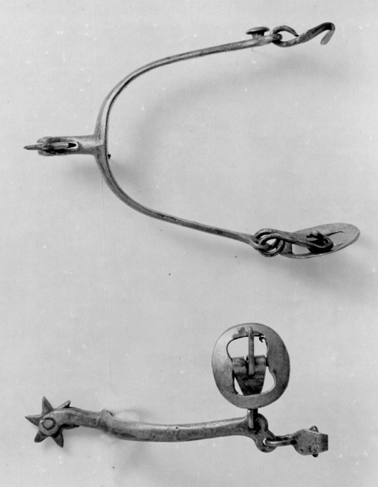 Sporre av förtent stål med u-formade skänklar och 28 mm lång hals något nedåtböjd med sexuddig klinga. Vid ena skänkelns ände en rund slät knapp på kort hals samt en hake (för hålfotsrem). I den andra änden stor oval remsölja samt hake.