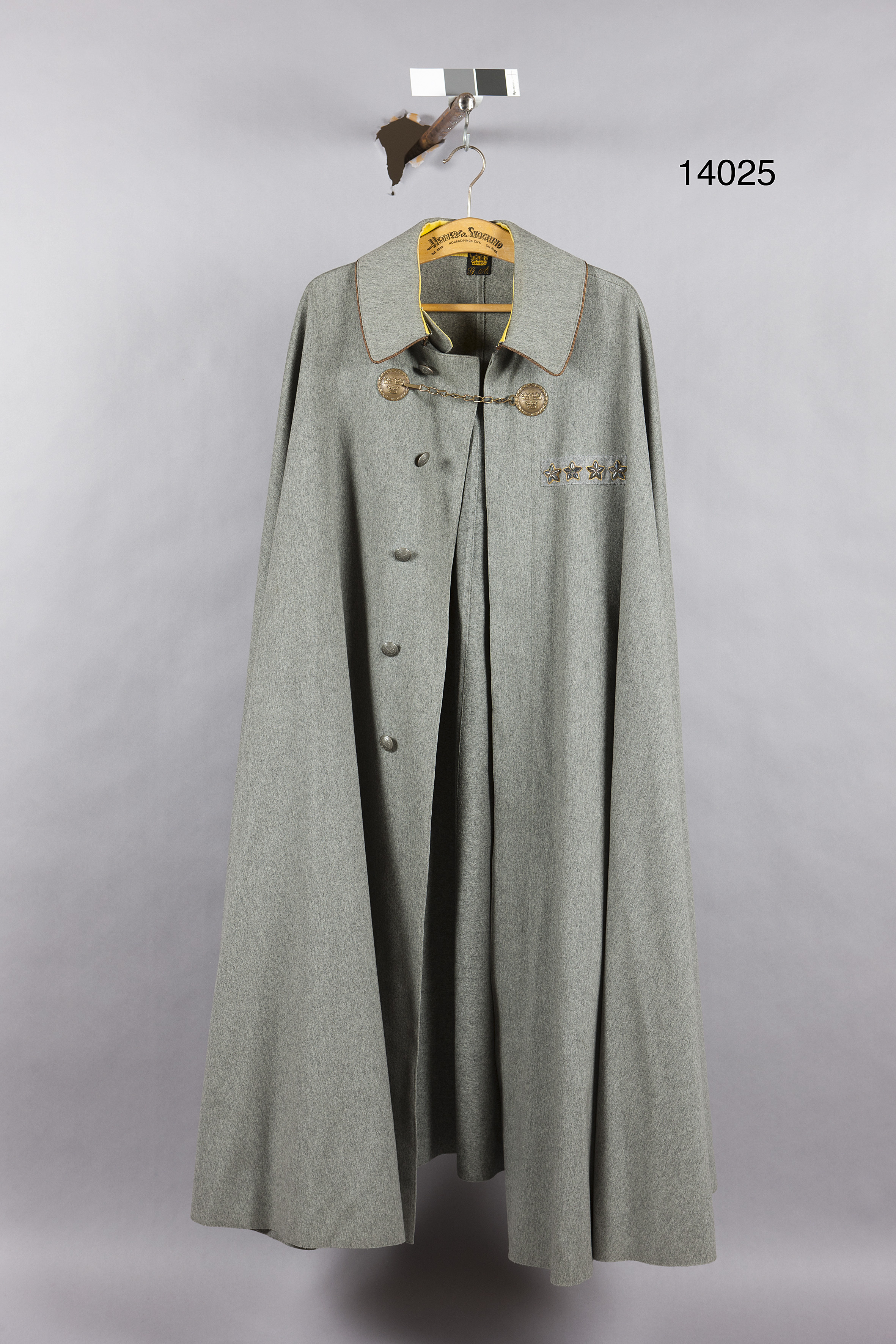 Regnkrage av grått kläde. Kragen kantad med guldsnåd. Dold knäppning med fem generalstabsknappar. mitt fram två runda mattförgyllda beslag med kedja. Invändigt på kragen, gul klädeslist samt ett fastsytt märke med öppen krona och "G.A." På vänster sida en lös påsydd ljusgrå rektangulär klädesbit med fyra stjärnor av guldlan.