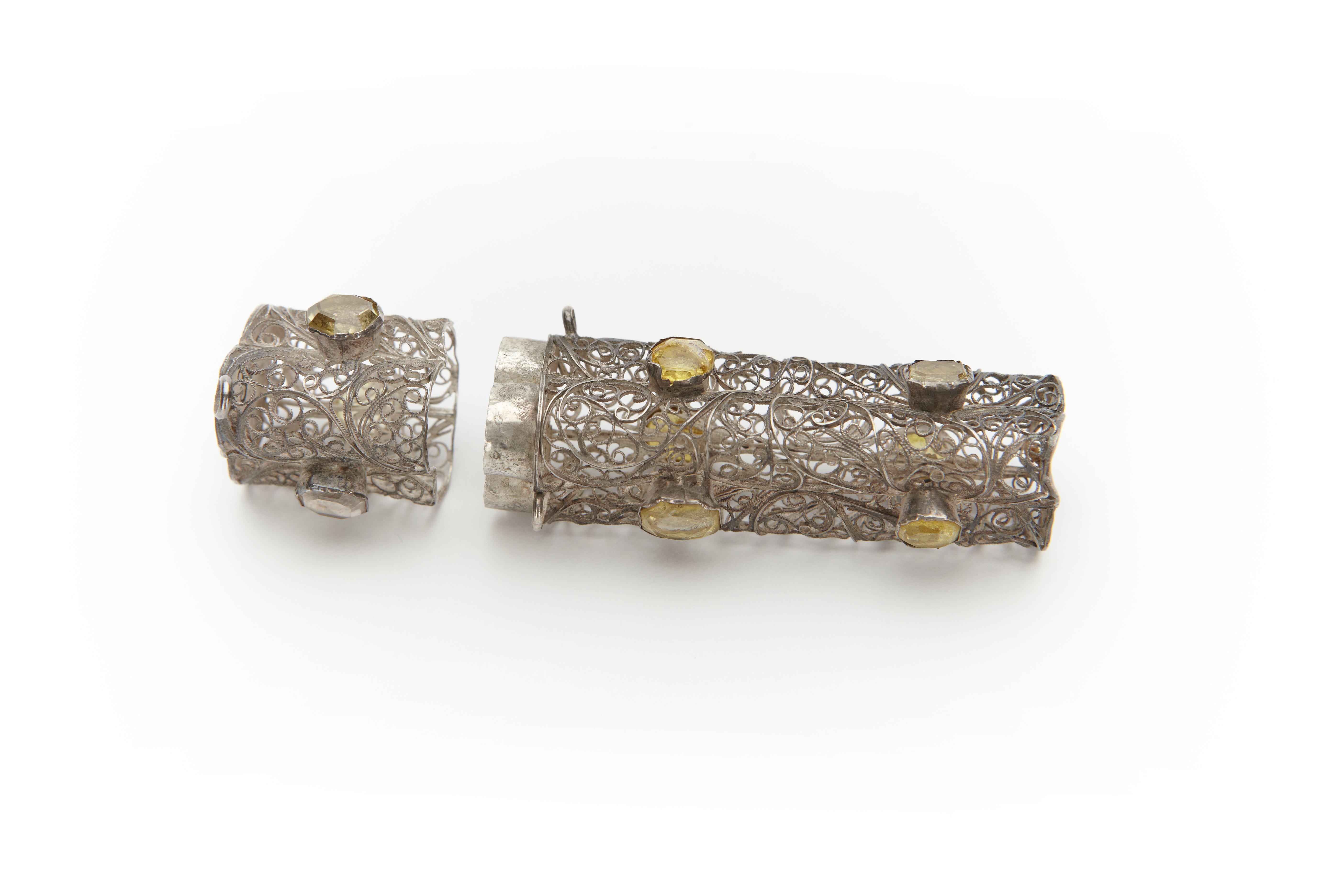 Etui av silverfiligran med trepassformig genomskärning besatt med nio stenar av gult glas.