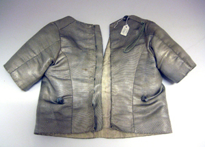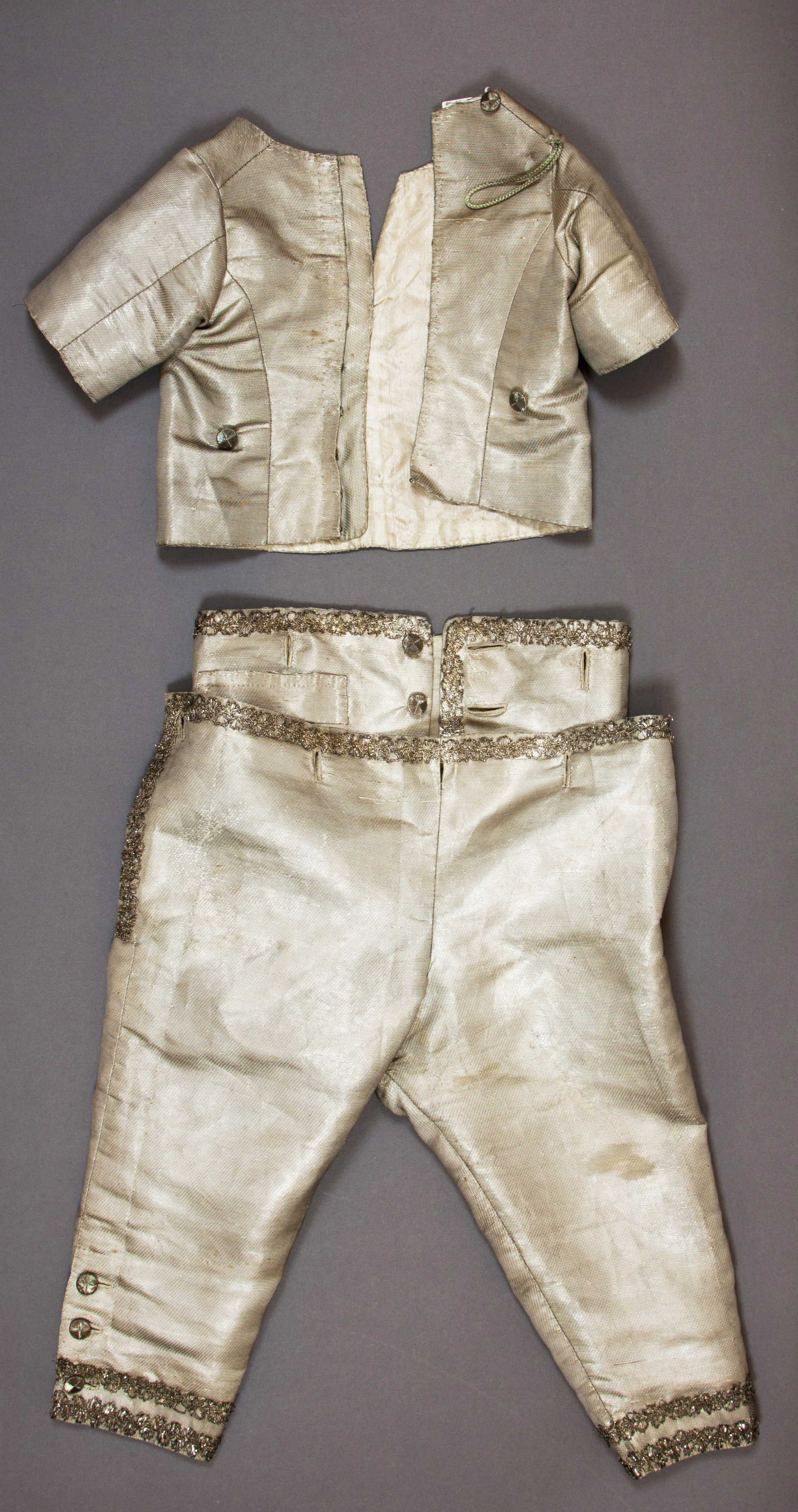 Barntröja av silvertyg garnerad med silverspets. Halsringningen är rundad och mitt fram har tröjan ett halssprund, kantat av uppvikta, fastsydda slag. Slagen kantas av silverspets. Mitt fram över sömmen som sammanfogar framstyckena, är påsytt en silverspets. Ärmarna är långa, sydda av två stycken. Tröjan är helt öppen bak. Den knäpps med tio hakar och hyskor av metall. På bakstycket samt på framstycket sitter fyra små knappar, överlkädda med silvertråd, dvs två knappar fram- och två knappar bak. Uppe på höger axel sitter en knapp för fäste av en rock. Intill knappen sitter en snodd av ljusgrön silketråd. Tröjan är på insidan fodrad med vit sidenatlas.