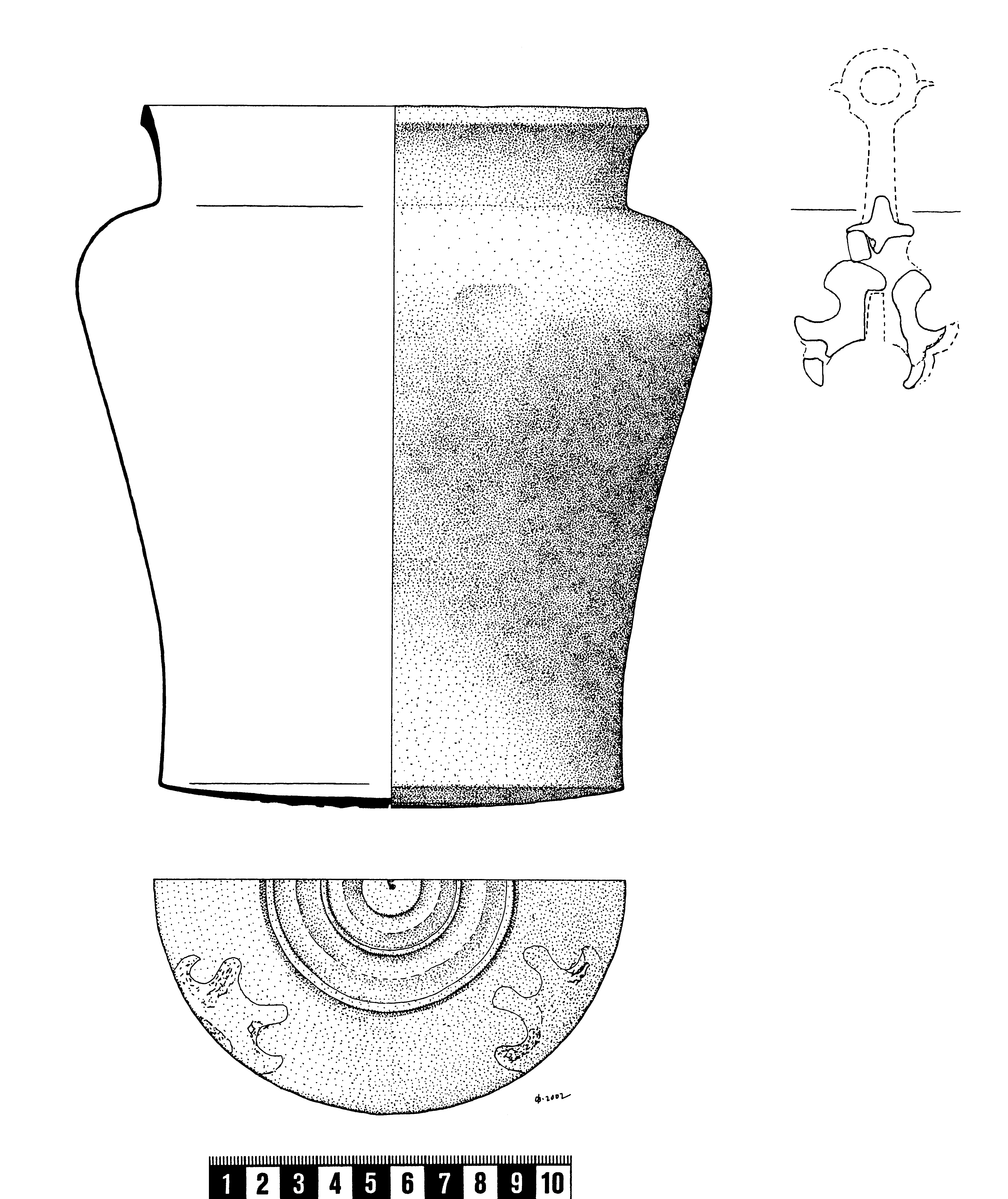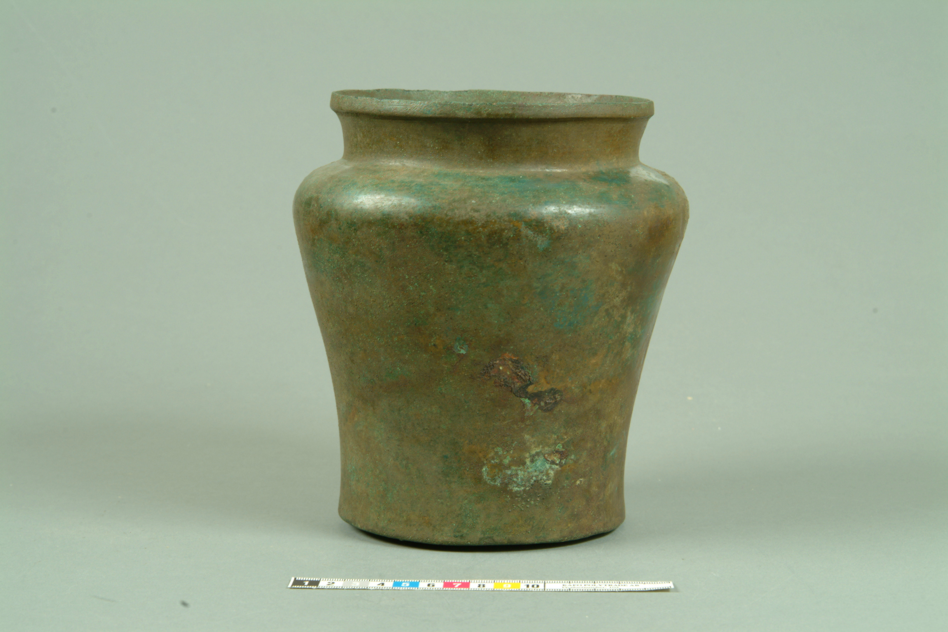 Bronssitula av relativt kraftig plåt, den veritkala skarven fullt märkbar, bottenplattan fastlödd, troligen gjuten och därefter försedd med svarvade, koncentriska cirklar, av hankfästerna är endast lödspåren bevarade. Romerskt arbete.