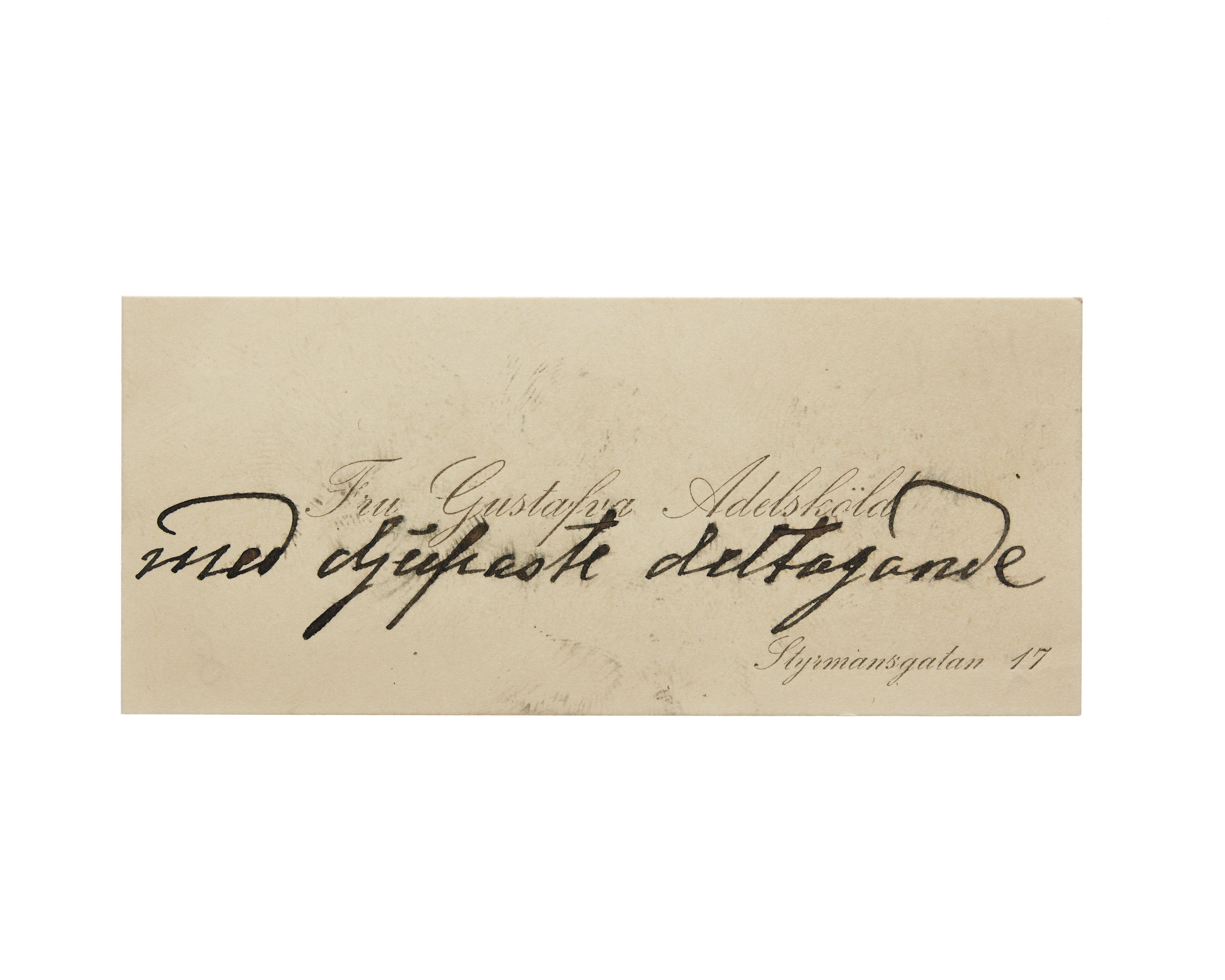 Visitkort från Fru Gustafva Adelsköld Född Brolin.