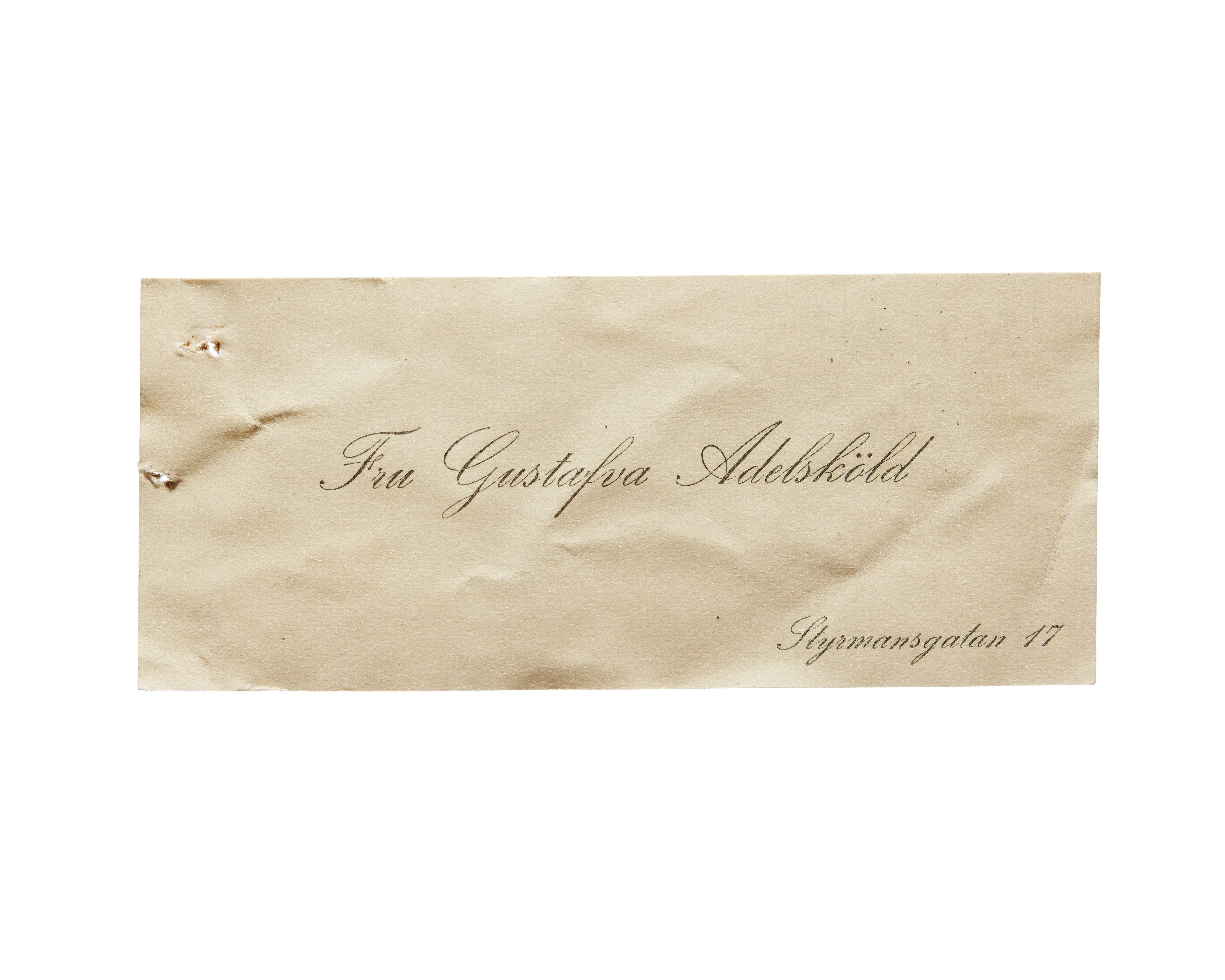 Fyra visitkort från Fru Gustafva Adelsköld Född Brolin. Första kortet daterat 1915, vikt i övre vänstra hörnet. Andra kortet daterat 1921, adress (nedre högra hörnet) Styrmansgatan 17. Otydligt handskrift nedre namnet. Tredje kortet daterat 1924, samma adress i nedre högra hörnet. Fjärde kortet daterat 1930, ovanför namnet handskrift "Med varmaste deltagande i den djupa sorgen", nedre namnet handskrift "Bib Adelsköld".