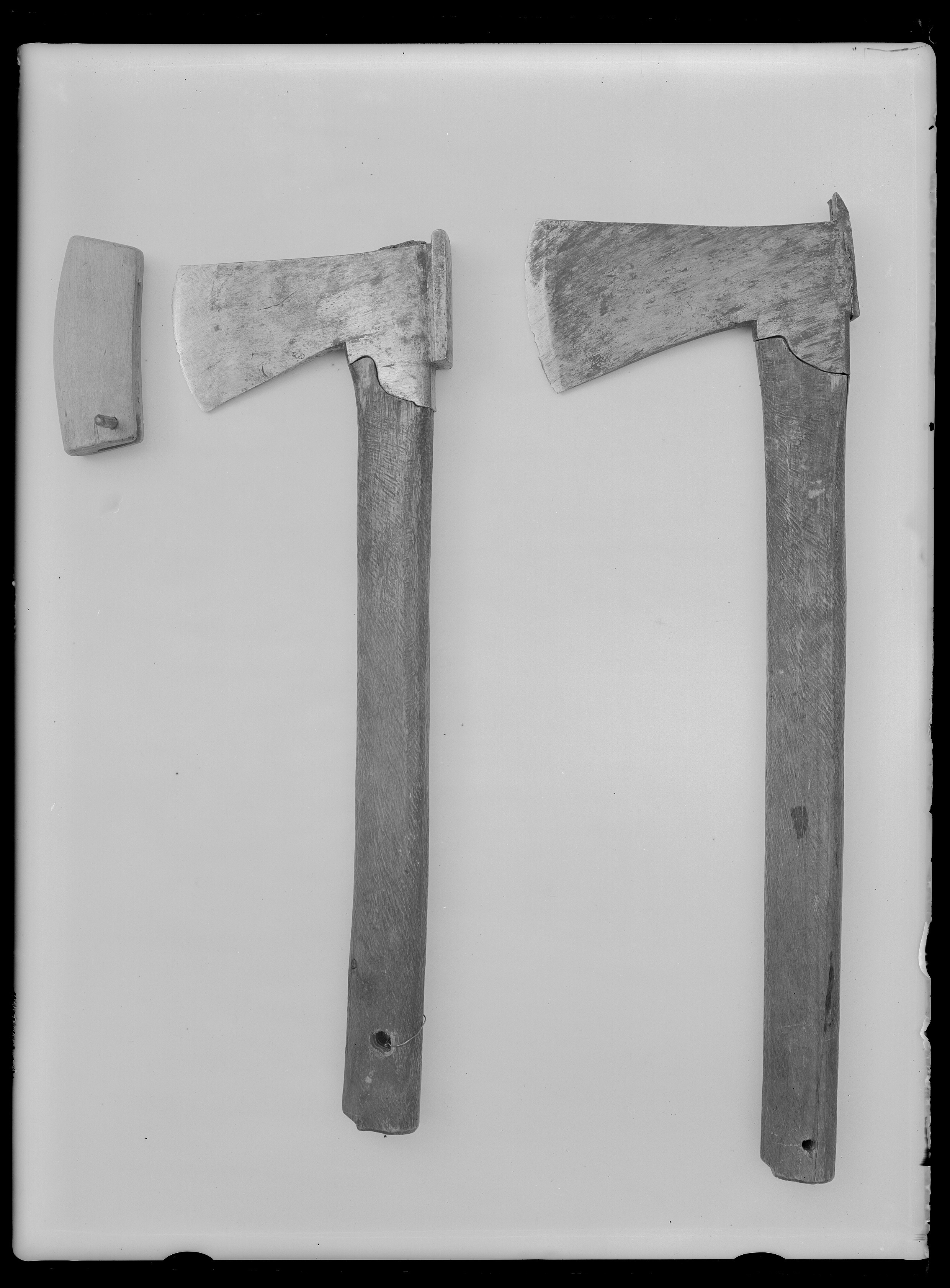 Yxa med något framdragen, markerad nacke och skafthålet utdragen till en kort holk. Bågformig egg. Rakt, skuret skaft med ovalt tvärsnitt och hål för handögla.