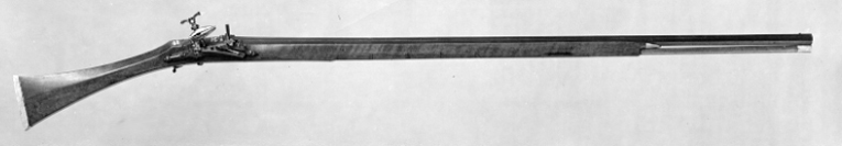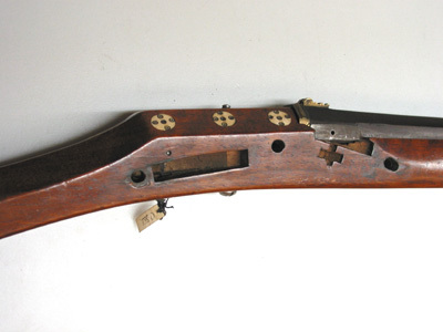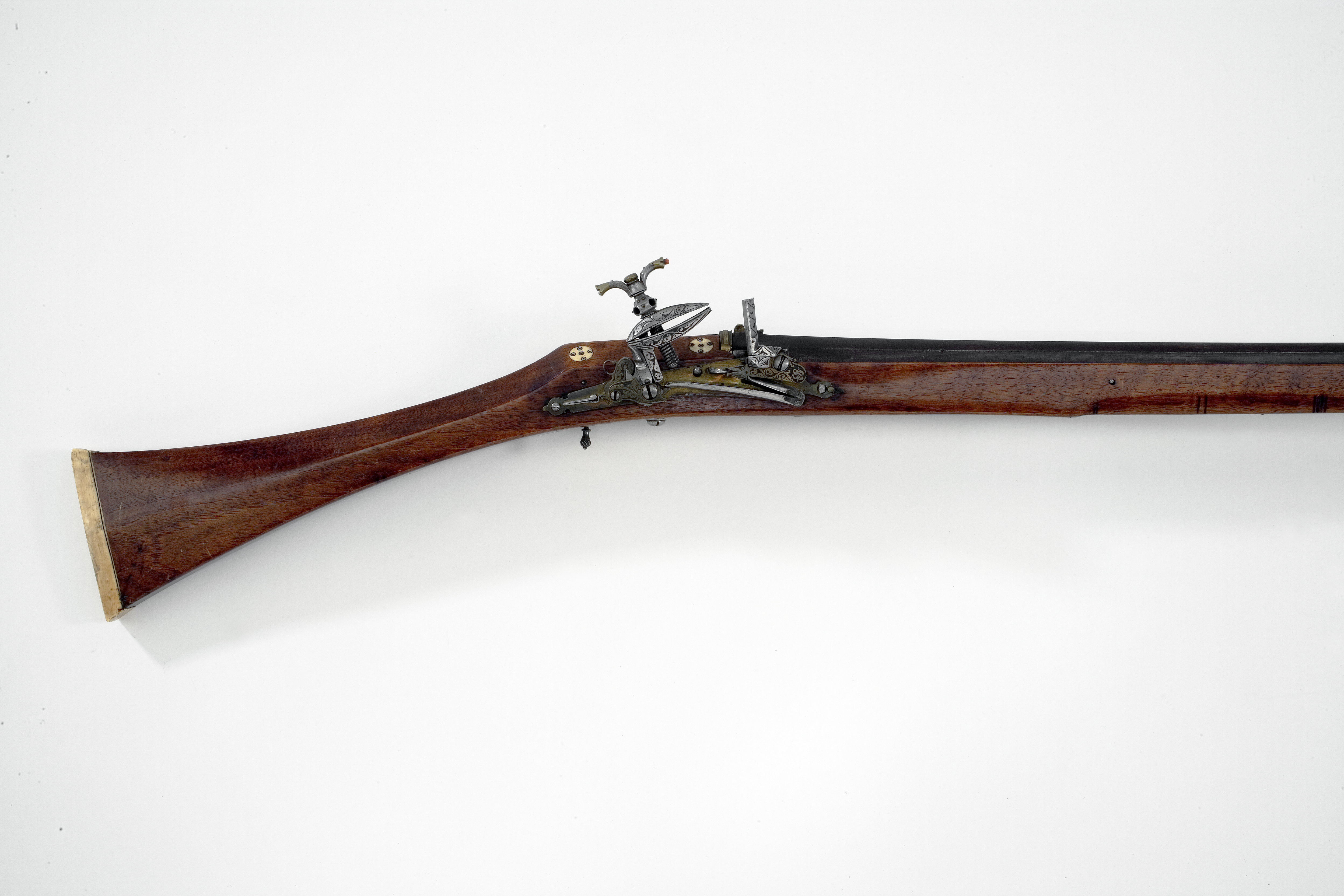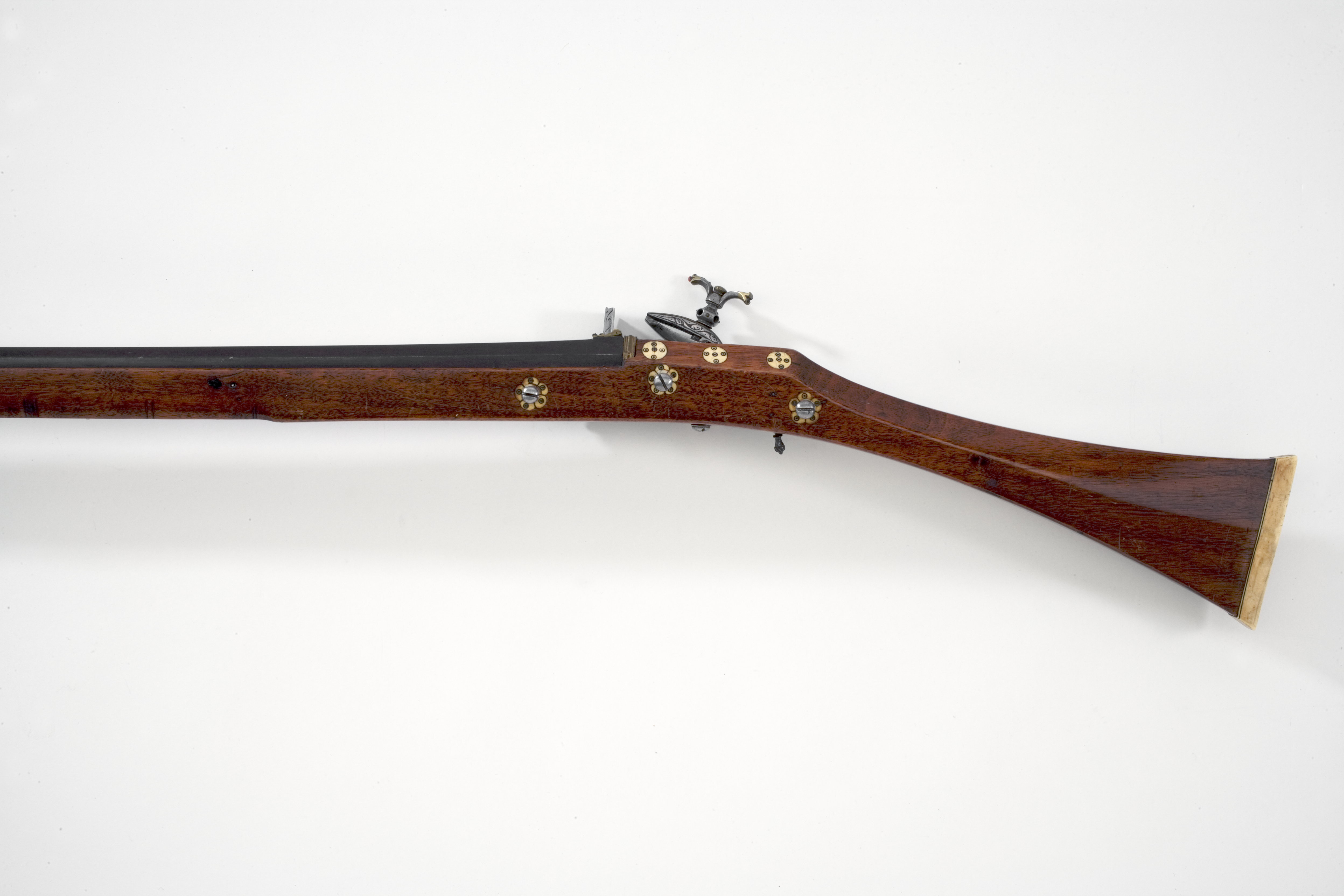 Åttsidig, brunerad, slätborrad pipa. Svansskruvblad täckt på ovansidan med mässingsvulst och mässingsplatta med bladrankor i relief mot mörk bakgrund. Över fänghålet pålagt en stålplatta med ett nytt fänghål. Riktmedel: Vid pipbasen kulissikte av mässing. Knoppkorn av mässing. Fästning: Två häften. Pipan fäst med krysskruv underifrån samt två pipstift av stål. Snapplås alla romana av arabisk typ (se Stone sid. 235 fig. 290:1), helt utanpåliggande, endast urtag i stocken för invändiga låsdelar. Plant låsbleck täckt med mässingsplatta, på kanterna punsade rankor. Hane med säkring på hälen. Rektangulära, kraftiga käkar med fasade kanter, punsad rankdekor. Käkskruv med kraftigt profilerat huvud, nedtill balusterformigt med två genomgående, korsande hål, dekor av mässingsnitar. Därovanför ett ving-formigt, vridbart fingergrepp med mässingsskodda ändar, däri infattat korallkulor (den ena saknas). Hanstudel i from av mässingsplatta med bladrankor i relief mot mörk bakgrund. Säkringshake täckt av mässingsplatta, rankdekor, på ryggen en bandring. Utvändig säkringsfjäder. Rektangulär fängpanna med fasetterad ände, rankdekor. Nästan rätvinkligt batteri med räfflad slagyta, eldstålets rygg plan med fasade kanter, rankdekor mor mörk bakgrund. Fängpannelock med profilerad översida. Över batterifjädern en skärm täckt av mässingsplatta med rankdekor. Utvändigt slagfjäder med rundat fasade kanter, över vinkeln har troligen suttit en mässingsplatta. Fästning: Tre låsskruvar. Låset ligger utanpå stocken, urtagning enbart för avtryckaren, slagfjäderns fästplatta och fängpannan. Avtryckare med kulformig, spiralräfflad ände. Konturerat avtryckarbleck med tio cirklar. Trekvartsstock av ljusbrunt trä, som slutar 288 mm från mynningen. Sluten laddstocksränna, från piprännan borrat 15 hål ner till laddstocksrännan, samt hål vid främre låsskruven och de båda pipstiften. Triangulär kolv med rektangulärt, svagt sexsidigt tvärsnitt. Framstock med rekangulärt tvärsnitt. Kolvände av ben, b. 13 mm. Bakom svansskruvbladet en benplatta med mittlinje, därbakom en droppformig benplatta, dekorerad med sex cirklar med mittpunkt. På sidorna av svansskruvblade-benplatta 2x3 runda benplattor med vardera fem cirklar. Näsband av ben. Framför avtryckarblecket en rombisk krysskruvbricka med fyra cirklar. Tillbehör: Laddstock av trä, l: 1125 mm, framtill benskoning, l: 28 mm