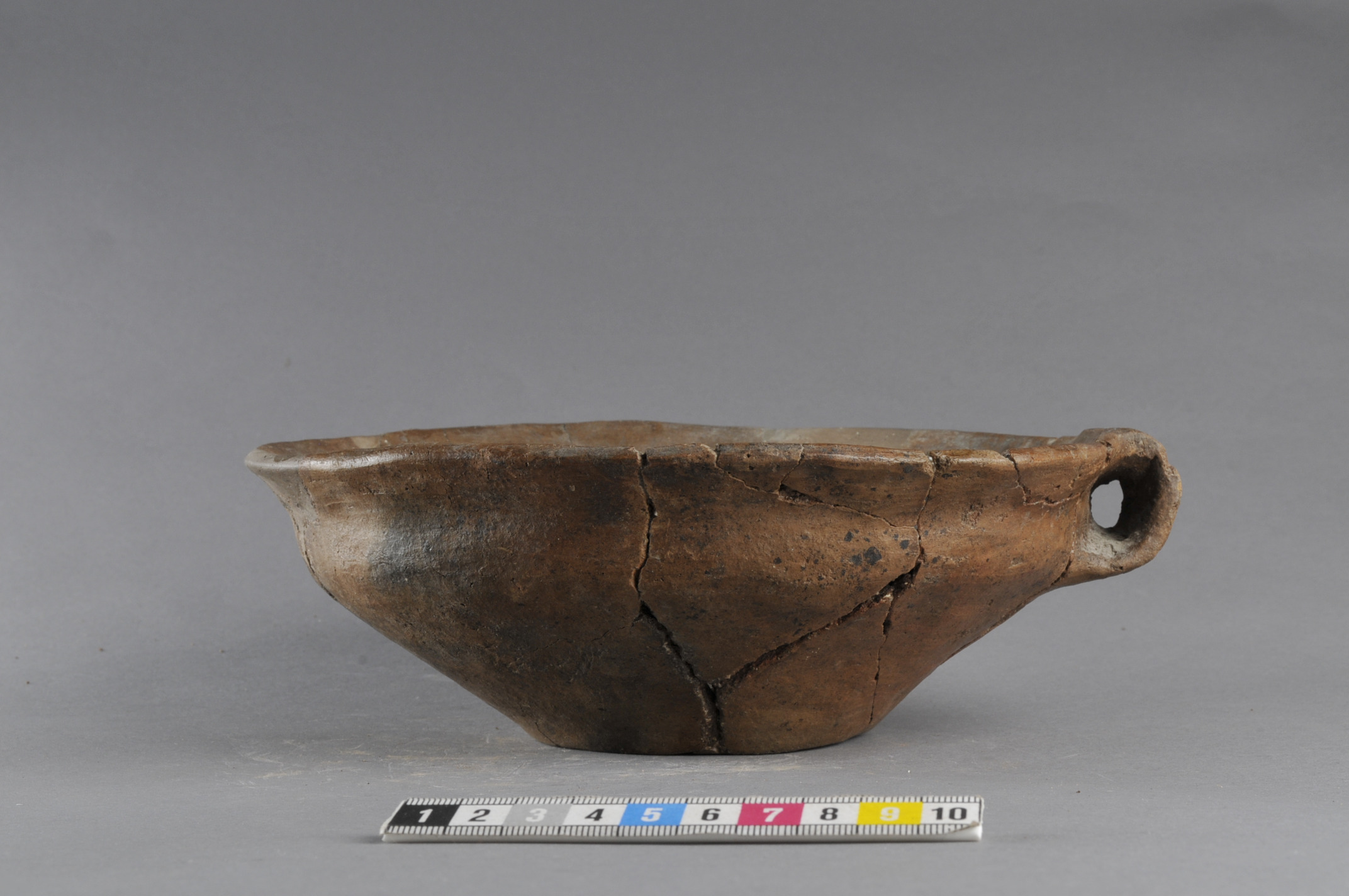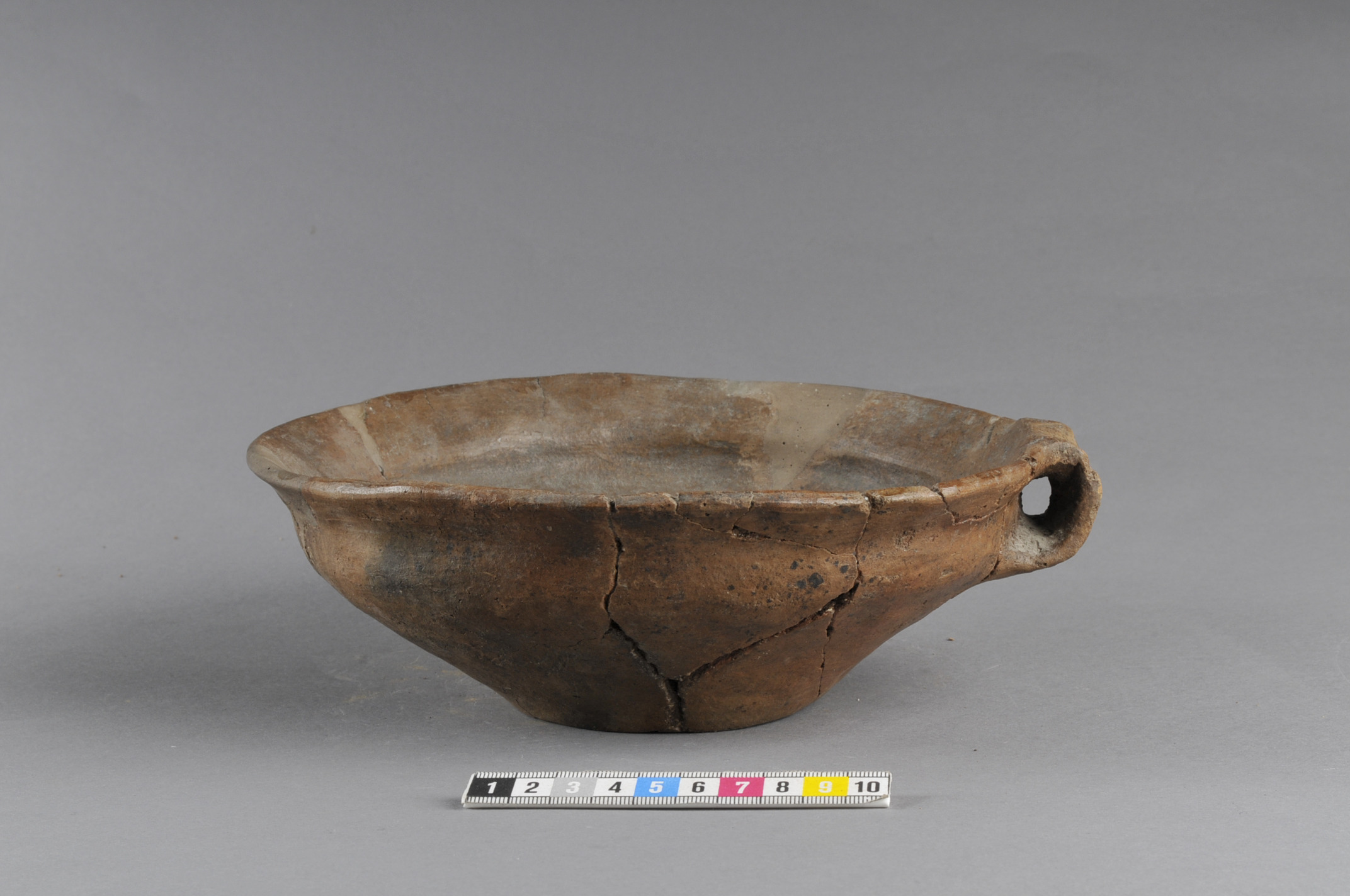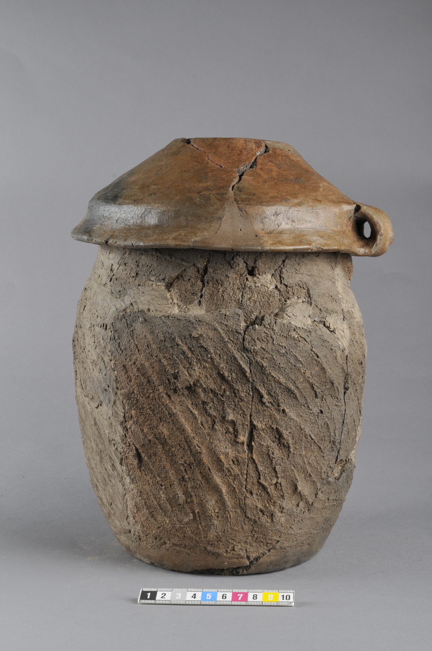 Nästintill intakt men rekonstruerad skål med bandformig hänkel. Godset är polerat. Botten lätt rundad och uppskjutande. Lock till urna
