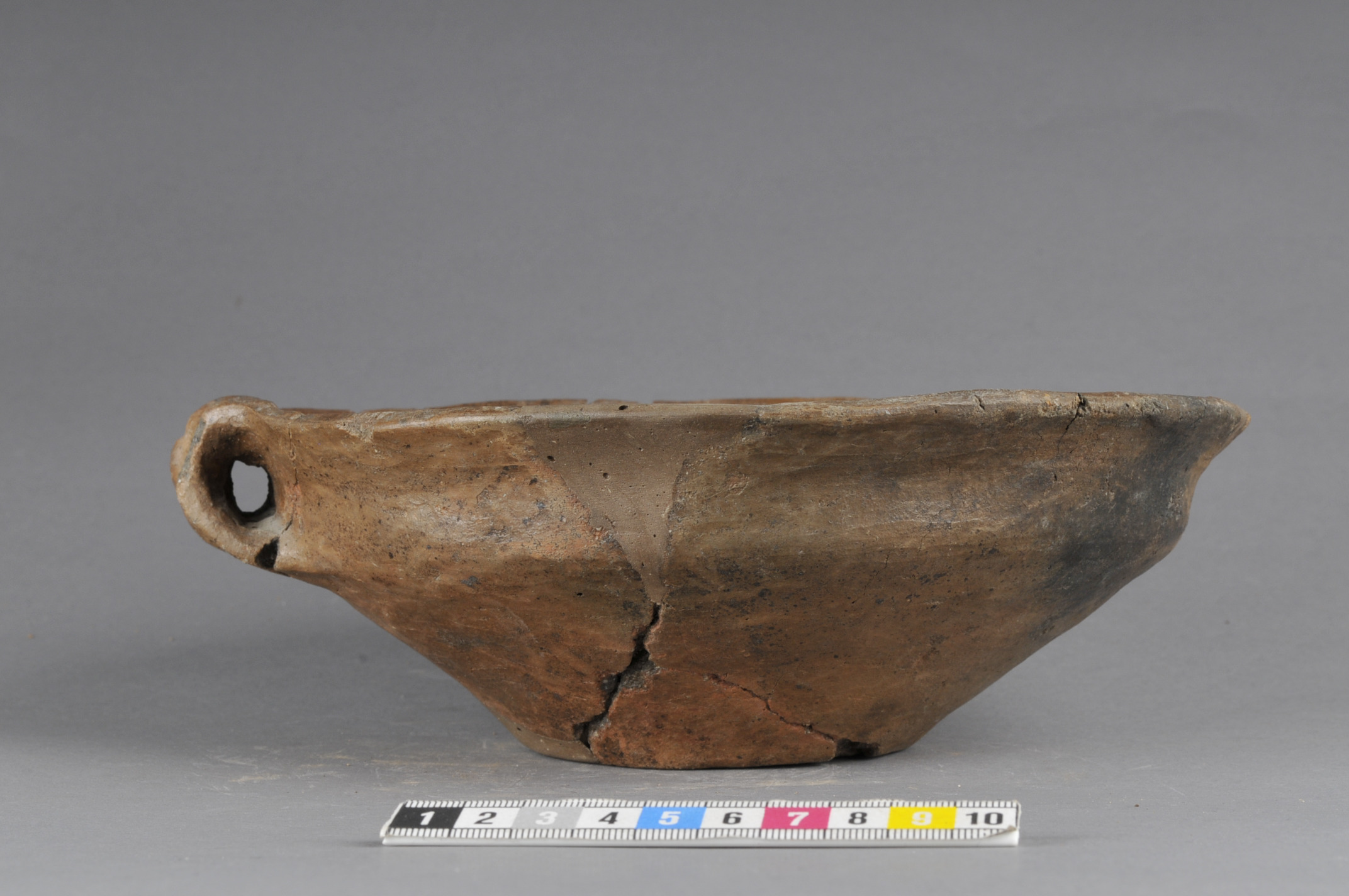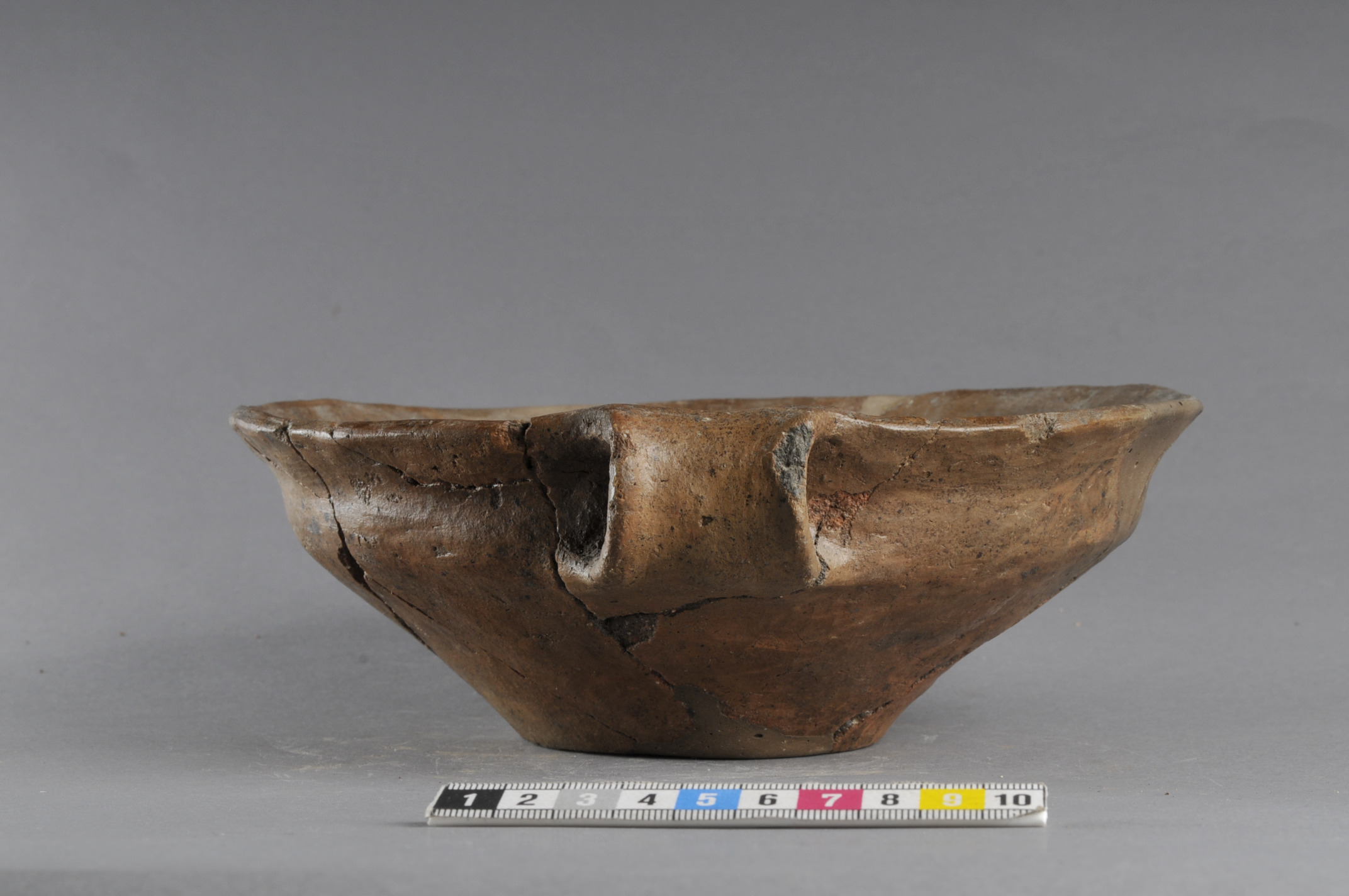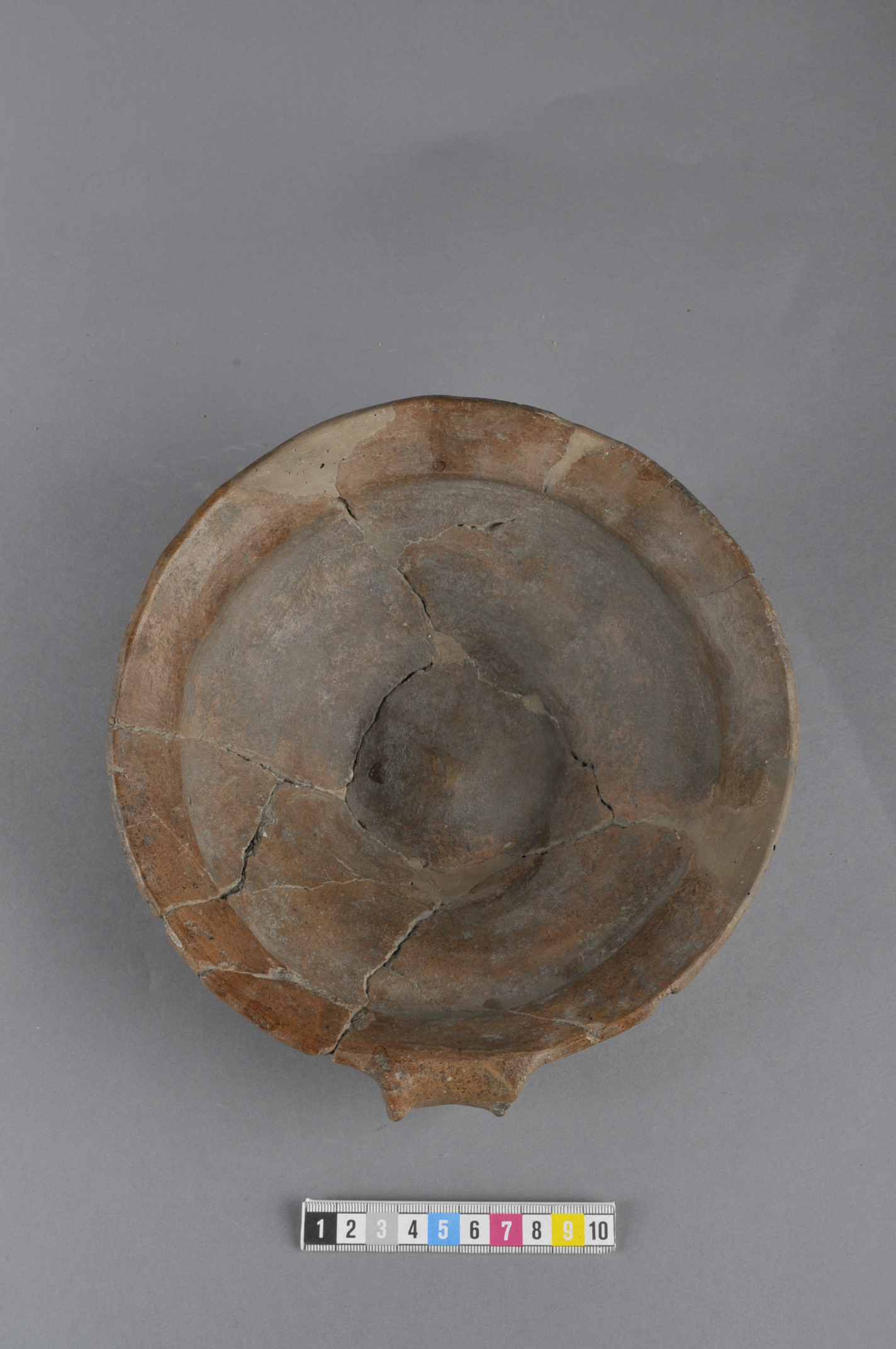 Nästintill intakt men rekonstruerad skål med bandformig hänkel. Godset är polerat. Botten lätt rundad och uppskjutande. Lock till urna