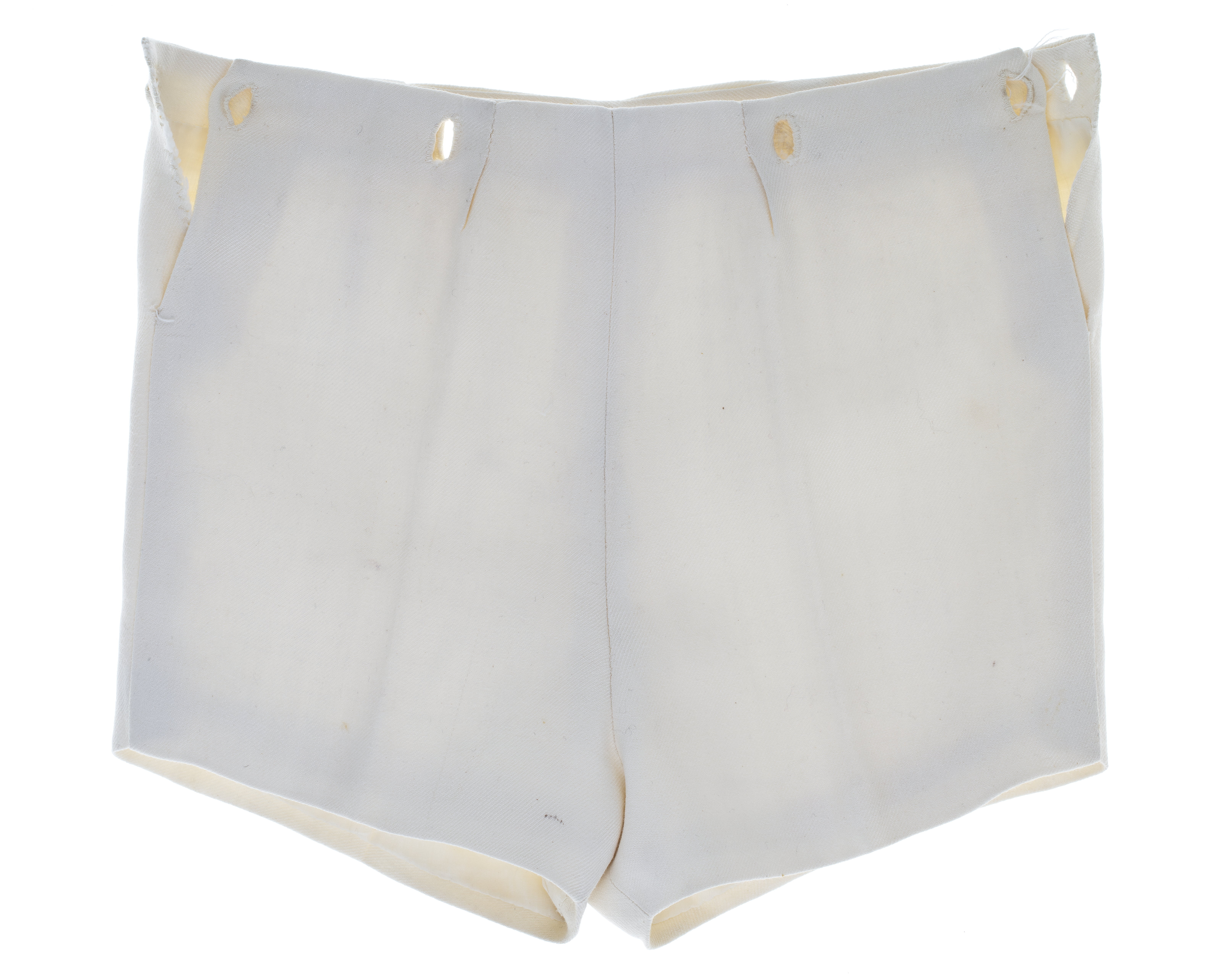 Kortbyxor till gosskostym av vitt ylle. Använd av Carl XVI Gustaf vid Gustaf V:s 90-årsdagsfirande 1948.