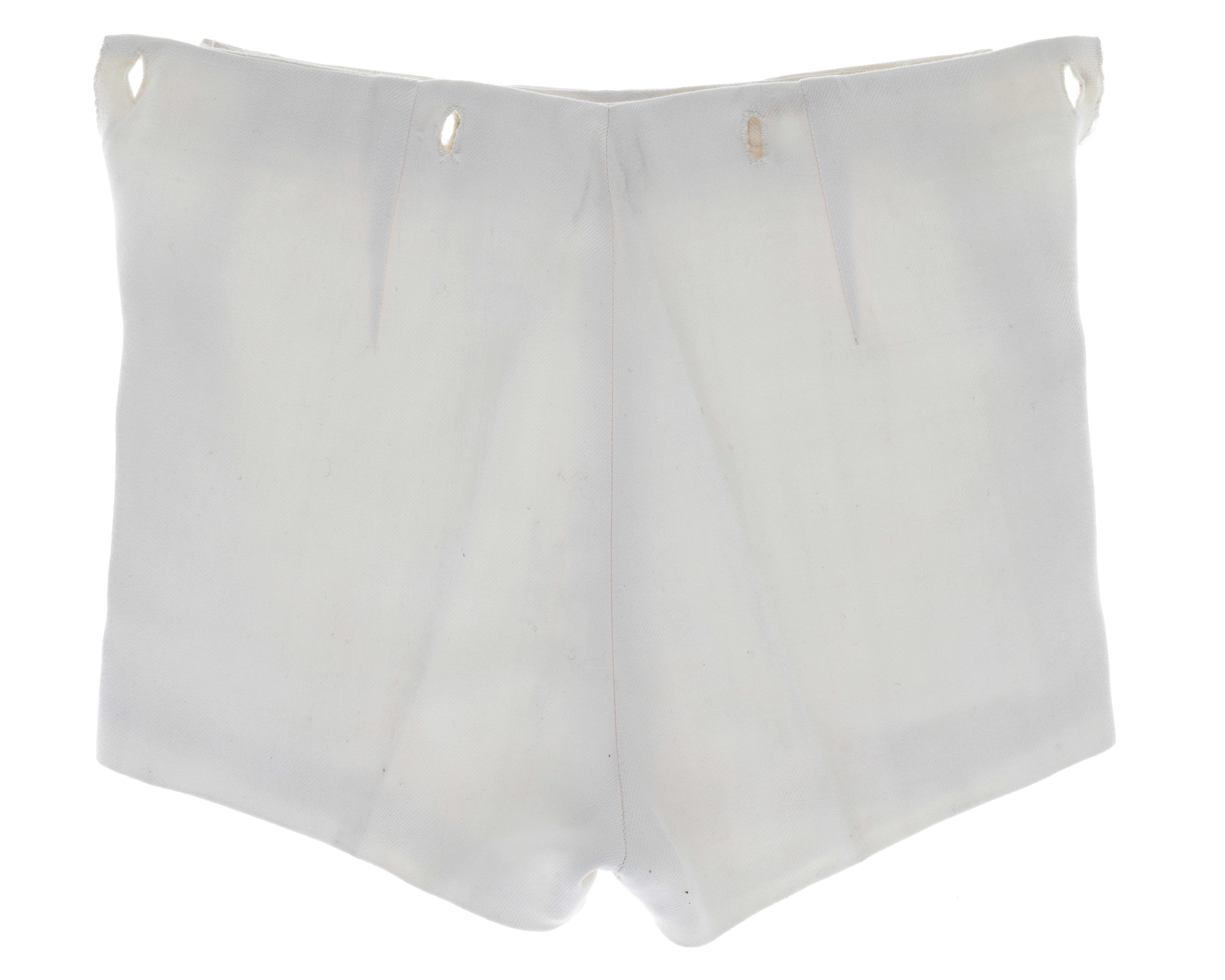 Korbyxor av vitt ylle med sprund i sidorna. I linningen åtta knapphål. Helt foder av tunn, vit bomull.