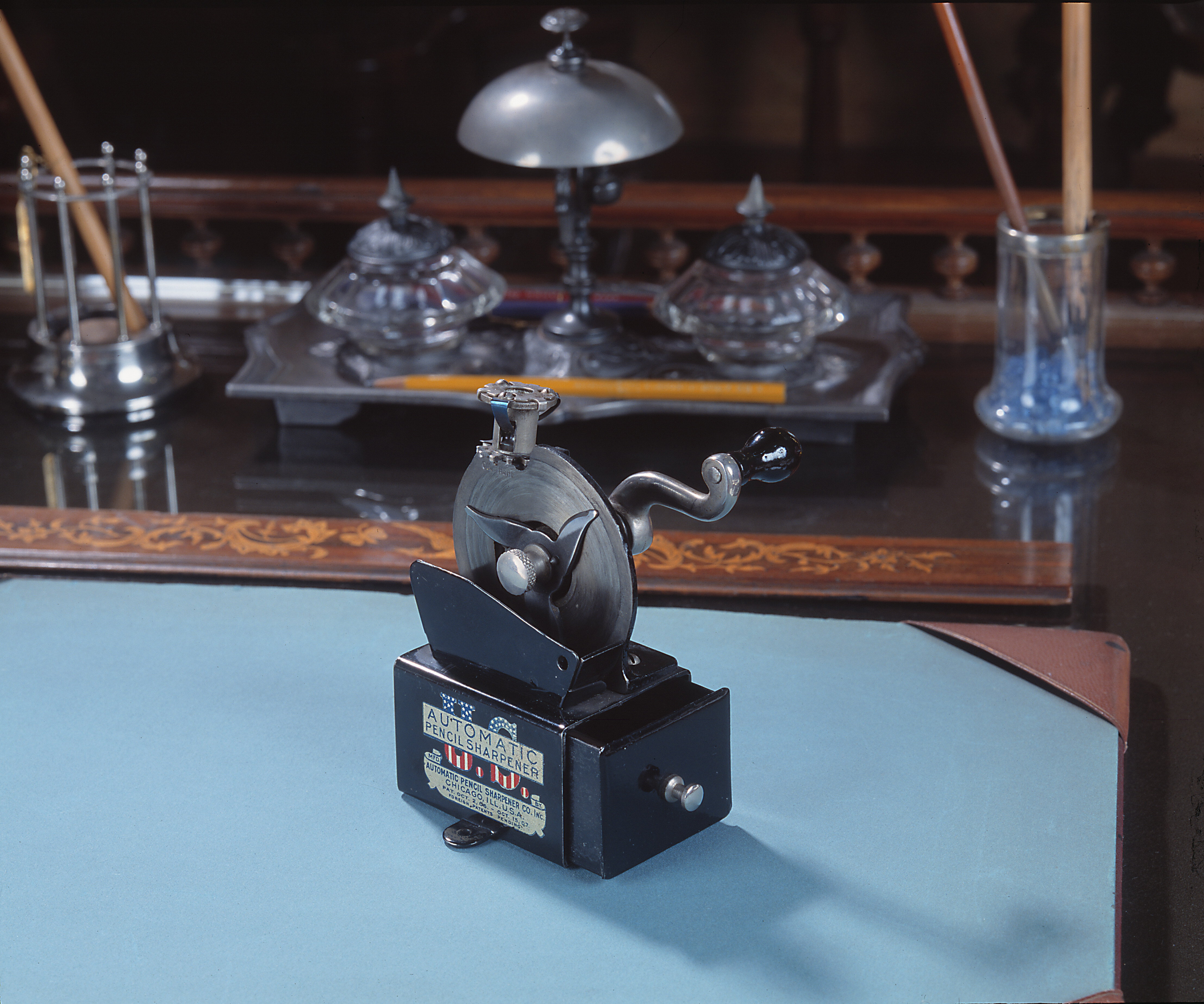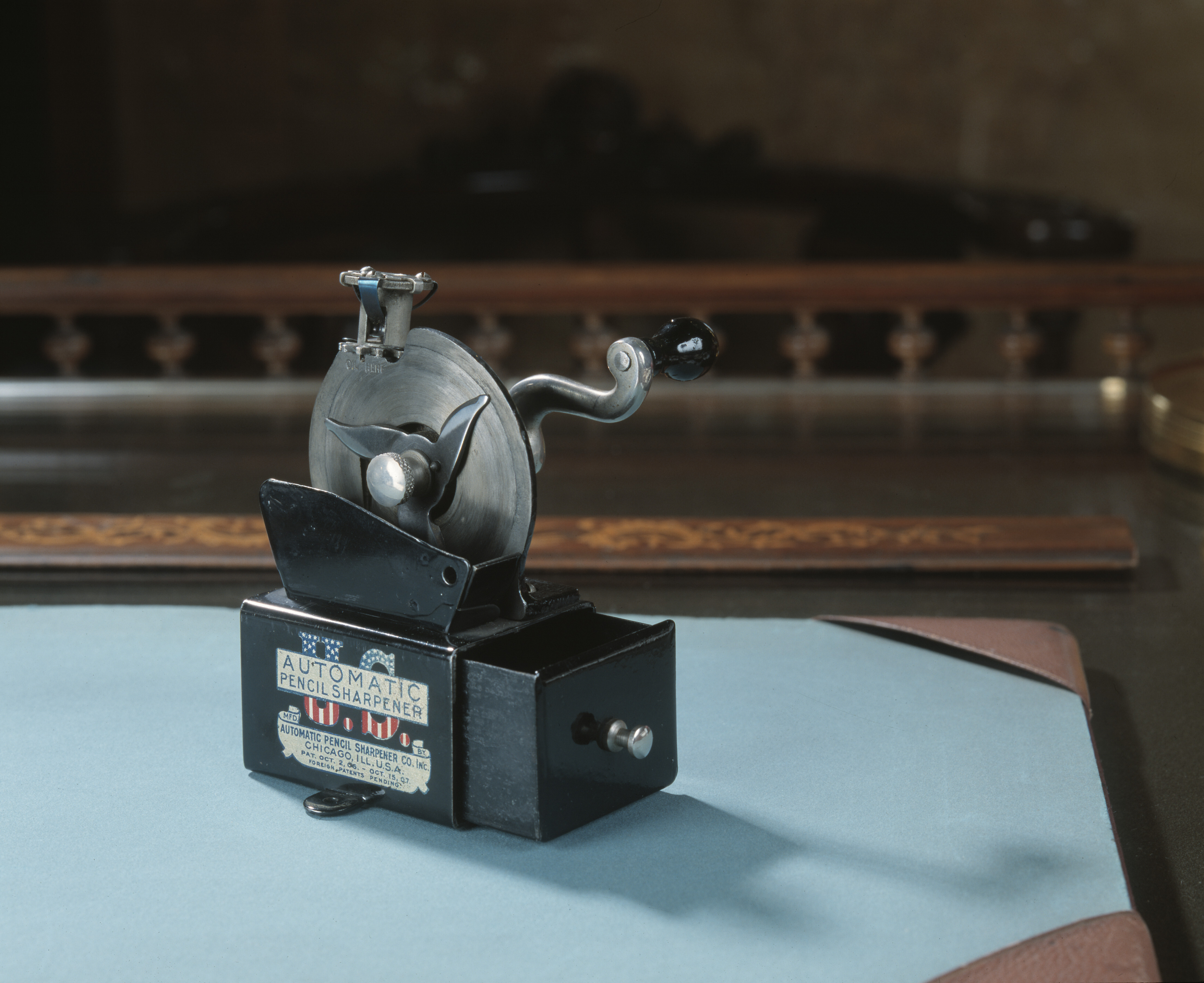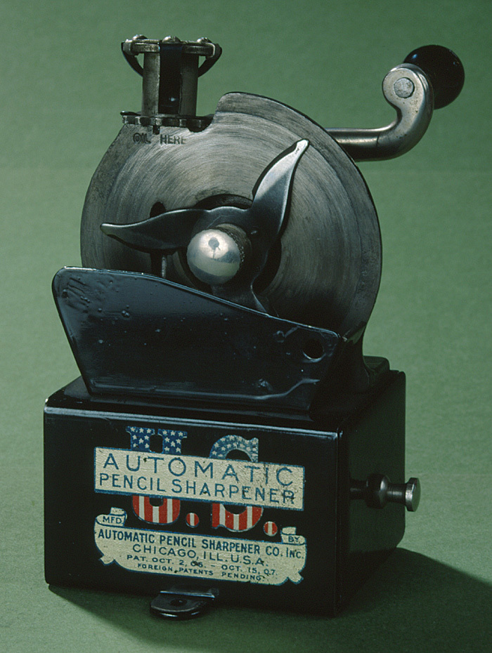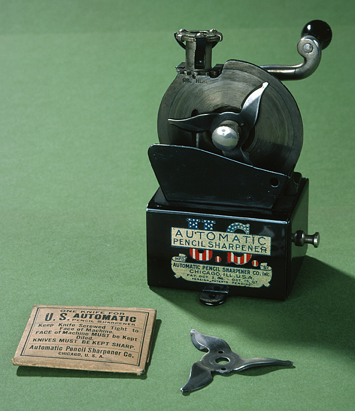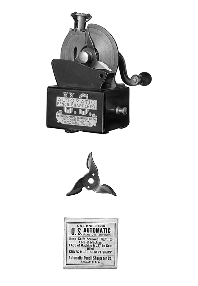Bestående av ett rektangulärt stativ, vari en från ena ändan skjutbar låda med utanpågående framstycke, i detta en svarvad knopp i blankt; från stativets nederkant utgående åt vardera sidan ett halvrunt skruvfäste; på framsidan i blått mot botten i guld: AUTOMATIC PENCIL SHARPENER, bakom guldbotten U. S. med endast övre och nedre delarna synliga, de förra blåa med vita stjärnor, de senare med vita och röda strimmor; därunder i blått mot botten i guld: MFD. BY AUTOMATIC PENCIL SHARPENER CO. INC. ILL. U. S. A. PAT. OCT. 2. 06.-OCT. 15. 07. FOREIGN PATENTS PENDING: Ovanpå stativet en kantställd skiva, fäst på en i vinkel utböjd fotskiva med två kullriga skruvar. På skivans framsida i mitten en på en axel rörlig klinga med tre stålformigt ställda blad med bågformig egg och spetsig udd. Klingan fäst vid axeländan medelst en skruv, varpå platt huvud på kärlformig hals,samt svängbar medels en på axelns motsatta ända befintlig vev med S-formad arm i blankt och svart päronformigt handtag. På skivans baksida framför axeln en hylsa (för blyertspennan), vilken automasiskt vrides genom en i hylsans övre ända befintlig muff, påverkad av klingans bladspetsar, vilka gripa i en kuggring kring muffens nedre ända; nedanför kuggringen skifkanten ett fyrsidigt smörjhål, under detta inslaget (orig. 1/2): OIL HERE På framsidan framför klingan en rakt uppstående plåtskärm till skydd mot avfallet, som samlas i stativlådan. Då pennan skall formeras, nedskjutes den i hylsan, varpå klingan drages runt. Klingor: Båda som den förut beskrivna; vardera i omslag av tjockt vitt papper, varpå tryckt i svart i tre avdelningar, i den övre: ONE KNIFE FOR U. S. AUTOMATIC PENCIL SHARPENER; i mellersta avdelningen: Keep Knife Screwed Tight to Face of Machine. FACE of Machine MUST be Kept Oiled. KNIVES MUST BE KEPT SHARP; i den nedre avdelningen: Automatic Pencil Sharpener Co. CHICAGO. U. S. A. Tillhört inventarierna på Wilhelmina von Hallwyls, f. Kempe, privata kontor, inrymt i Hamngatan 4, Stockholm, 1921 - 1930.