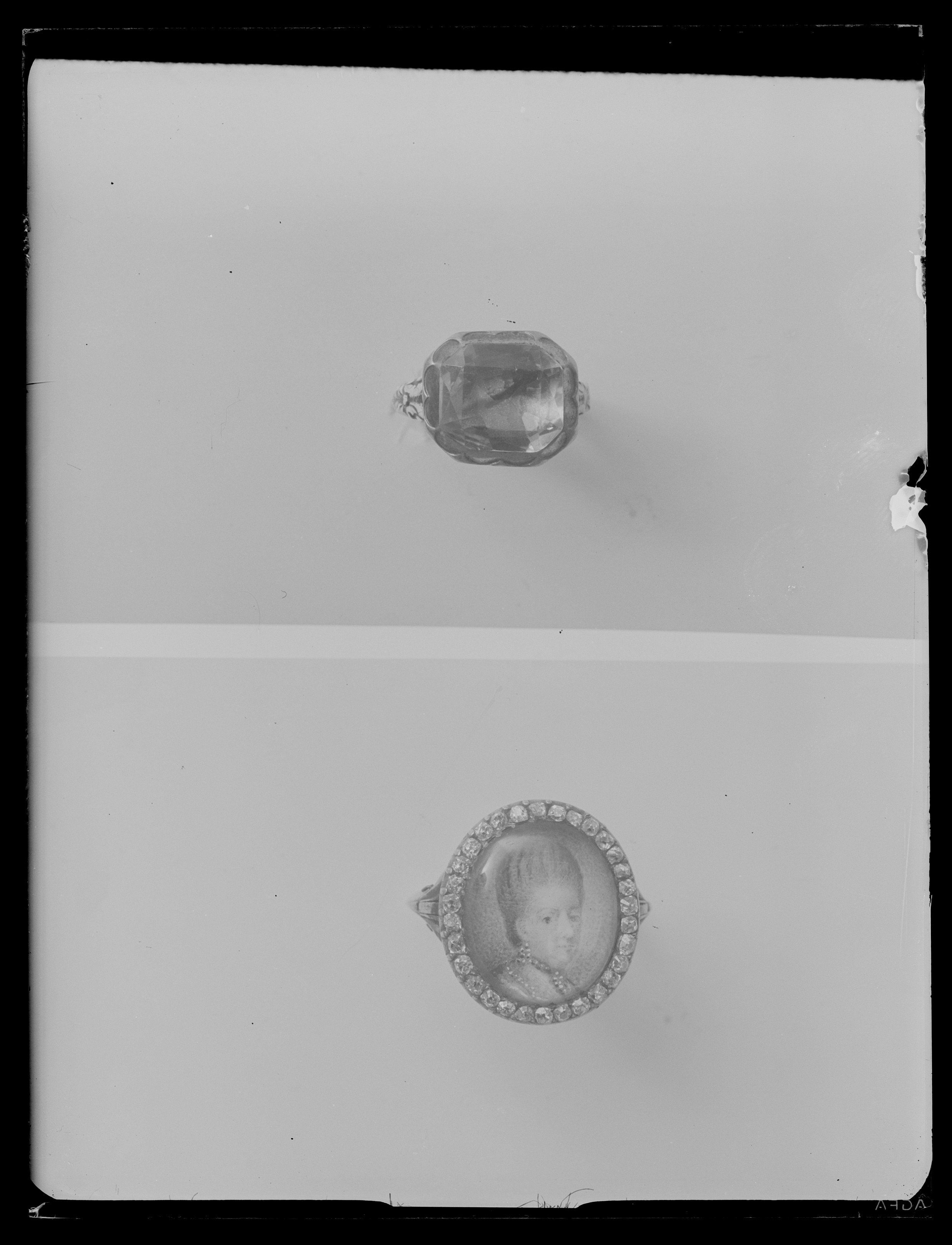 Fasettslipad, rektangulär, folierad bergkristall, avdeckt fattning av guld, fattningens baksida med breda fasade kanter, därpå stavformig dekor av svart emalj med vita emaljpärlor nertill. Ring med rak insida och välvd utsida, på delen närmast klacken rankdekor av svart och vit emalj.