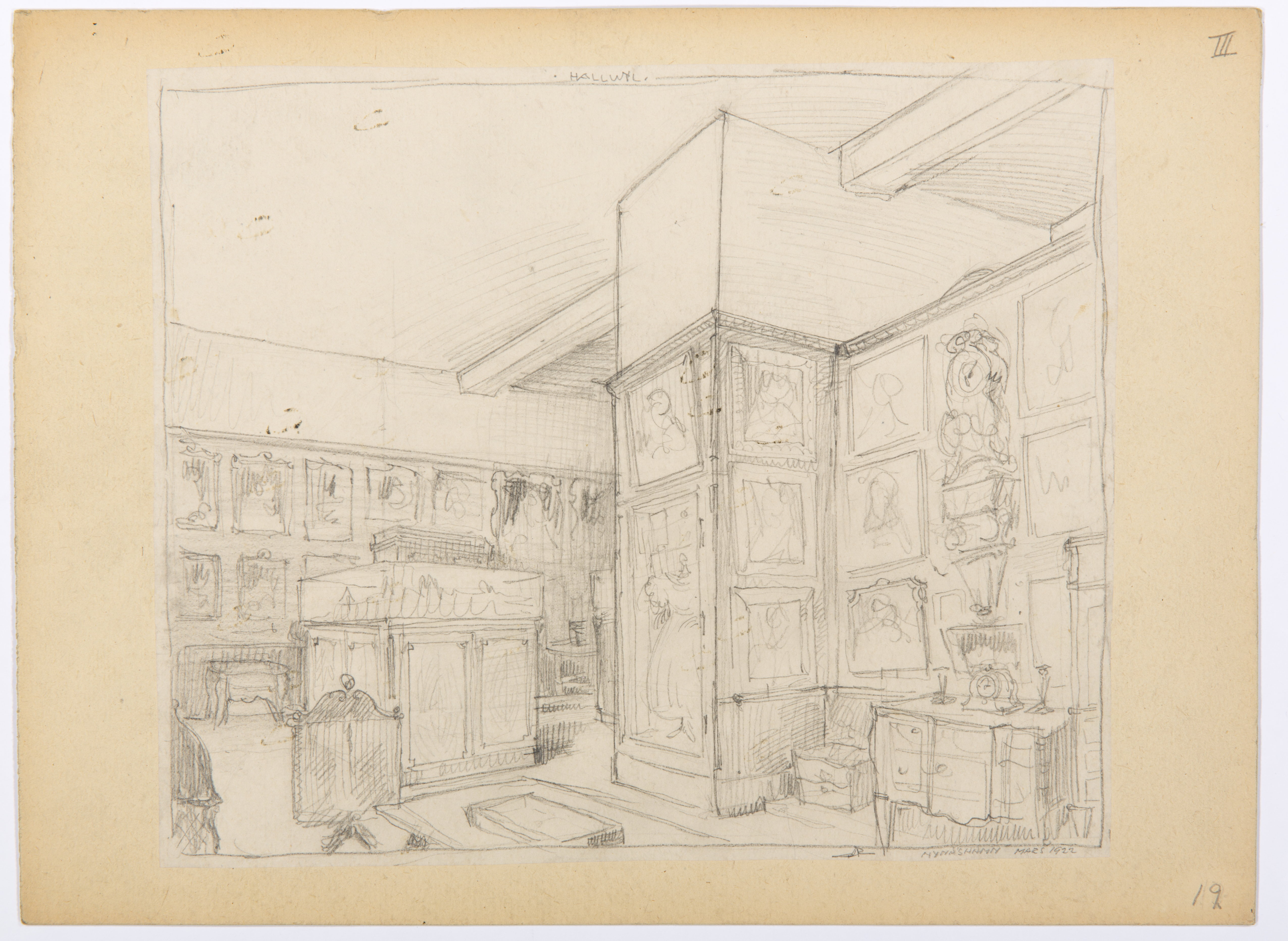 Hallwil-Zimmer, Landesmuseum, Zürich. Interiörer och planer för föremålens uppställning af Anders Roland. Blyertsskisser, en del färglagda med krita. På papper.