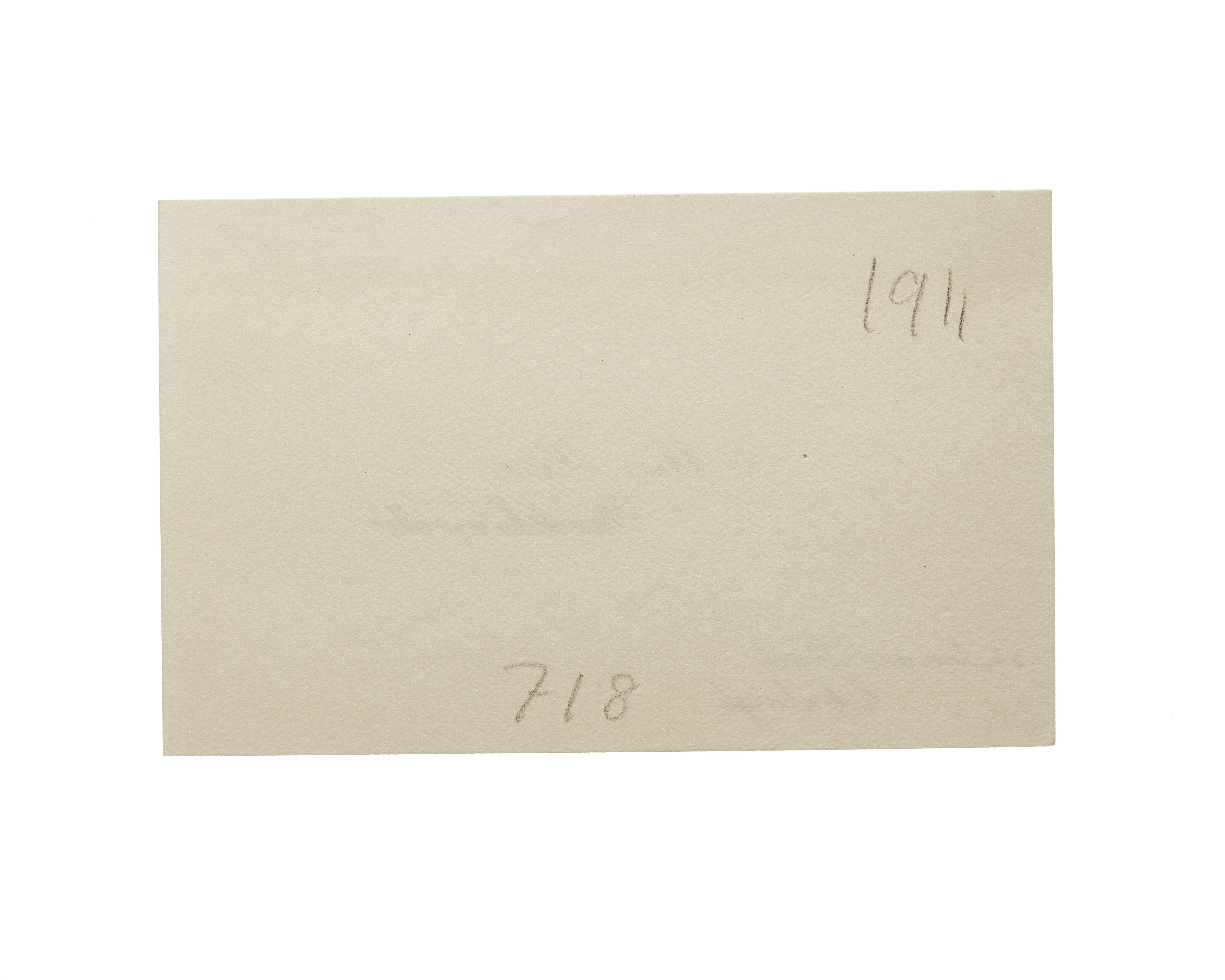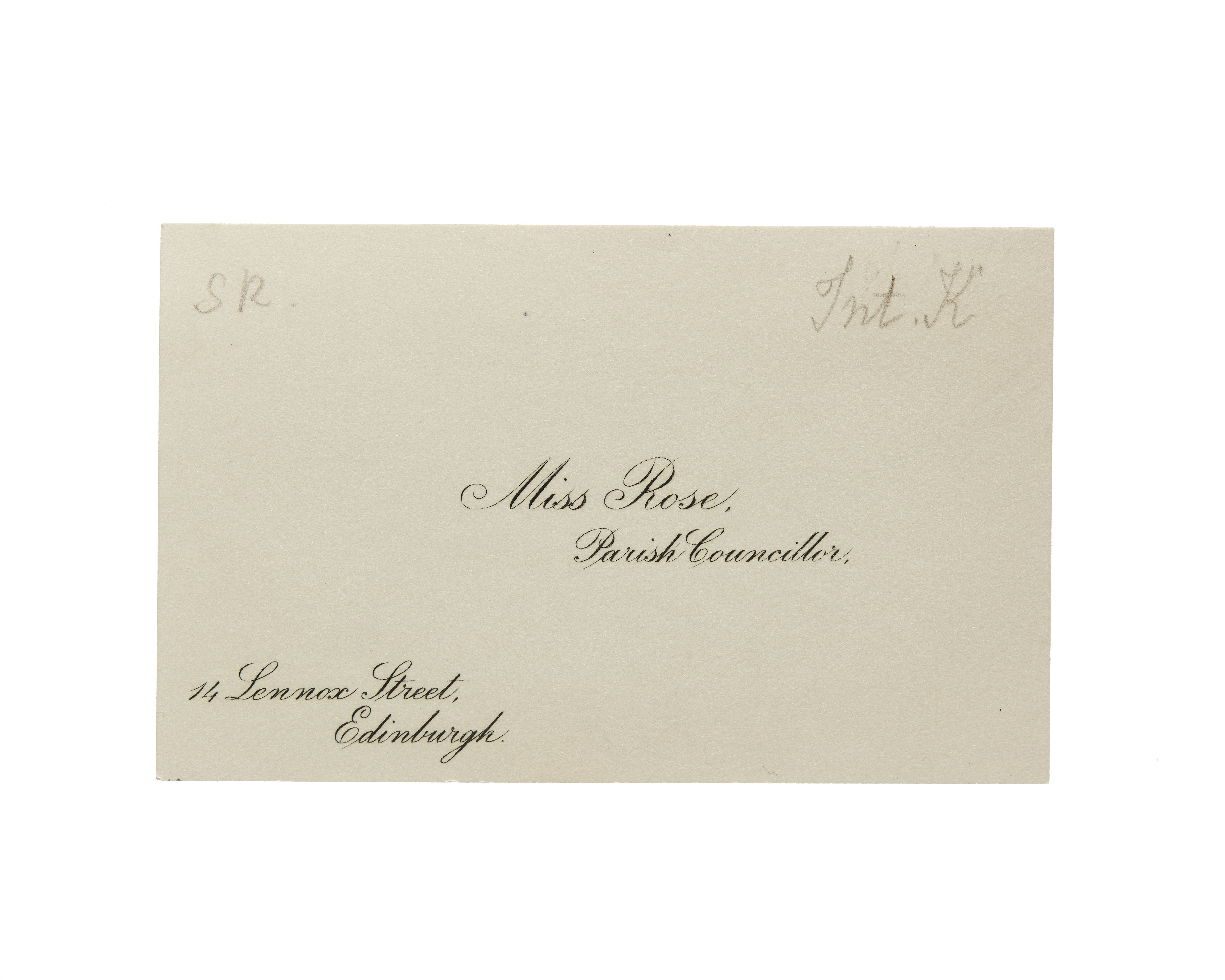 Ett visitkort från Miss Rose, Parish Councillor, daterat 1911. Adress (nedre vänstra hörnet) 14 Lennox Street, Edinburgh. Överlämnat i samband med Internationella kvinnoförbundets kongress i Stockholm 1911.