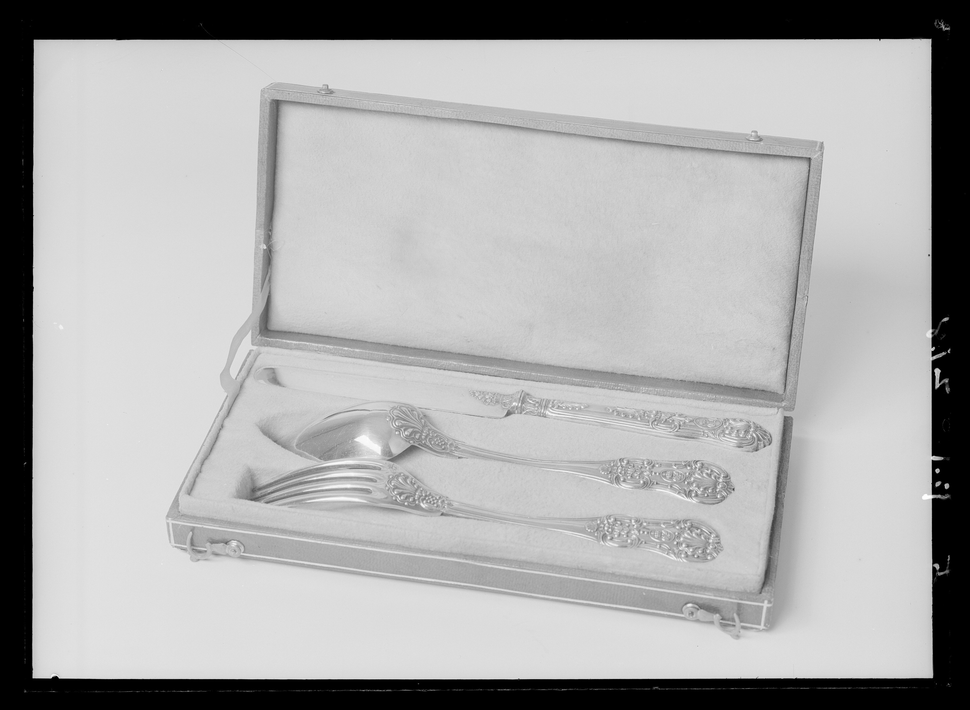 Gaffel helförgyllda och med inslaget monogram CJ under kunglig krona. Stämplar: Paris åttkantig finhetsstämpel, skäggigt manshuvud och L 1819-1838 - Paris garantistämpel, kvinnohuvud i cirkel. 1819-1838. Mästarstämpel: romb med krona, fembladig blomma och halvmåne samt namnet: CARDEILHAC. Dessutom stämplat tre insekter. Tillhörande lapp: Kuvert begagnat af Konung Carl Johan, på dess resor till Norrige.