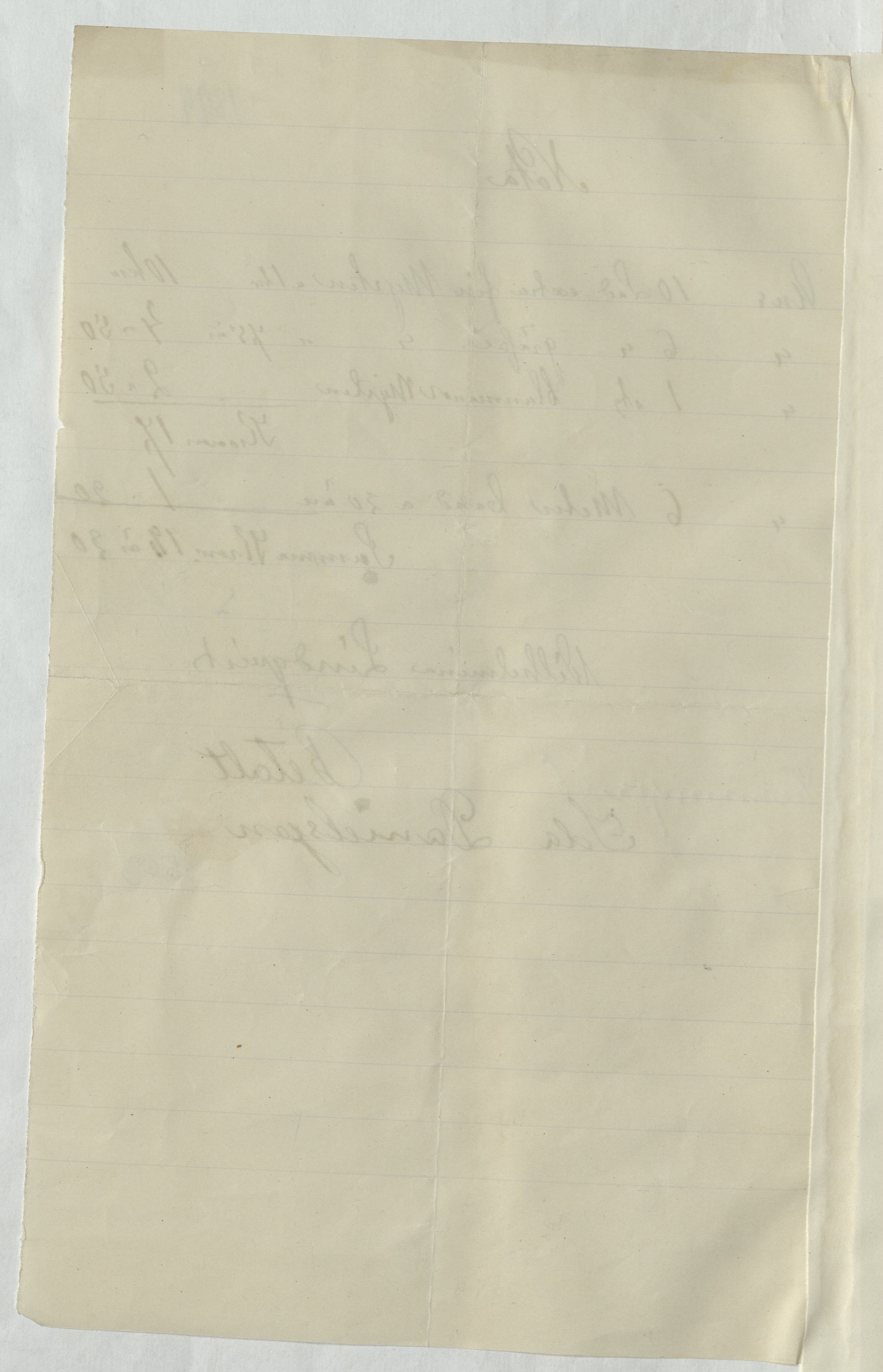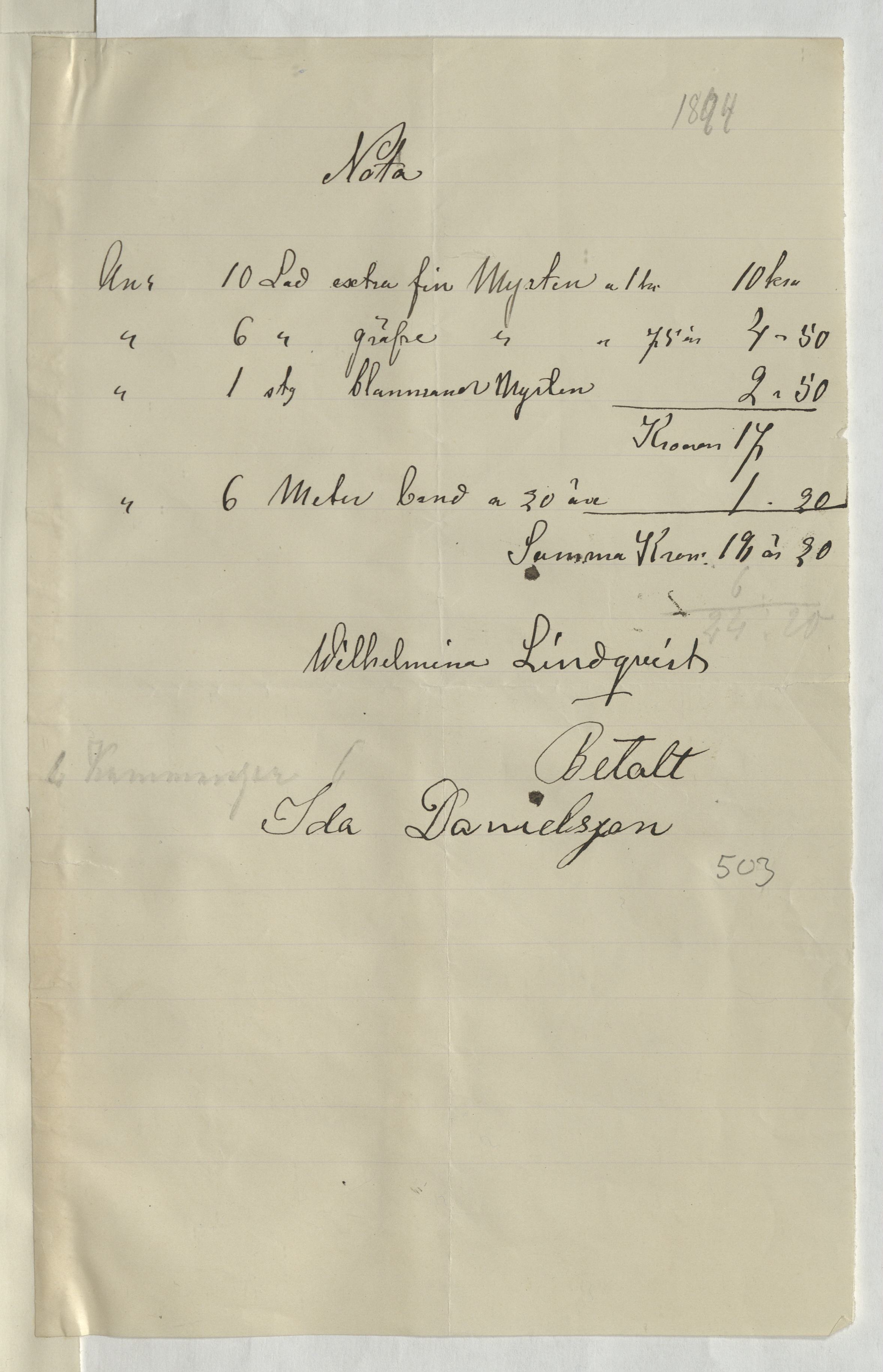 Kvitto från Wilhelmina Lindquist och Ida Danielsson. Gällande inköp av myrten och band.