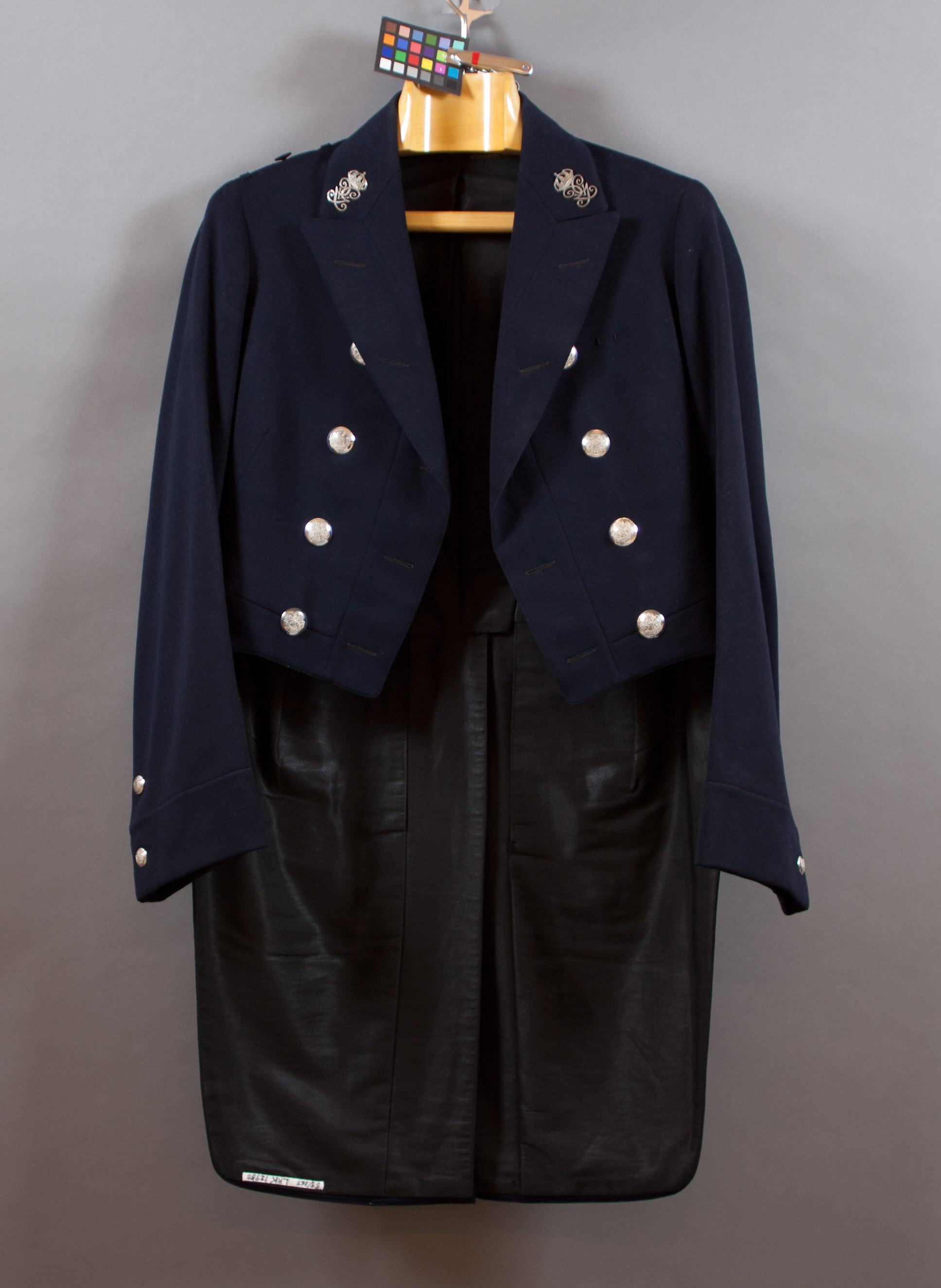 Frack av mörkblått kläde med fällkrage och två rader silverknappar,fyra i varje rad, d: 25 mm, med stora svenska riksvapnet samt i vardera framkanten fem knapphål. På kragen Gustav V:s namnchiffer i silver. På axlarna dubbla hällor samt sidenklädd knapp. Nedtill påärmarna 115 mm långa sprund med två silverknappar d: 17 mm. Delat skört med två knappar i livsömmen. På vardera skörtet påstickade ficklock med vardera tre knappar samt nedtill en knapp på vardera skört. Foder av svart merceriserad kyprat bomull. En innerficka med fastsydd firmaetikett: " F. SVEDBERG STOCKHOLM//KORNHAMNSTORG 47 // HerrKinnberg // Dato okt 1930." Vid hängaren etikett "F. SVEDBERG //STOCKHOLM // ST NYGATAN 47.